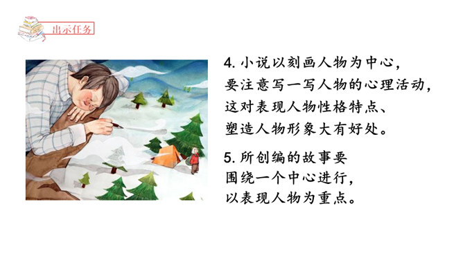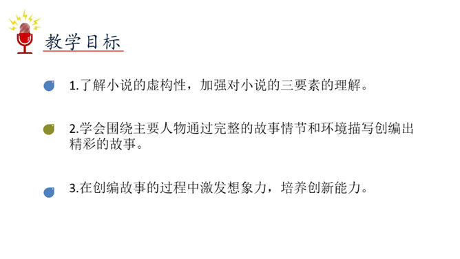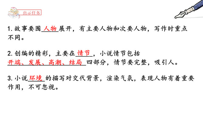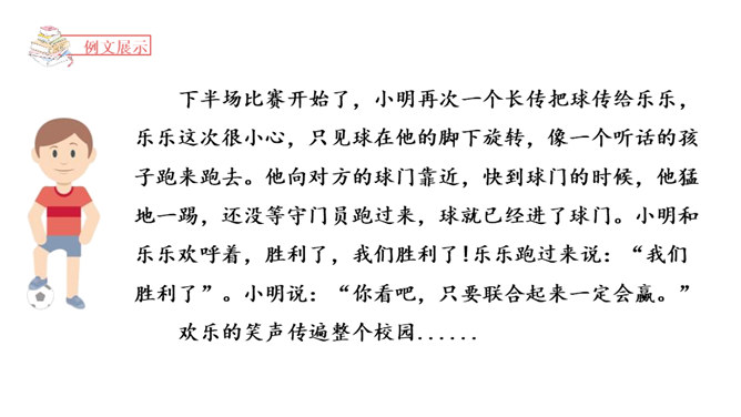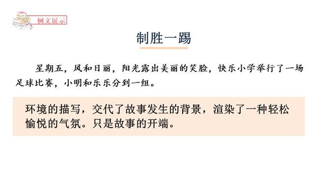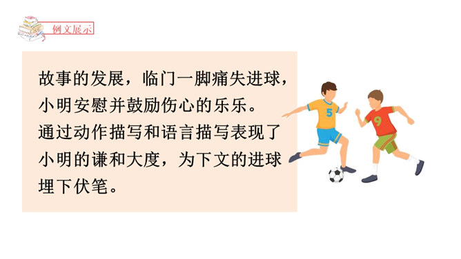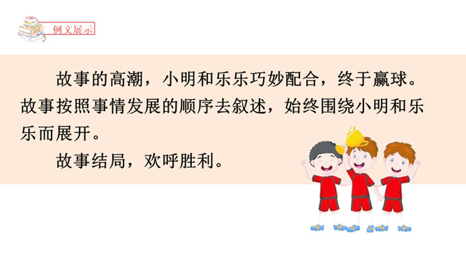 1.了解小说的虚构性,加强对小说的三要素的理解。2.学会围绕主要人物通过完整的故事情节和环境描写创编出精彩的故事。3.在创编故事的过程中激发想象力,培养创新能力。故事的发展,临门一脚痛失进球,小明安慰并鼓励伤心的乐乐。通过动作描写和语言描写表现了小明的谦和大度,为下文的进球埋下伏笔。故事的高潮,小明和乐乐巧妙配合,终于赢球。故事按照事情发展的顺序去叙述,始终围绕小明和乐乐而展开。所属专题:笔尖流出的故事ppt。