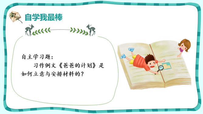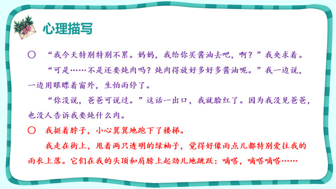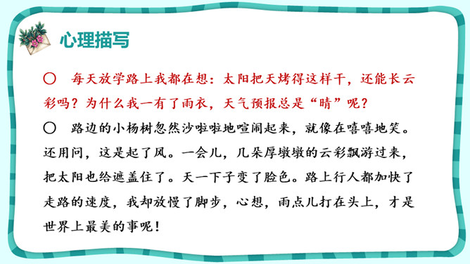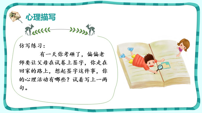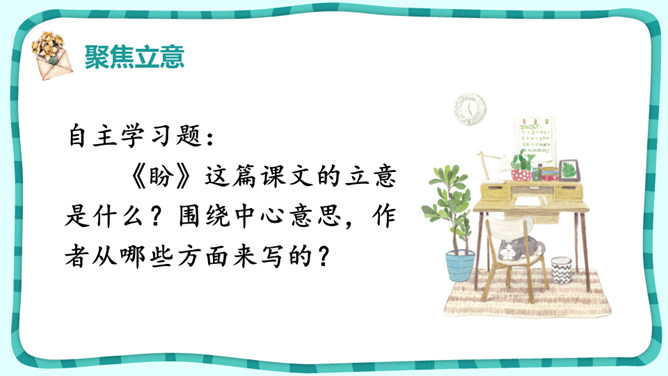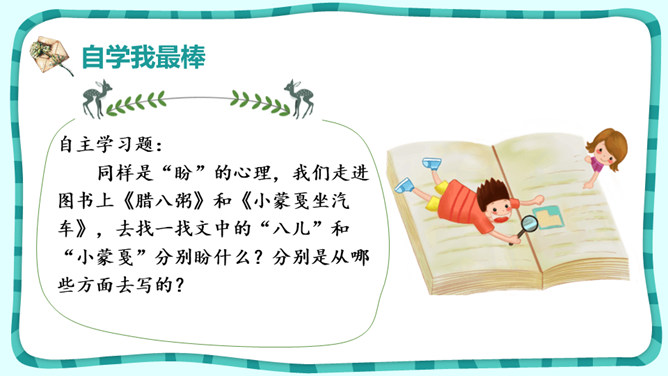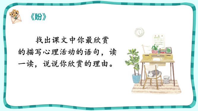 找出课文中你最欣赏的描写心理活动的语句,读一读,说说你欣赏的理由。仿写练习:有一天你考砸了,偏偏老师要让父母在试卷上签字,你走在回家的路上,想起签字这件事,你的心理活动有哪些?试着写上一两句。自主学习题:《盼》这篇课文的立意是什么?围绕中心意思,作者从哪些方面来写的?自主学习题:同样是“盼”的心理,我们走进图书上《腊八粥》和《小蒙戛坐汽车》,去找一找文中的“八儿”和“小蒙戛”分别盼什么?所属专题:盼ppt。