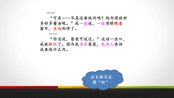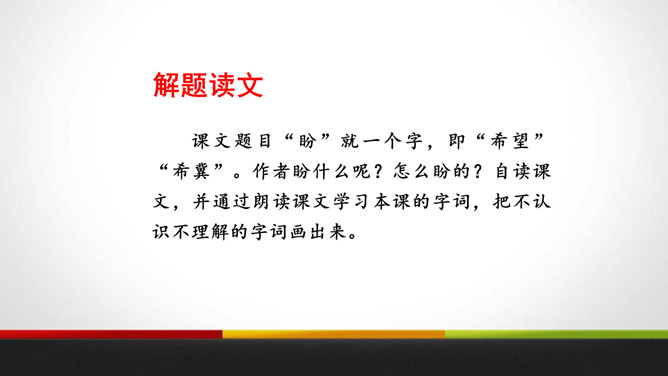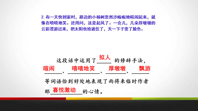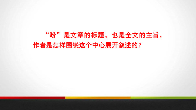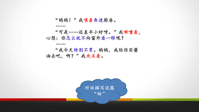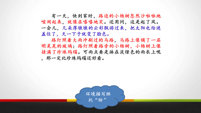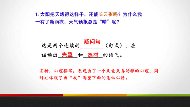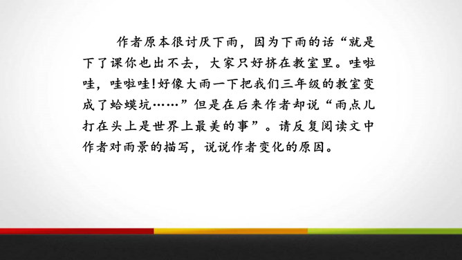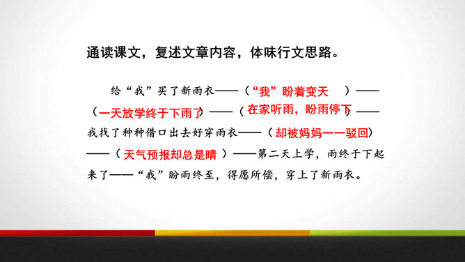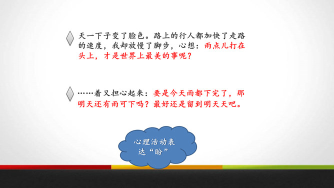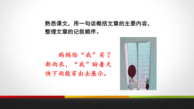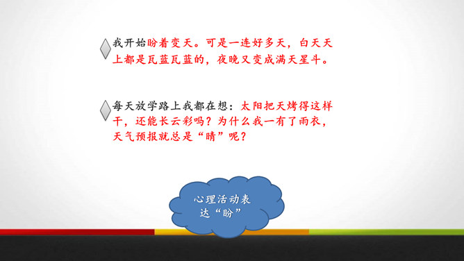 熟悉课文,用一句话概括文章的主要内容,整理文章的记叙顺序。妈妈给“我”买了新雨衣,“我”盼着天快下雨能穿出去展示。“盼”是文章的标题,也是全文的主旨,作者是怎样围绕这个中心展开叙述的?作者通过语言、动作、心理、环境等描写刻画了一个纯真可爱的小女孩形象。作者原本很讨厌下雨,因为下雨的话“就是下了课你也出不去,大家只好挤在教室里。哇啦哇,哇啦哇!好像大雨一下把我们三年级的教室变成了蛤蟆坑……”但是在后来作者却说“雨点儿打在头上是世界上最美的事”。请反复阅读文中作者对雨景的描写,说说作者变化的原因。所属专题:盼ppt。