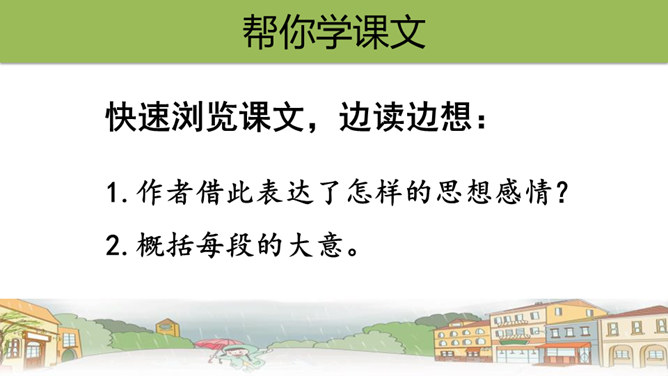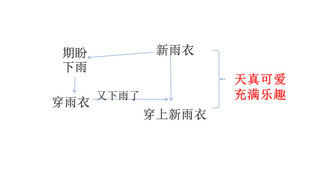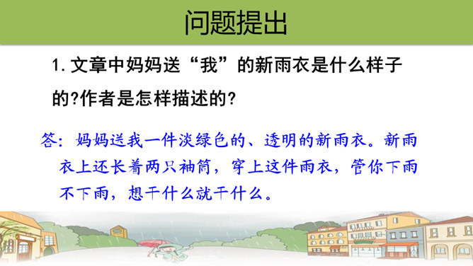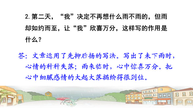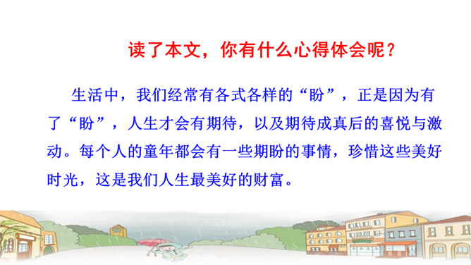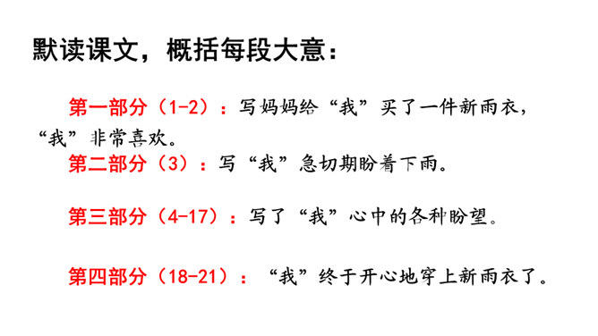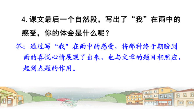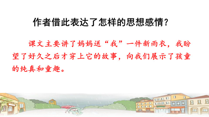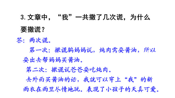 文章中,“我”一共撒了几次谎,为什么要撒谎?答:两次谎。第一次:撒谎骗妈妈说,炖肉需要酱油,所以要出去帮妈妈买酱油。第二次:撒谎说爸爸要吃炖肉。去外面买酱油的话,我就可以穿上“我”的新雨衣在雨里尽情地玩。表现了小孩子的天真可爱。课文最后一个自然段,写出了“我”在雨中的感受,你的体会是什么呢?答:通过写“我”在雨中的感受,将那种终于期盼到雨的喜悦心情展现了出来,也与文章的题目相照应,起到点题的作用。所属专题:盼ppt。