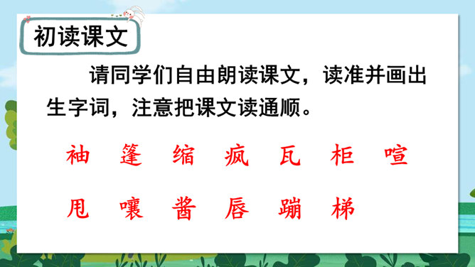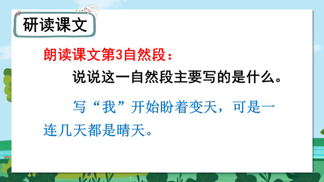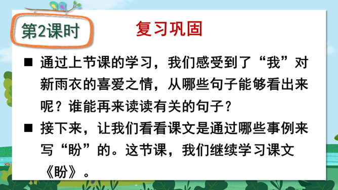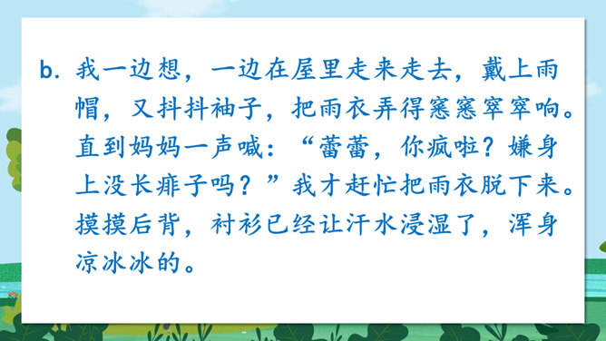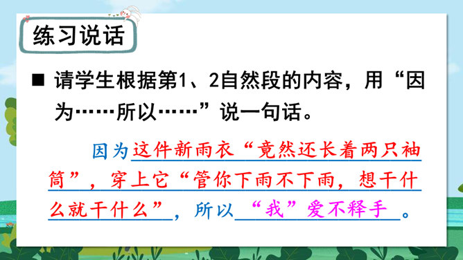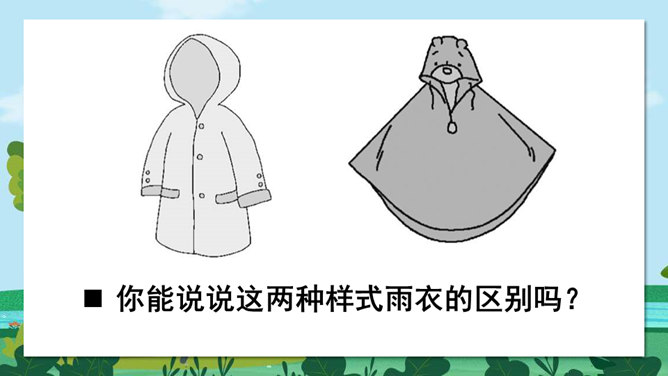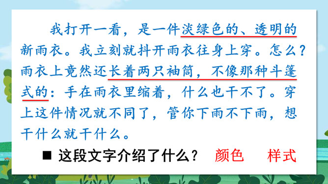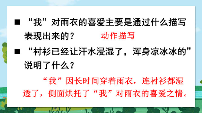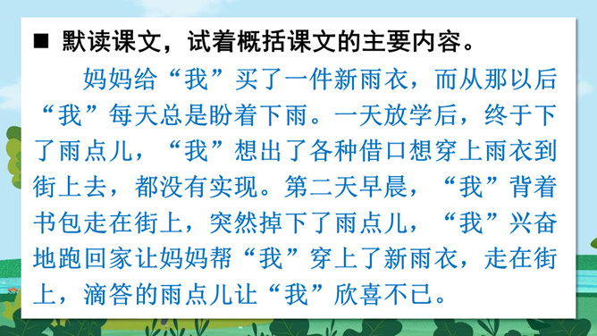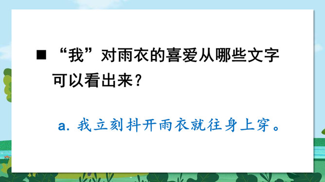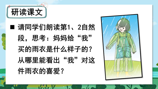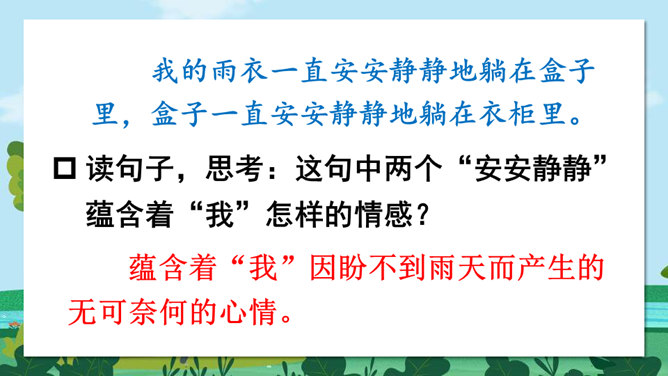 对于我们每一个人来说,童年生活是美好的、纯真的,童年的乐趣一定会深深印刻在我们的脑海中。童年时,我们的心底总藏着自己的一点点渴盼,渴盼着穿上漂亮的衣服,渴盼着好玩的玩具,渴盼着和妈妈外出游玩……请同学们朗读第1、2自然段,思考:妈妈给“我”买的雨衣是什么样子的?从哪里能看出“我”对这件雨衣的喜爱?“我”对雨衣的喜爱主要是通过什么描写表现出来的?读句子,思考:这句中两个“安安静静”蕴含着“我”怎样的情感?所属专题:盼ppt。