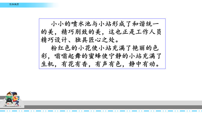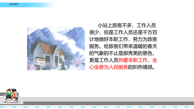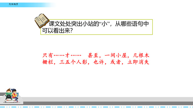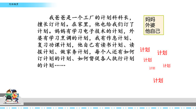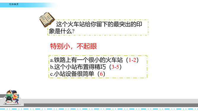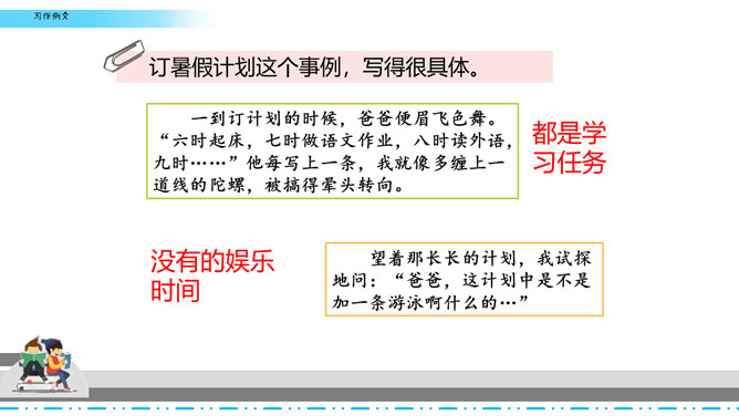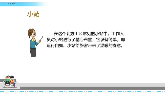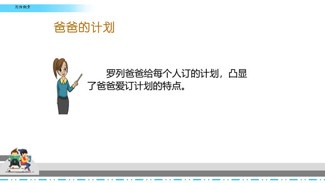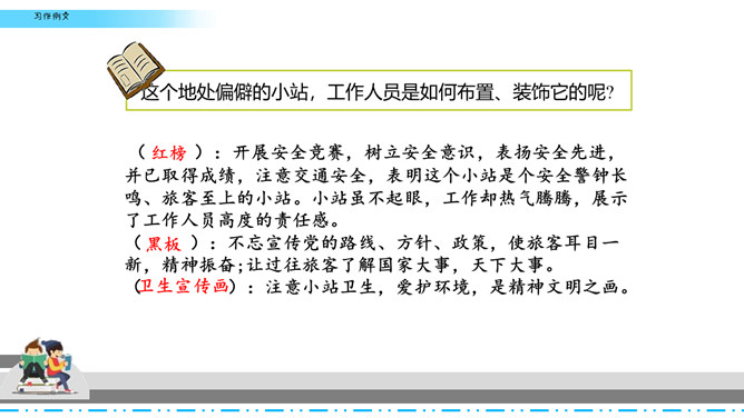 我们在读书的时候,是不是发现有很多作品中的人物给你留下了深刻的印象,或者精彩的故事情节令你感动。今天我们一起来欣赏两篇习作例文,看看会给你带来什么样的感受。罗列爸爸给每个人订的计划,凸显了爸爸爱订计划的特点。渴望有自己的一些自由,除了学习,小作者渴望有自己的娱乐时间。在这个北方山区常见的小站中,工作人员对小站进行了精心布置,它设备简单,却运行自如。小站给旅客带来了温暖的春意。所属专题:爸爸的计划小站ppt。