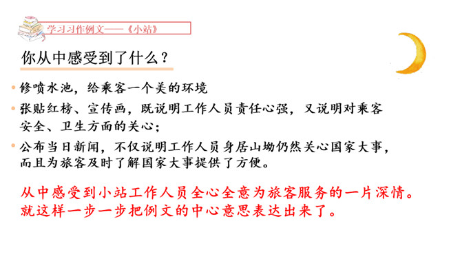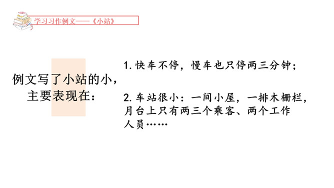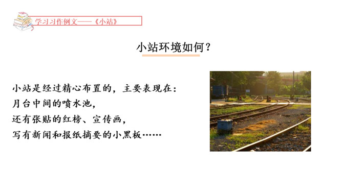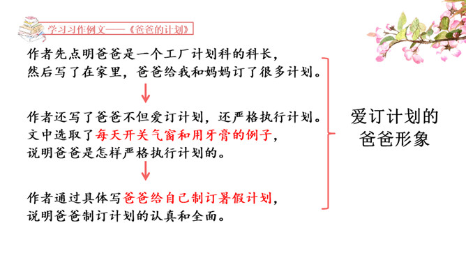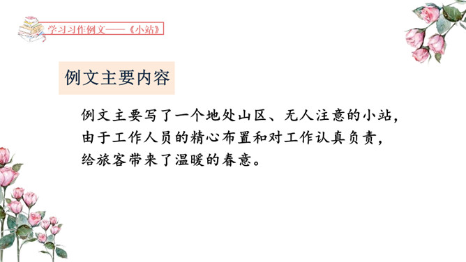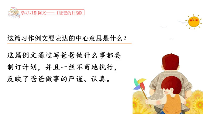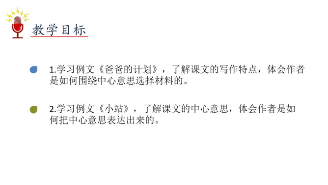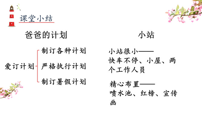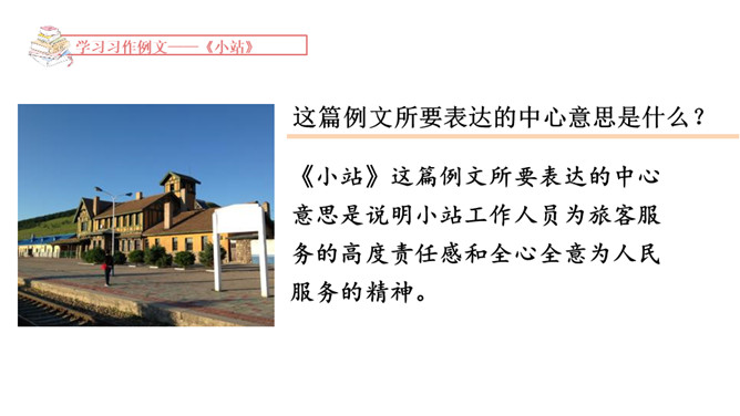 1.学习例文《爸爸的计划》,了解课文的写作特点,体会作者是如何围绕中心意思选择材料的。2.学习例文《小站》,了解课文的中心意思,体会作者是如何把中心意思表达出来的。这篇习作例文要表达的中心意思是什么?这篇例文通过写爸爸做什么事都要制订计划,并且一丝不苟地执行,反映了爸爸做事的严谨、认真。例文主要写了一个地处山区、无人注意的小站,由于工作人员的精心布置和对工作认真负责,给旅客带来了温暖的春意。所属专题:爸爸的计划小站ppt。
