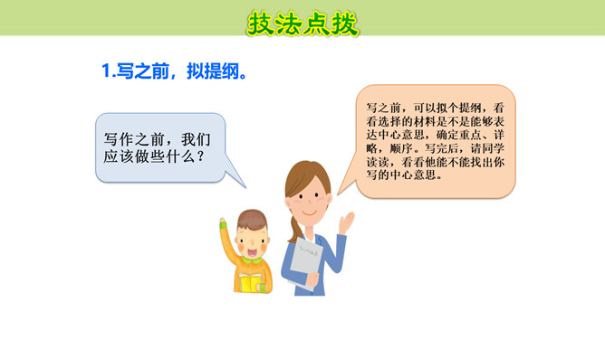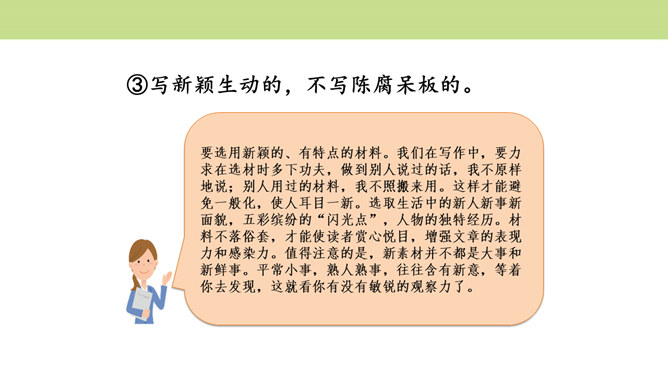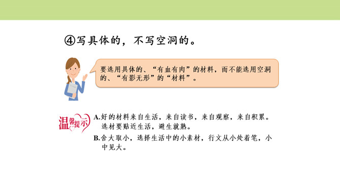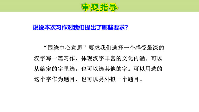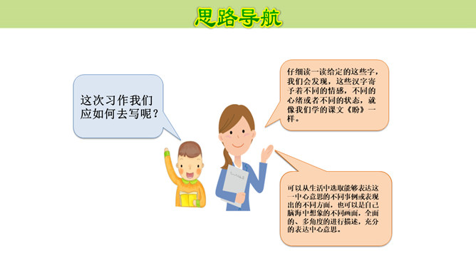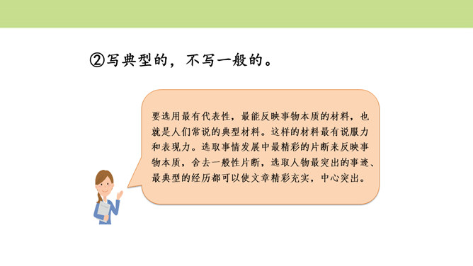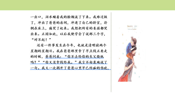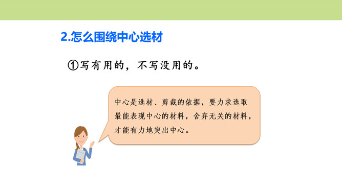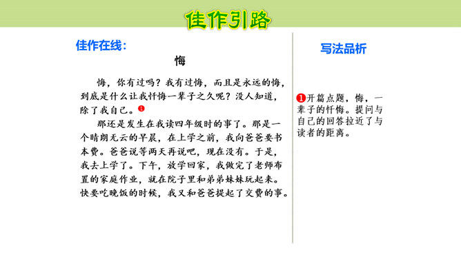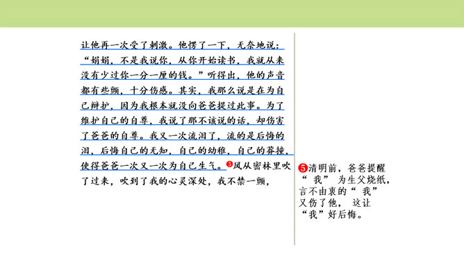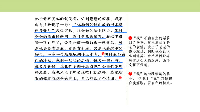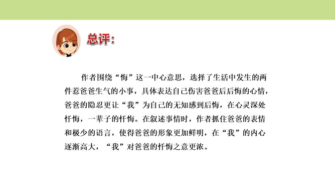 作者围绕“悔”这一中心意思,选择了生活中发生的两件惹爸爸生气的小事,具体表达自己伤害爸爸后后悔的心情,爸爸的隐忍更让“我”为自己的无知感到后悔,在心灵深处忏悔,一辈子的忏悔。在叙述事情时,作者抓住爸爸的表情和极少的语言,使得爸爸的形象更加鲜明,在“我”的内心逐渐高大,“我”对爸爸的忏悔之意更浓。可以从生活中选取能够表达这一中心意思的不同事例或表现出的不同方面,也可以是自己脑海中想象的不同画面,全面的、多角度的进行描述,充分的表达中心意思。所属专题:围绕中心意思写ppt。