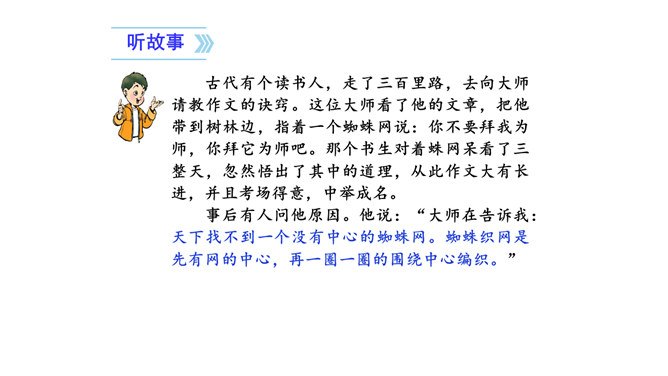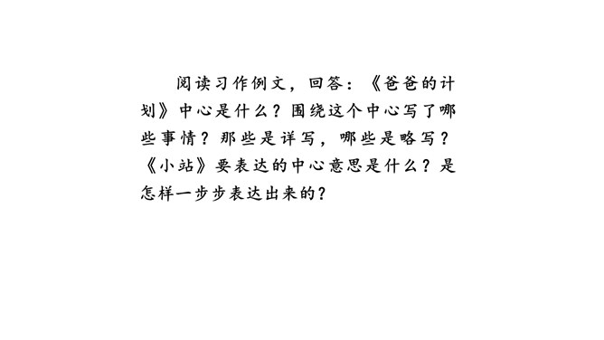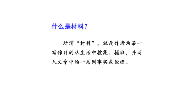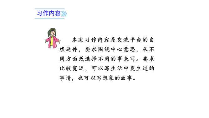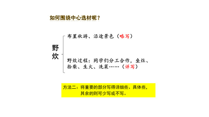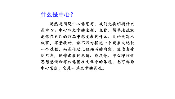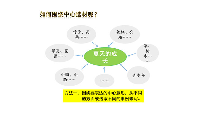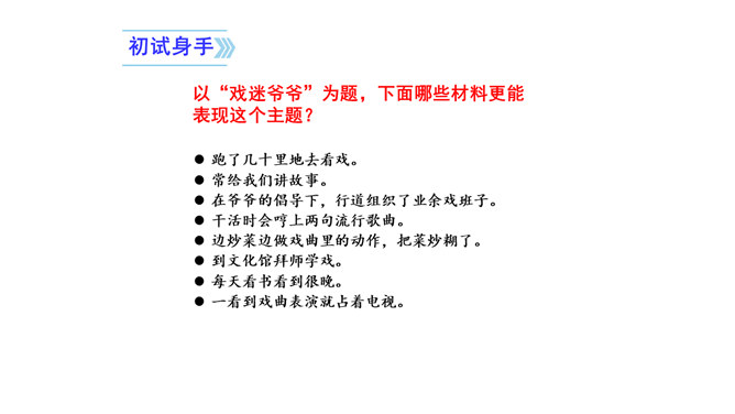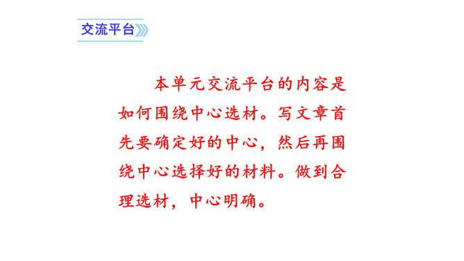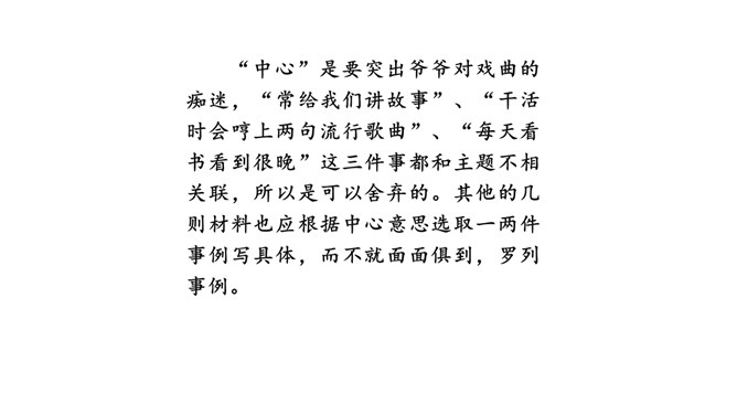 本单元交流平台的内容是如何围绕中心选材。写文章首先要确定好的中心,然后再围绕中心选择好的材料。做到合理选材,中心明确。“中心”是要突出爷爷对戏曲的痴迷,“常给我们讲故事”、“干活时会哼上两句流行歌曲”、“每天看书看到很晚”这三件事都和主题不相关联,所以是可以舍弃的。其他的几则材料也应根据中心意思选取一两件事例写具体,而不就面面俱到,罗列事例。所属专题:围绕中心意思写ppt。