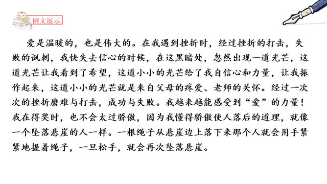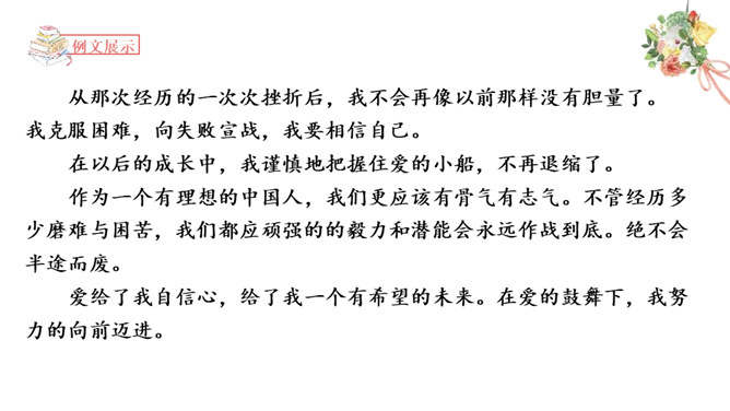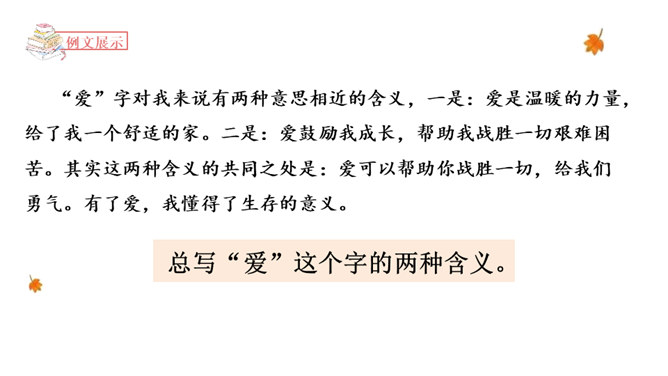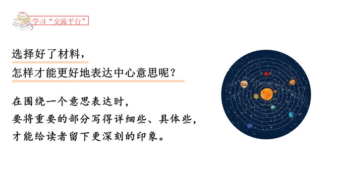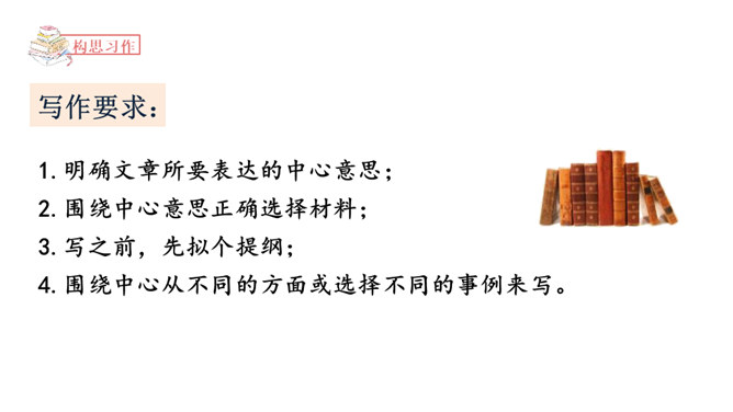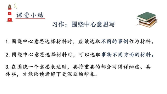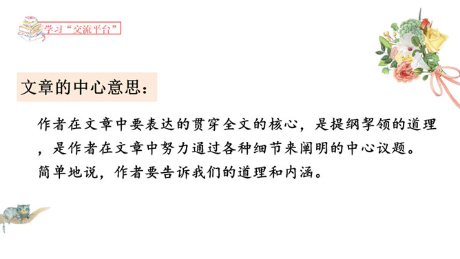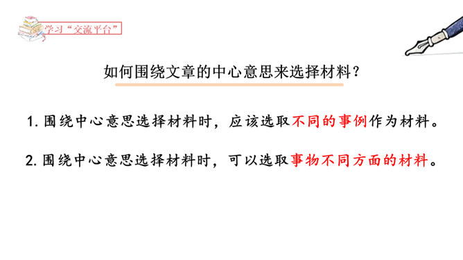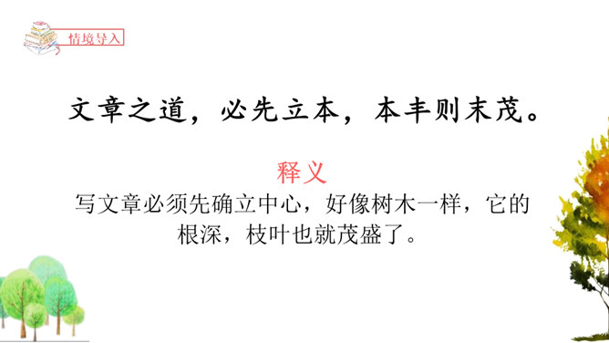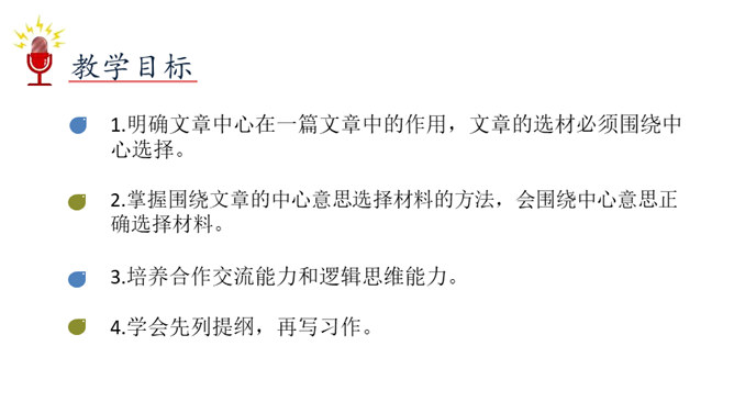 1.明确文章中心在一篇文章中的作用,文章的选材必须围绕中心选择。2.掌握围绕文章的中心意思选择材料的方法,会围绕中心意思正确选择材料。3.培养合作交流能力和逻辑思维能力。4.学会先列提纲,再写习作。写文章必须先确立中心,好像树木一样,它的根深,枝叶也就茂盛了。作者在文章中要表达的贯穿全文的核心,是提纲挈领的道理,是作者在文章中努力通过各种细节来阐明的中心议题。简单地说,作者要告诉我们的道理和内涵。所属专题:围绕中心意思写ppt。