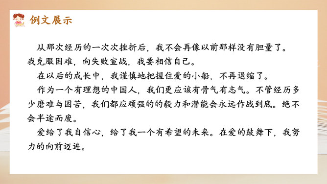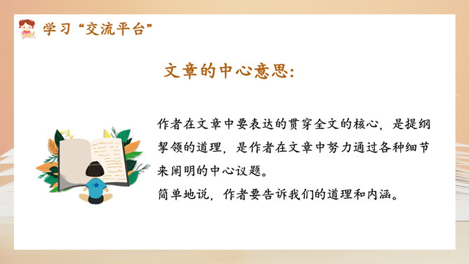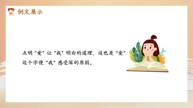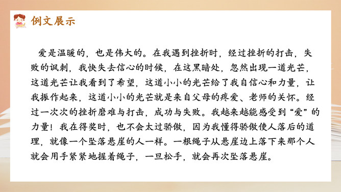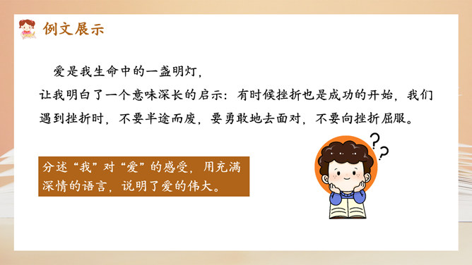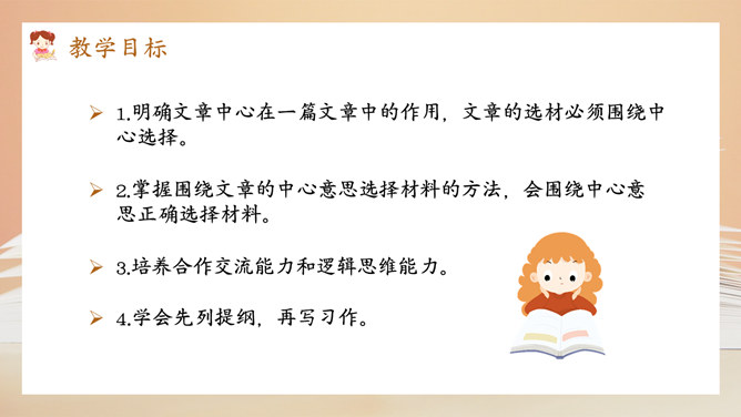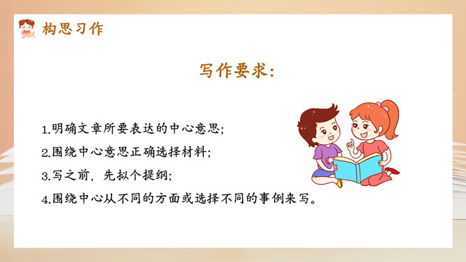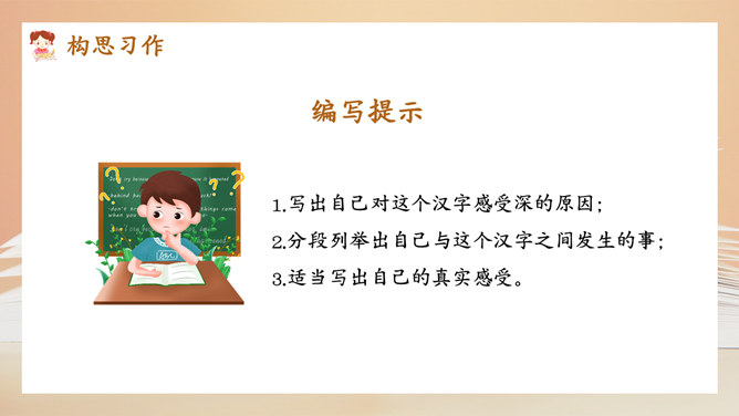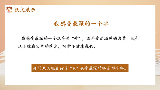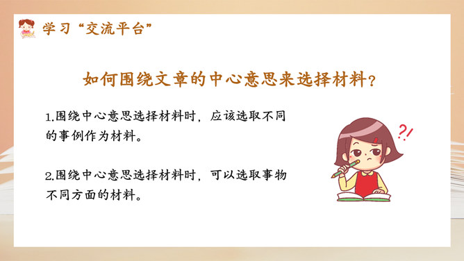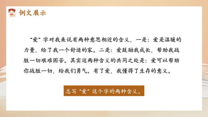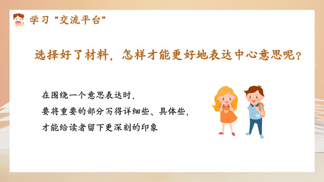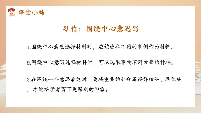 选择好了材料,怎样才能更好地表达中心意思呢?在围绕一个意思表达时,要将重要的部分写得详细些、具体些,才能给读者留下更深刻的印象。1.明确文章所要表达的中心意思;2.围绕中心意思正确选择材料;3.写之前,先拟个提纲;4.围绕中心从不同的方面或选择不同的事例来写。1.写出自己对这个汉字感受深的原因;2.分段列举出自己与这个汉字之间发生的事;3.适当写出自己的真实感受。所属专题:围绕中心意思写ppt。