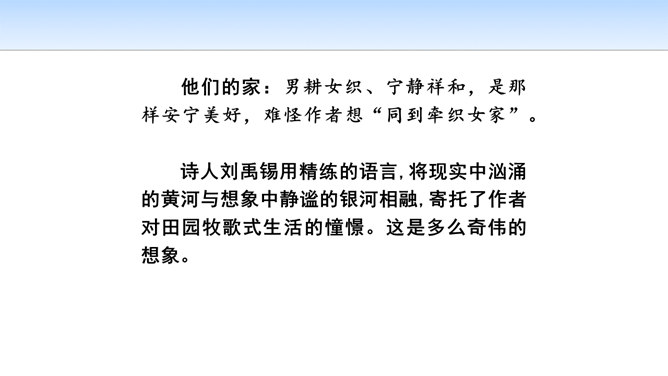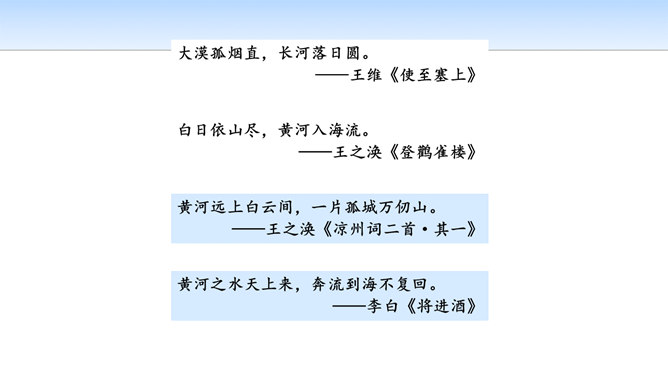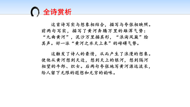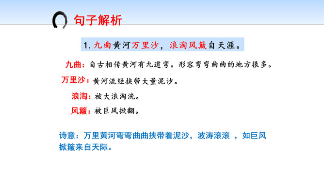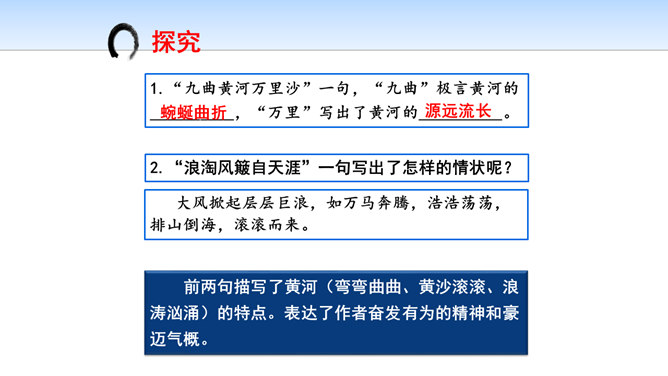 这首诗写实与想象相结合,描写与夸张相映照。前两句写实,描写了黄河奔腾万里的雄浑气势:“九曲黄河”,泥沙万里描其形,“浪淘风簸”绘其声。好一派“黄河之水天上来”的磅礴气势。这触发了诗人的豪情,从而产生了浪漫的想象。使他从黄河想到天边,想到天上的银河,想到隔河相望的牛郎、织女。后两句夸张地写黄河源远流长,给人留下无限的遐想和无穷的韵味。诗中描写了哪些景物?表达了作者怎样的思想感情?