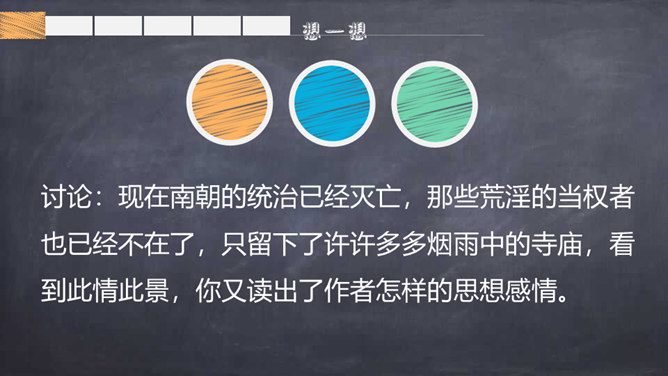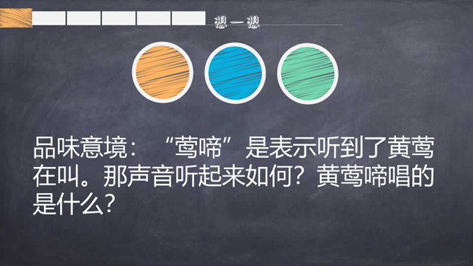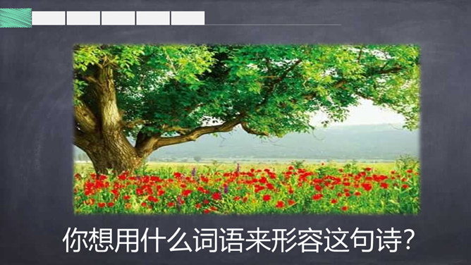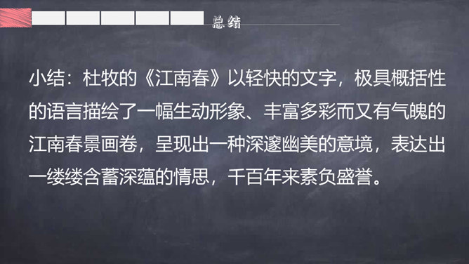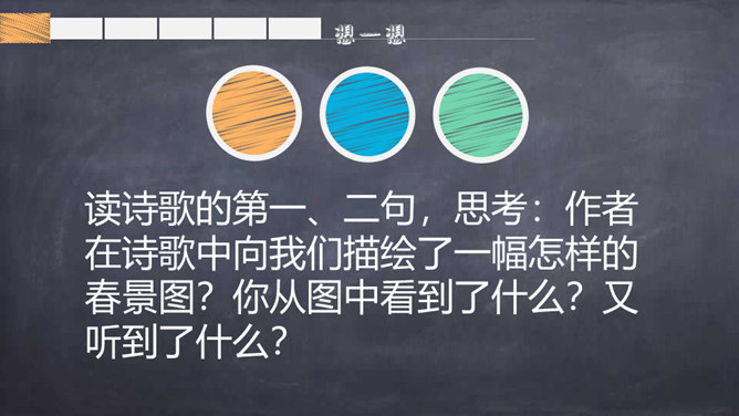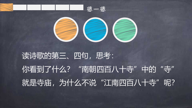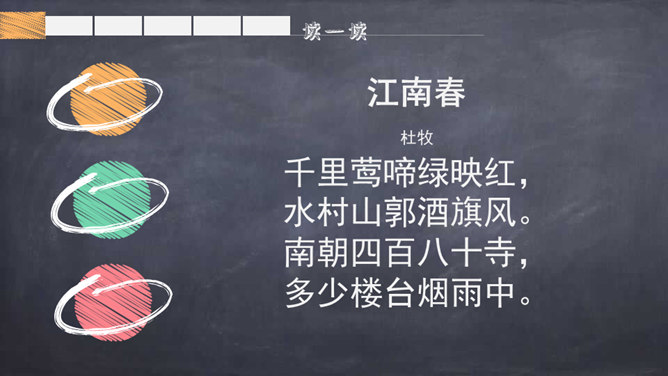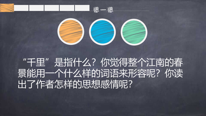背一背关于春天的古诗词。读了题目,你们知道了什么?读诗歌的第一、二句,思考:作者在诗歌中向我们描绘了一幅怎样的春景图?你从图中看到了什么?又听到了什么?品味意境:“莺啼”是表示听到了黄莺在叫。那声音听起来如何?黄莺啼唱的是什么?这一句你还看到了什么?哪里告诉你的?你想用什么词语来形容这句诗?你从第二句看到了什么?你见过酒旗吗?它是什么样子的?你觉得整个江南的春景能用一个什么样的词语来形容呢?所属专题:江南春ppt。