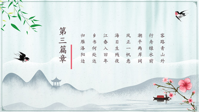 一套适合制作关于古诗《江南春》相关课件的幻灯片模板,设计精美淡雅简洁,以春天的桃花燕子等元素为背景。所属专题: