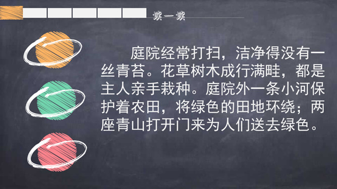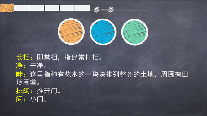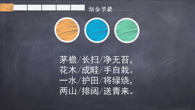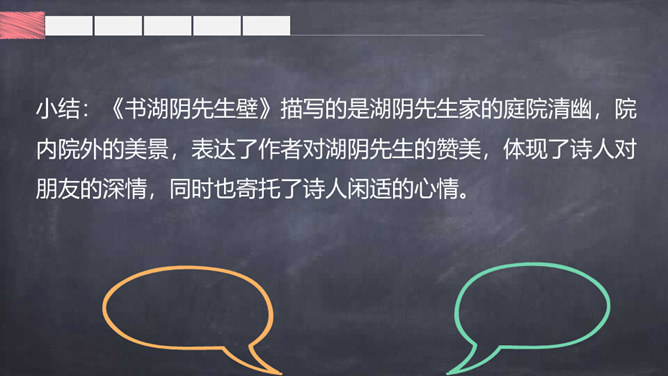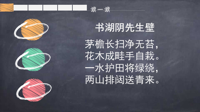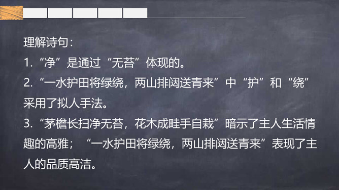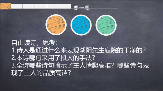 自学提示:自读自悟,借助工具书及注释,理解诗意,进而理解每句诗的意思。采用边读边画边批注的方式学习。自由读诗,思考:1.诗人是通过什么来表现湖阴先生庭院的干净的?2.本诗哪句采用了拟人的手法?3.全诗哪些诗句暗示了主人情趣高雅?哪些诗句表现了主人的品质高洁?理解诗句:1.“净”是通过“无苔”体现的。2.“一水护田将绿绕,两山排闼送青来”中“护”和“绕”采用了拟人手法。所属专题:书湖阴先生壁ppt。