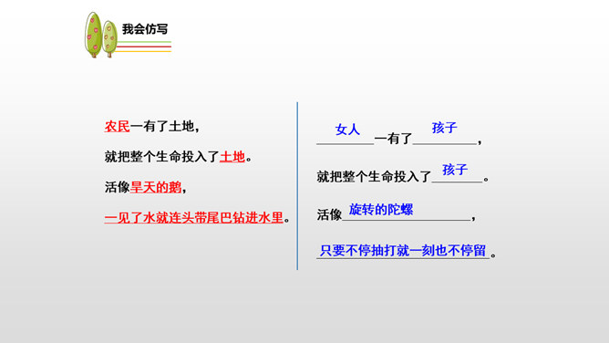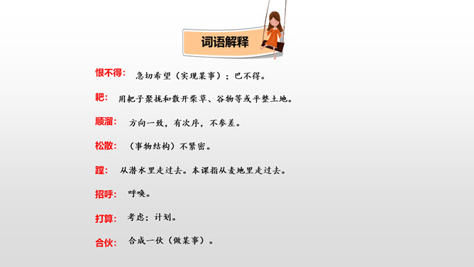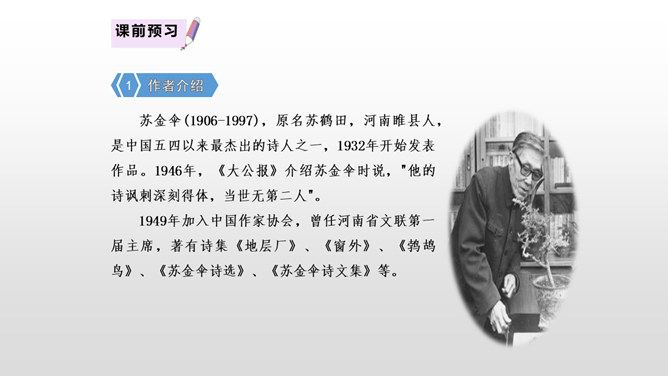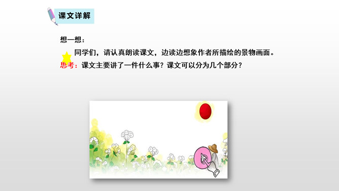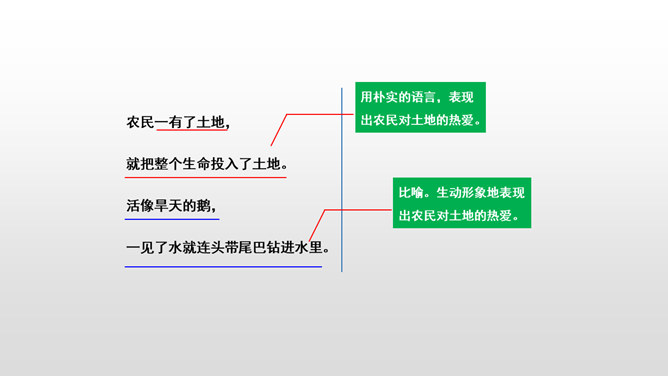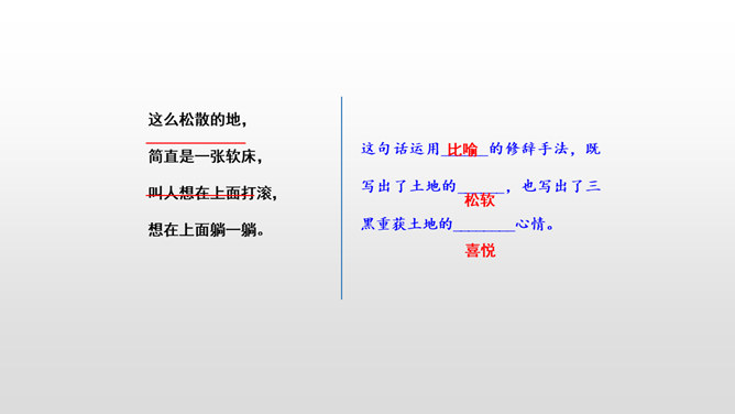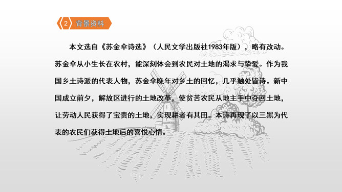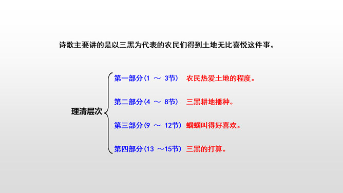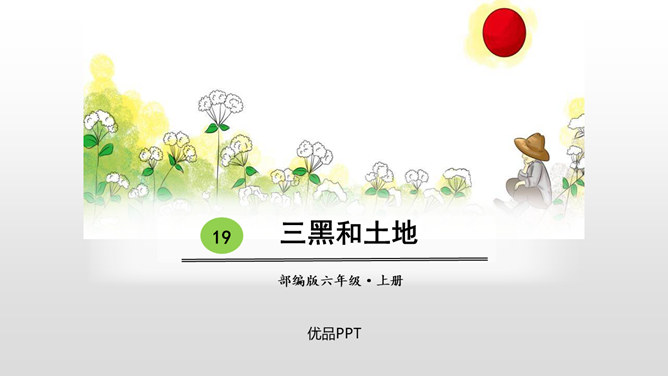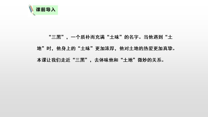 “三黑”,一个质朴而充满“土味”的名字。当他遇到“土地”时,他身上的“土味”更加浓厚,他对土地的热爱更加真挚。本课让我们走近“三黑”,去体味他和“土地”微妙的关系。想一想:同学们,请认真朗读课文,边读边想象作者所描绘的景物画面。思考:课文主要讲了一件什么事?课文可以分为几个部分?诗歌主要讲的是以三黑为代表的农民们得到土地无比喜悦这件事。用朴实的语言,表现出农民对土地的热爱。所属专题:三黑和土地ppt。