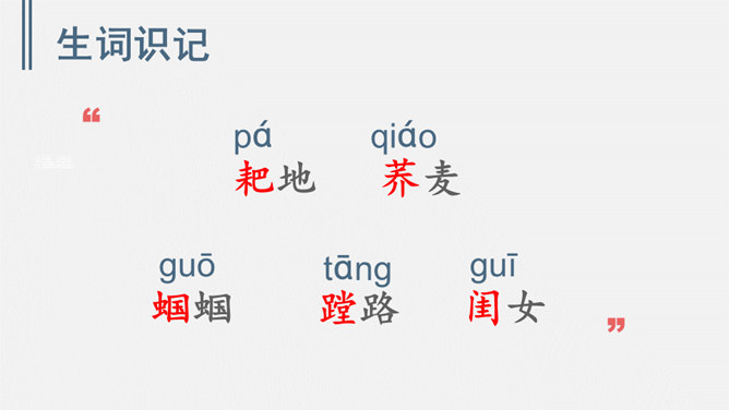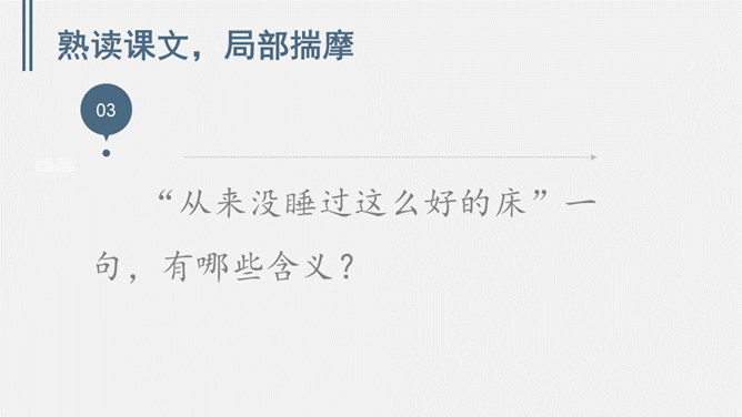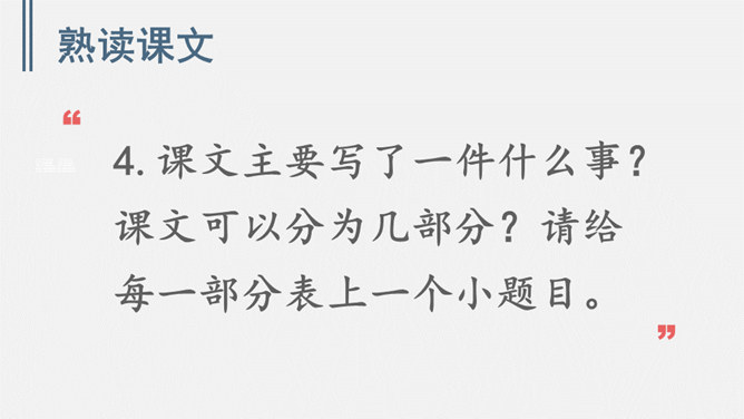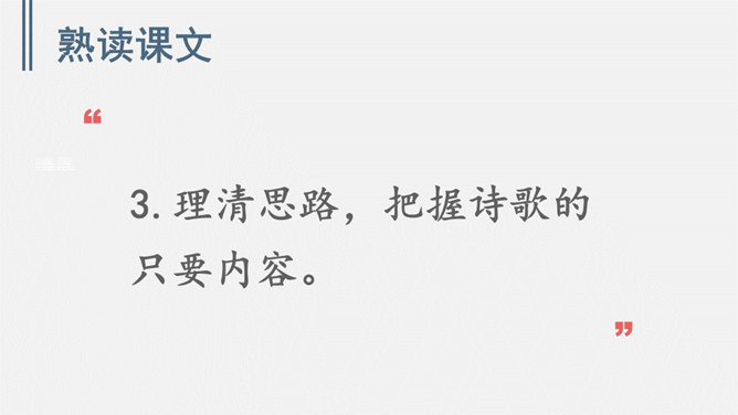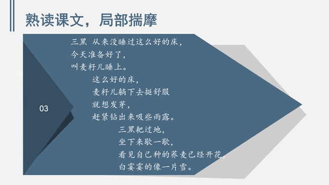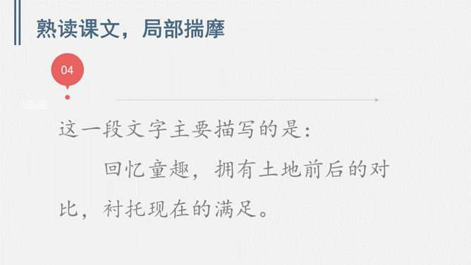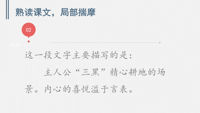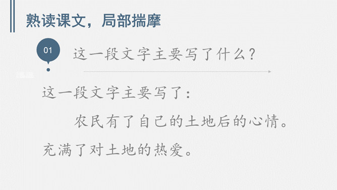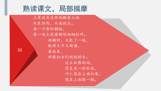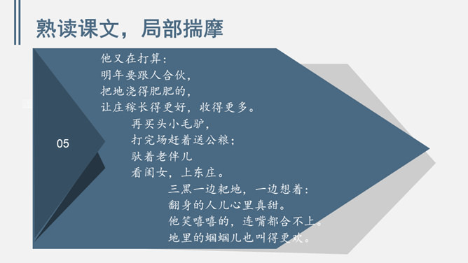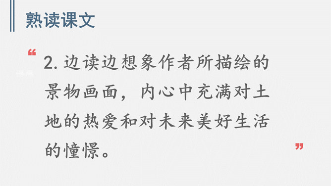 1.朗读课文两遍,注意读准字音、读通句子、读出情感。2.边读边想象作者所描绘的景物画面,内心中充满对土地的热爱和对未来美好生活的憧憬。3.理清思路,把握诗歌的只要内容。4.课文主要写了一件什么事?课文可以分为几部分?请给每一部分表上一个小题目。主人公“三黑”心想“翻身的人儿心里真甜”一句表达出对美好生活的憧憬和向往。这首诗歌中,作者在表情达意上运用了哪些技巧?举例说明。所属专题:三黑和土地ppt。