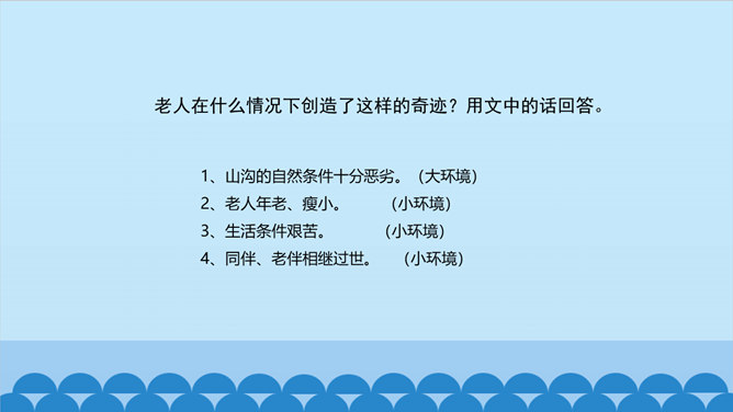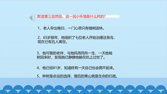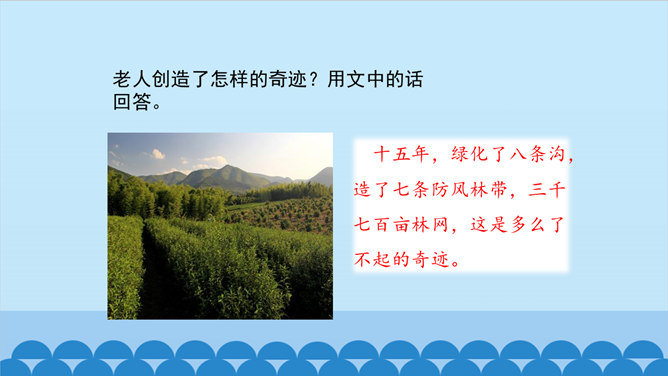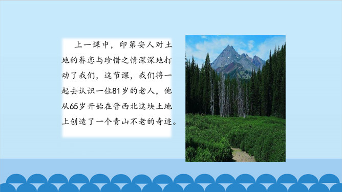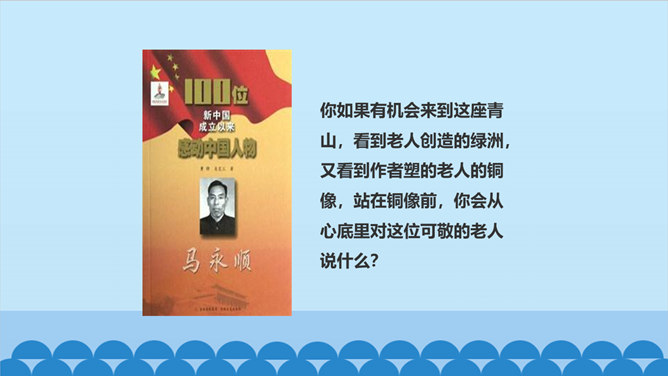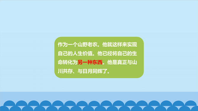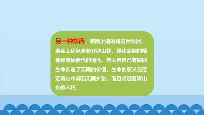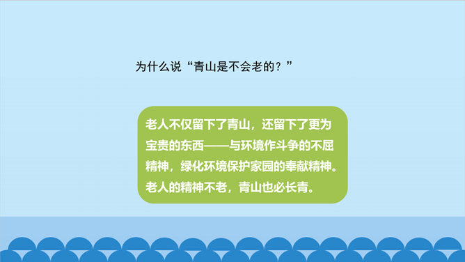 老人不仅留下了青山,还留下了更为宝贵的东西——与环境作斗争的不屈精神,绿化环境保护家园的奉献精神。老人的精神不老,青山也必长青。作为一个山野老农。他就这样来实现自己的人生价值。他已经将自己的生命转化为另一种东西。他是真正与山川共存、与日月同辉了。另一种东西,表面上指的是这片绿洲,事实上还包含着开辟山林、绿化家园的精神和造福后代的情怀。老人用自己有限的生命创造了无限的价值,生命的意义在茫茫青山中得到无限扩张,而且将随着青山永垂不朽。所属专题:青山不老ppt。