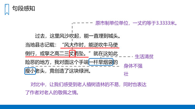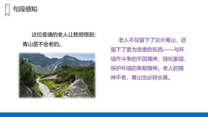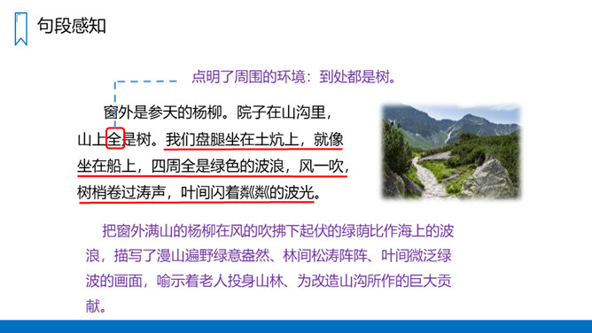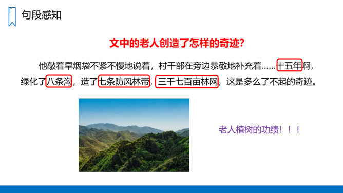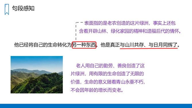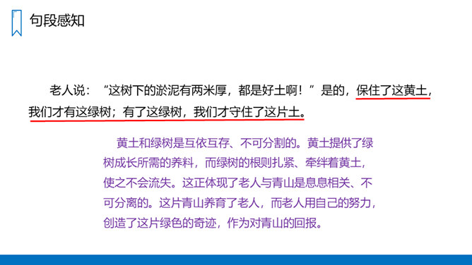 把窗外满山的杨柳在风的吹拂下起伏的绿荫比作海上的波浪,描写了漫山遍野绿意盎然、林间松涛阵阵、叶间微泛绿波的画面,喻示着老人投身山林、为改造山沟所作的巨大贡献。对比中,让我们感受到老人植树造林的不易,同时也表达了作者对老人的敬佩之情。黄土和绿树是互依互存、不可分割的。黄土提供了绿树成长所需的养料,而绿树的根则扎紧、牵绊着黄土,使之不会流失。这正体现了老人与青山是息息相关、不可分离的。这片青山养育了老人,而老人用自己的努力,创造了这片绿色的奇迹,作为对青山的回报。所属专题:青山不老ppt。