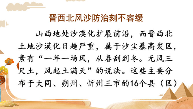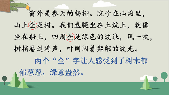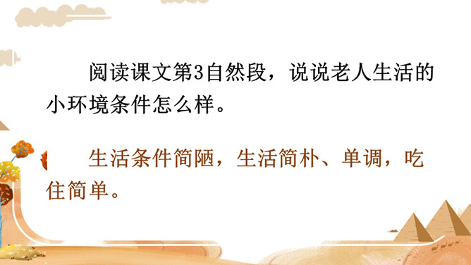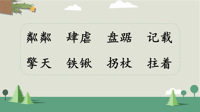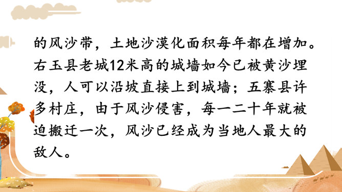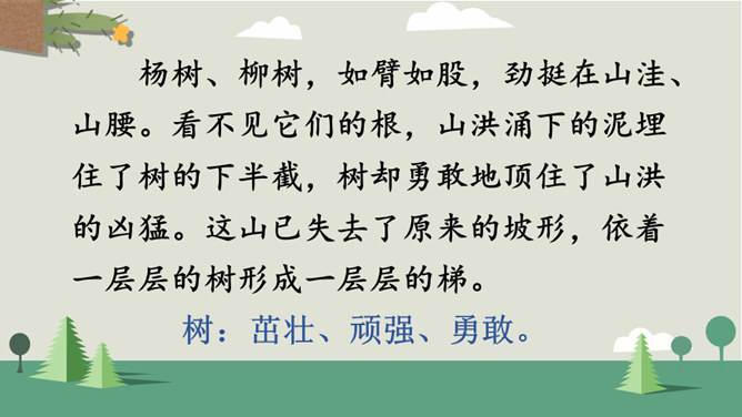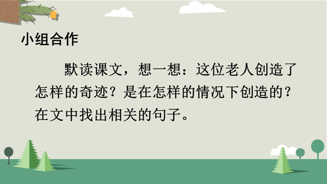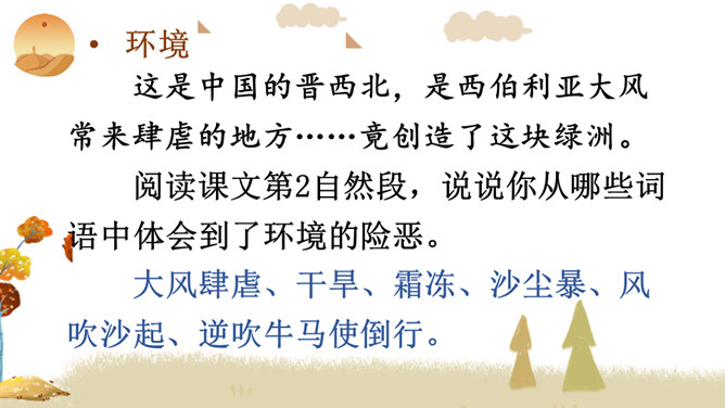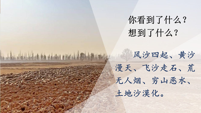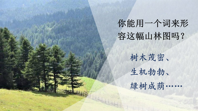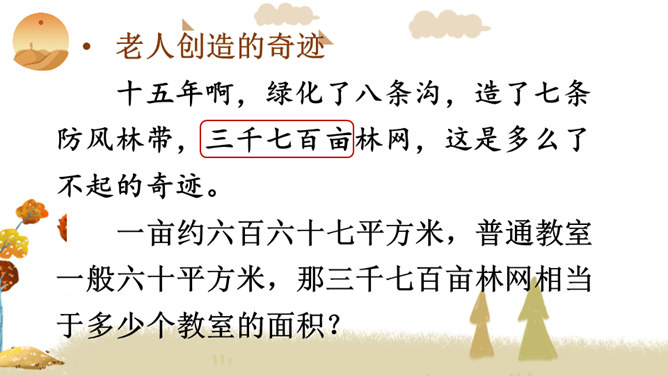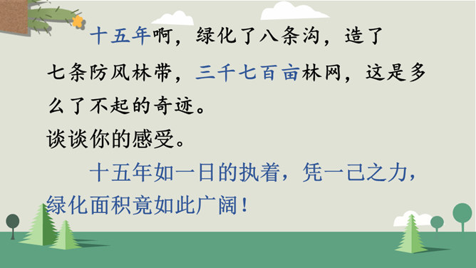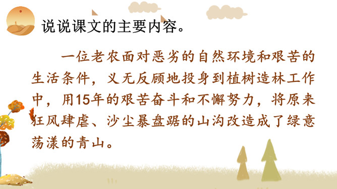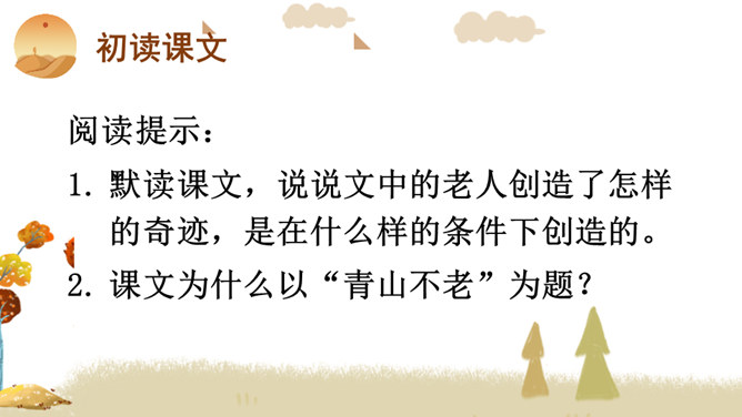 你看到了什么?想到了什么?风沙四起、黄沙漫天、飞沙走石、荒无人烟、穷山恶水、土地沙漠化。你能用一个词来形容这幅山林图吗?树木茂密、生机勃勃、绿树成荫……阅读提示:默读课文,说说文中的老人创造了怎样的奇迹,是在什么样的条件下创造的。课文为什么以“青山不老”为题?说说课文的主要内容。一位老农面对恶劣的自然环境和艰苦的生活条件,义无反顾地投身到植树造林工作中,用15年的艰苦奋斗和不懈努力,将原来狂风肆虐、沙尘暴盘踞的山沟改造成了绿意荡漾的青山。所属专题:青山不老ppt。