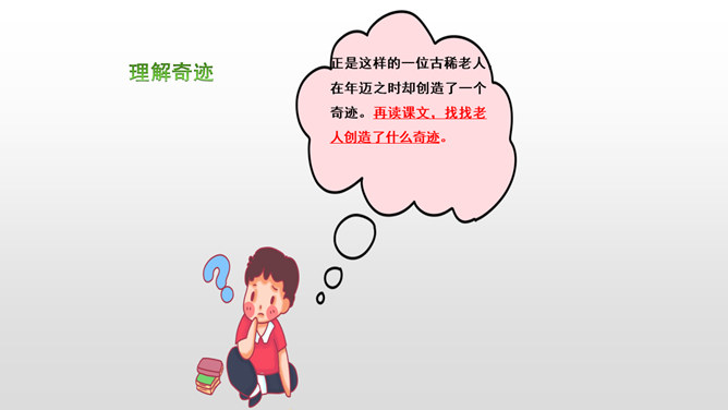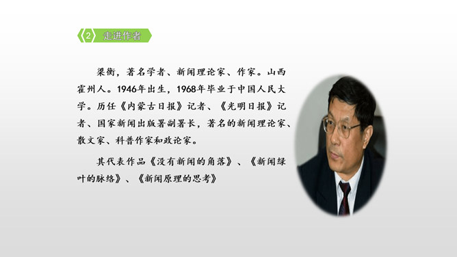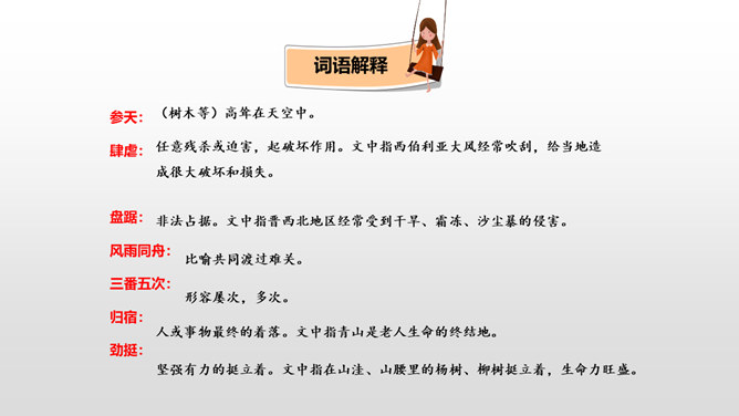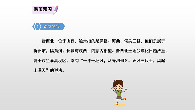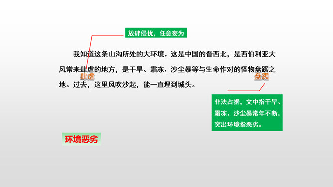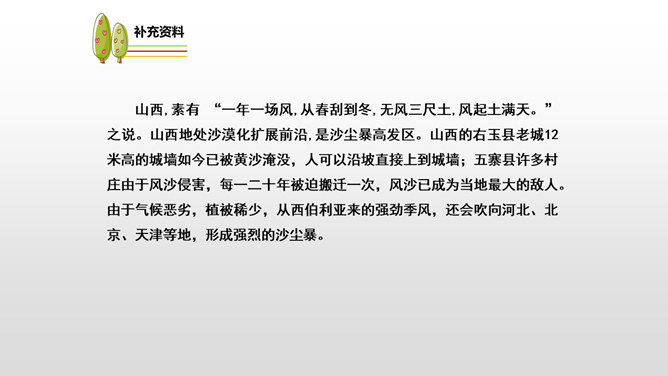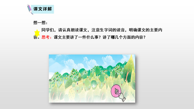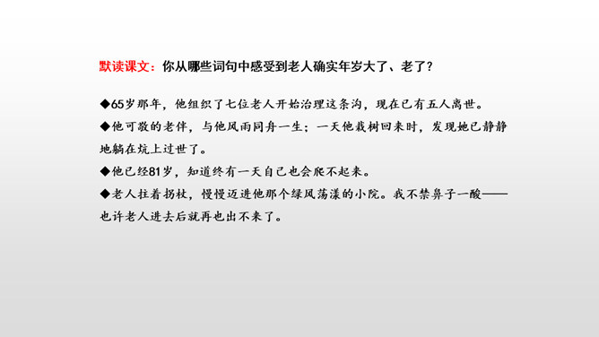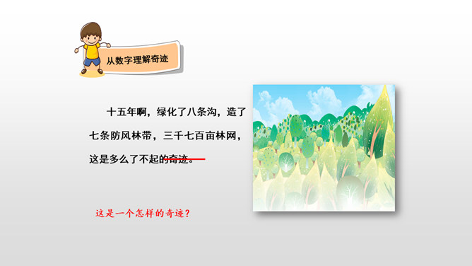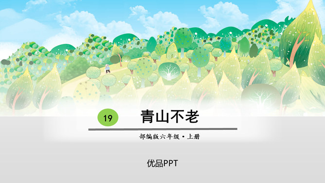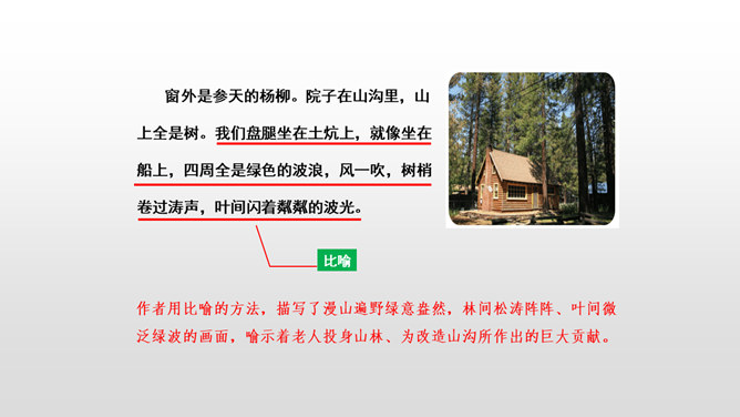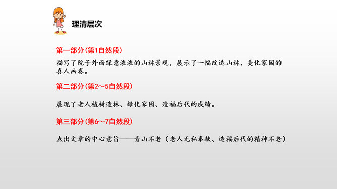 课文先描写了院子外面绿意浓浓的山林景观,展示了一幅改造山林、美化家园的喜人画卷,喻示老人绿化山林、改造山沟所取得的成绩;接着作者从两方面补充介绍了山林改造的背景状况:通过山沟自然条件的恶劣险峻,来衬托改造山林的艰难困苦;通过老农生活条件的简陋艰辛,突出老农植树造林的难度之大、态度之坚决;通过村干部的补充介绍、老农的陪同参观,展现了老人植树造林、绿化家园、造福后代的成绩;最后以作者自身的心灵感触提升全文。所属专题:青山不老ppt。