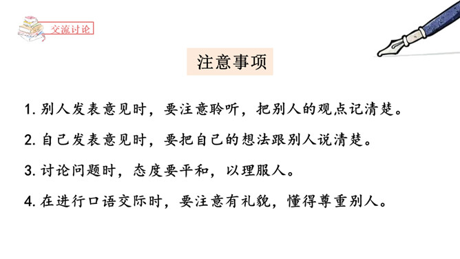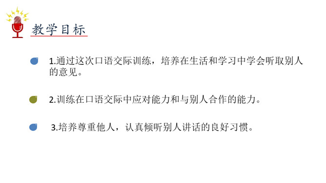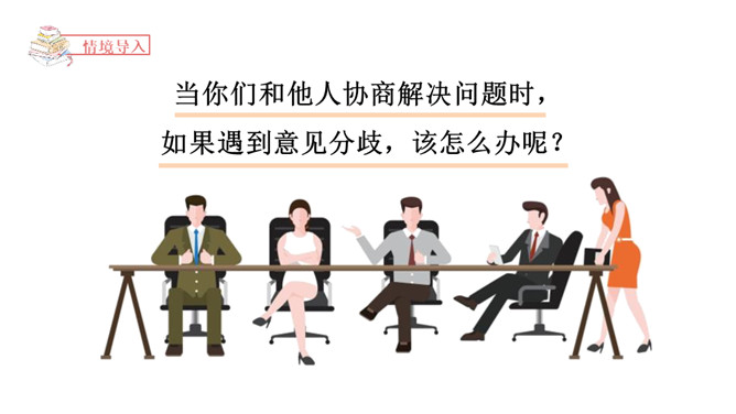 1.通过这次口语交际训练,培养在生活和学习中学会听取别人的意见。2.训练在口语交际中应对能力和与别人合作的能力。3.培养尊重他人,认真倾听别人讲话的良好习惯。当你们和他人协商解决问题时,如果遇到意见分歧,该怎么办呢?1.认真倾听他人的意见;2.当他人的意见不正确时,要尊重他人,找出充分的理由来反驳,让别人心服口服;3.不能讥讽嘲笑,造成双方的矛盾。所属专题:意见不同怎么办ppt。