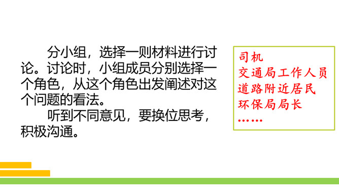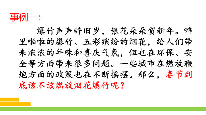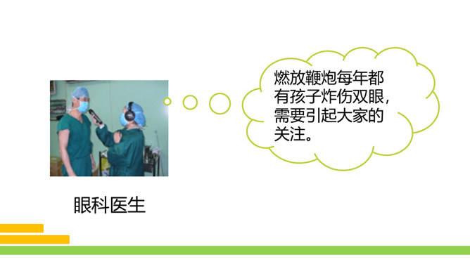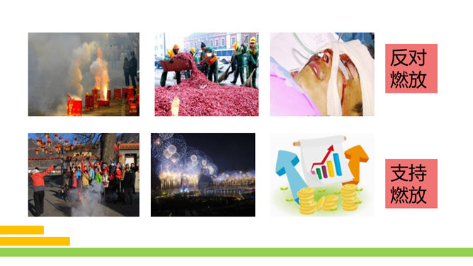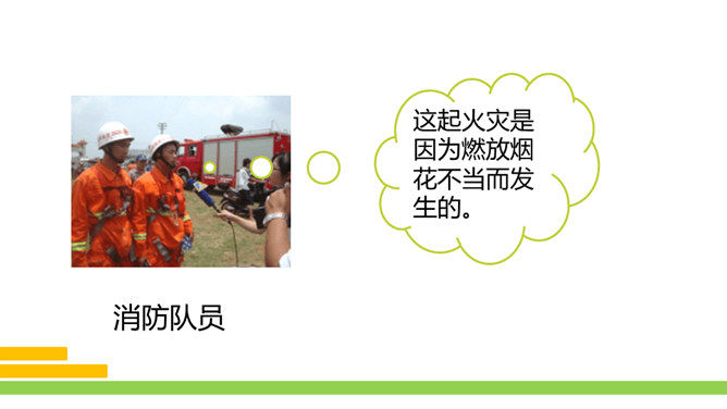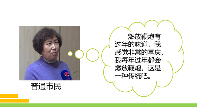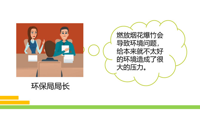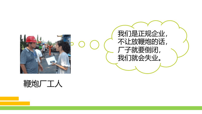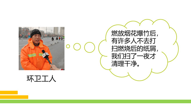 消防队员:这起火灾是因为燃放烟花不当而发生的。环卫工人:燃放烟花爆竹后,有许多人不去打扫燃烧后的纸屑,我们扫了一夜才清理干净。鞭炮厂工人:我们是正规企业,不让放鞭炮的话,厂子就要倒闭,我们就会失业。环保局局长:燃放烟花爆竹会导致环境问题,给本来就不太好的环境造成了很大的压力。眼科医生:燃放鞭炮每年都有孩子炸伤双眼,需要引起大家的关注。所属专题:意见不同怎么办ppt。