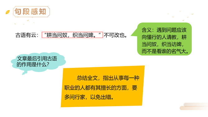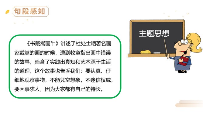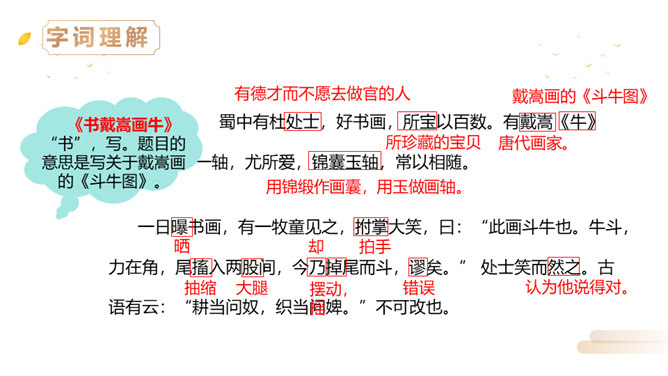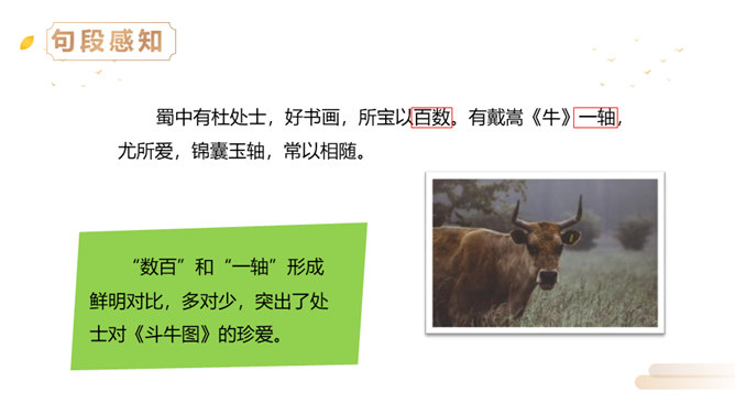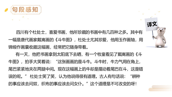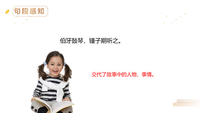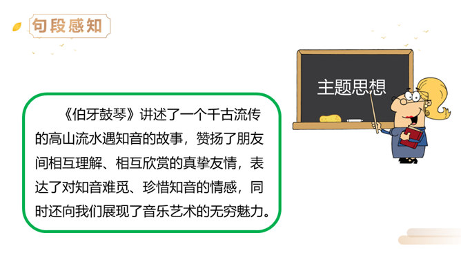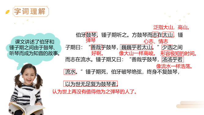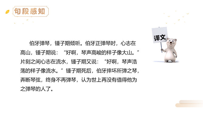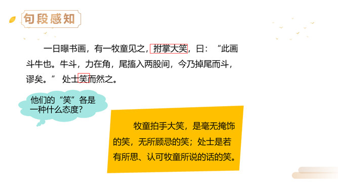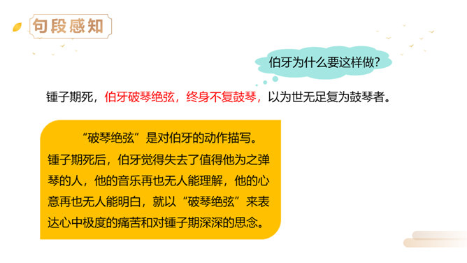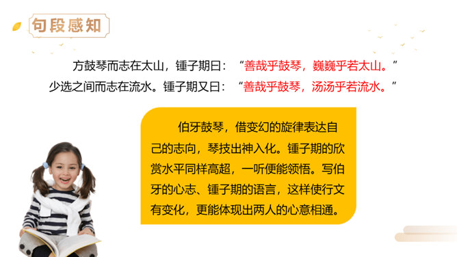 伯牙鼓琴,借变幻的旋律表达自己的志向,琴技出神入化。锺子期的欣赏水平同样高超,一听便能领悟。写伯牙的心志、锺子期的语言,这样使行文有变化,更能体现出两人的心意相通。“破琴绝弦”是对伯牙的动作描写。锺子期死后,伯牙觉得失去了值得他为之弹琴的人,他的音乐再也无人能理解,他的心意再也无人能明白,就以“破琴绝弦”来表达心中极度的痛苦和对锺子期深深的思念。牧童拍手大笑,是毫无掩饰的笑,无所顾忌的笑;处士是若有所思、认可牧童所说的话的笑。总结全文,指出从事每一种职业的人都有其擅长的方面,要多问行家,以免出错。