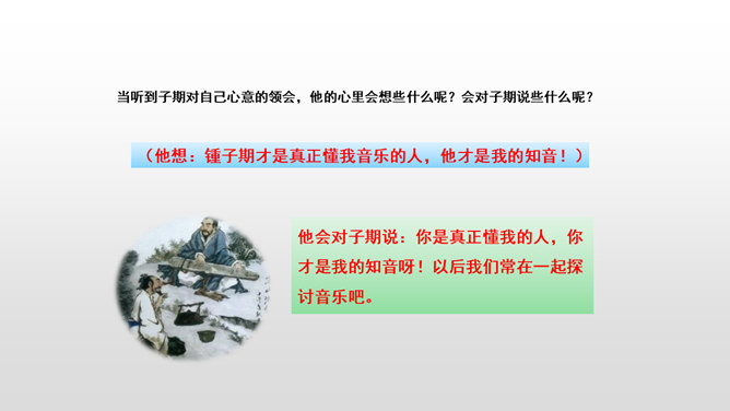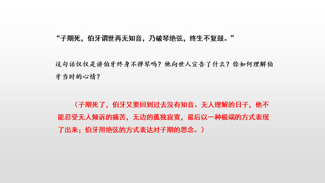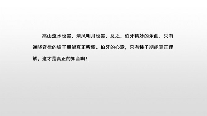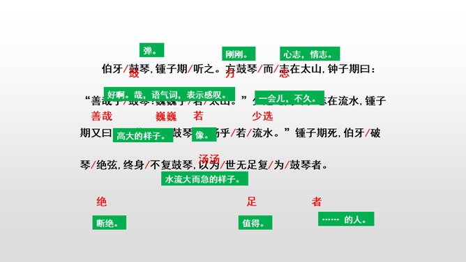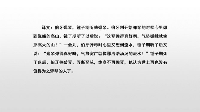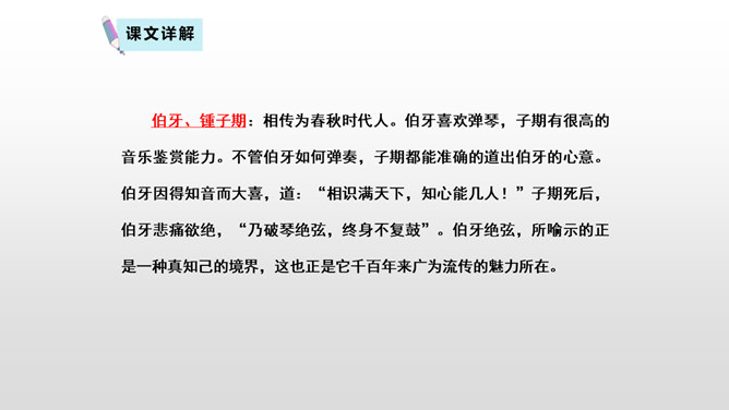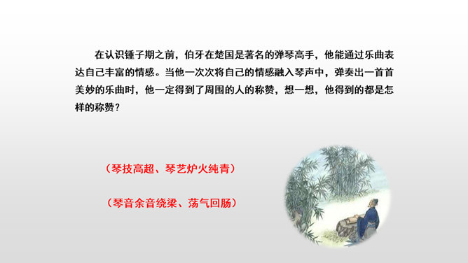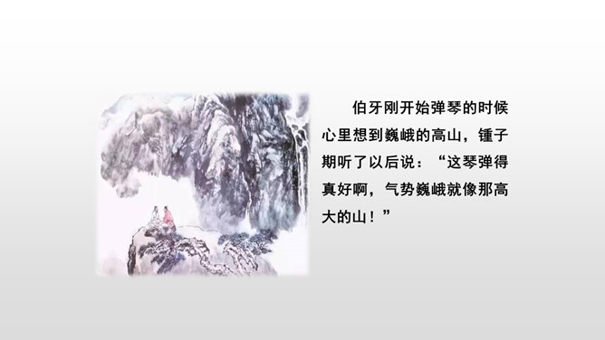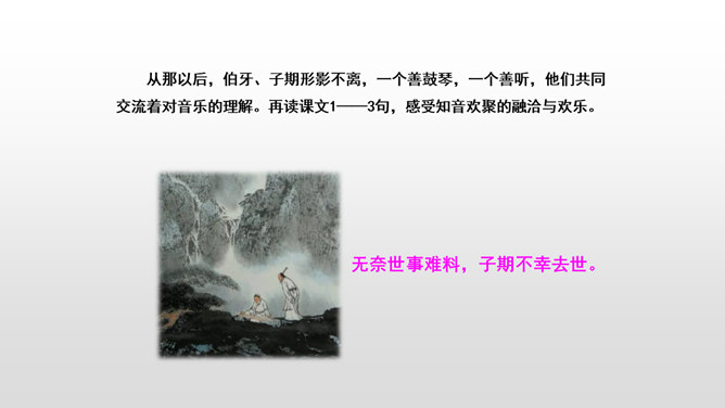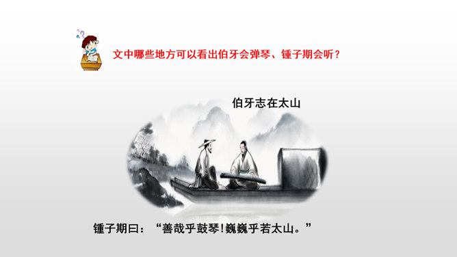 文言文是我国传统文化的宝贵遗产,它言简意赅,记录了我国悠久的历史,灿烂的文明。不少文言文还揭示了深刻的道理。今天,我们一起学习两篇关于知音与哲理性的文言文。1.初读课文,完成:(1)自读课文,借助拼音,读准字音,并画出生字词,注意把课文读通顺。(2)查字典或联系上下文理解词语。2. 交流学习情况。文中哪些地方可以看出伯牙会弹琴、锺子期会听?伯牙琴艺绝伦,他肯定不止只在高山流水,想象:他还会只在哪里?
