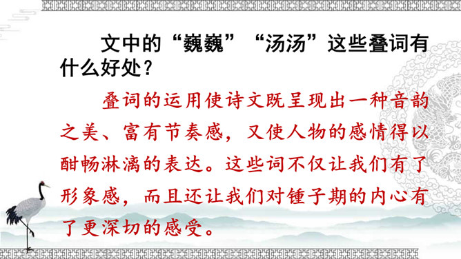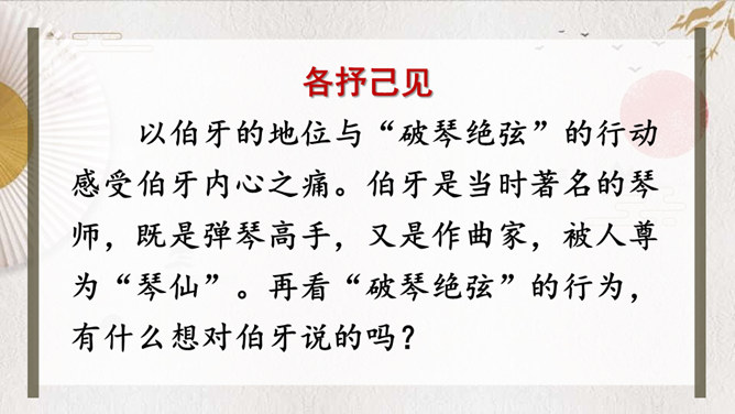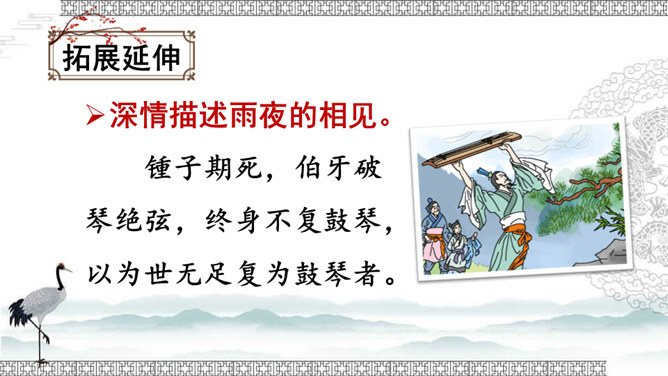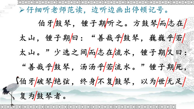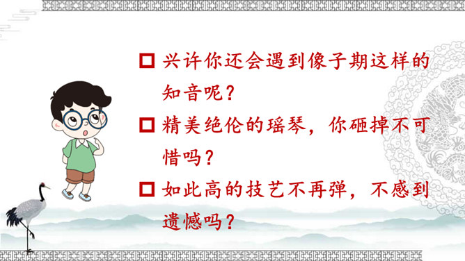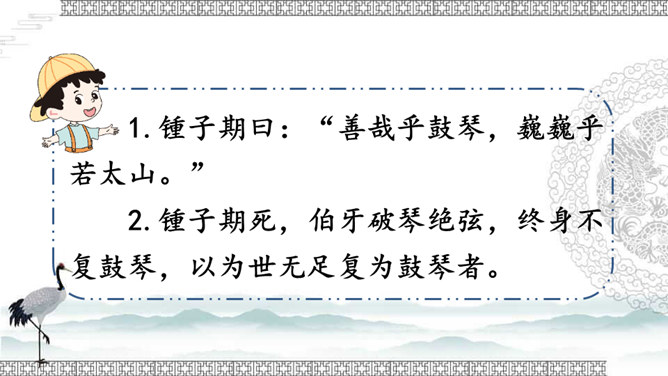 文中的“巍巍”“汤汤”这些叠词有什么好处?叠词的运用使诗文既呈现出一种音韵之美、富有节奏感,又使人物的感情得以酣畅淋漓的表达。这些词不仅让我们有了形象感,而且还让我们对锺子期的内心有了更深切的感受。故事的主人公伯牙与锺子期的真挚情谊令人感动。表达了朋友间相互理解、相互欣赏的真挚友情,以及知音难觅,珍惜知音的情感。默读课文,思考:牧童是怎样评价这幅画的?他的理由是什么?由此可见牧童的什么精神?处士面对牧童的话有什么表现?由此可见处士是一个什么样的人?课文告诉我们:要认真、仔细地观察事物,不能凭空想象。艺术再美也是来源于生活。