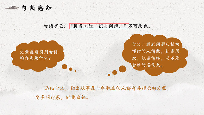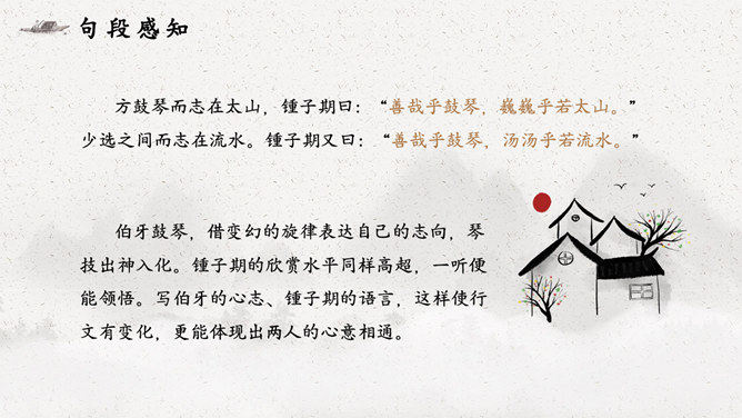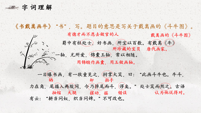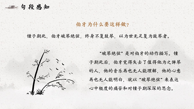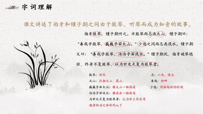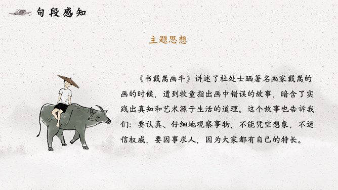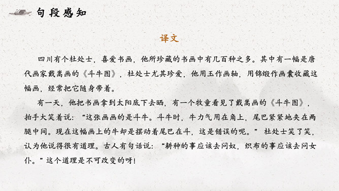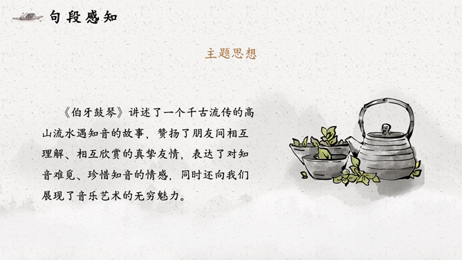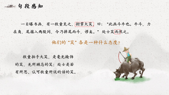 讲述了一个千古流传的高山流水遇知音的故事,赞扬了朋友间相互理解、相互欣赏的真挚友情,表达了对知音难觅、珍惜知音的情感,同时还向我们展现了音乐艺术的无穷魅力。“数百”和“一轴”形成鲜明对比,多对少,突出了处士对《斗牛图》的珍爱。他们的“笑”各是一种什么态度?牧童拍手大笑,是毫无掩饰的笑,无所顾忌的笑;处士是若有所思、认可牧童所说的话的笑。文章最后引用古语的作用是什么?含义:遇到问题应该向懂行的人请教,耕当问奴,织当访婢,而不是看谁的名气大。总结全文,指出从事每一种职业的人都有其擅长的方面,要多问行家,以免出错。