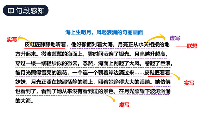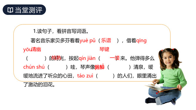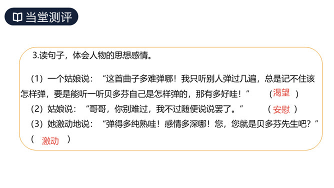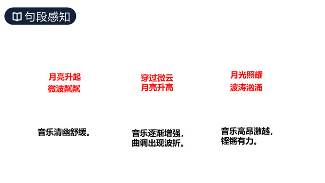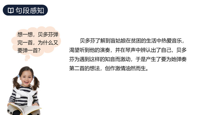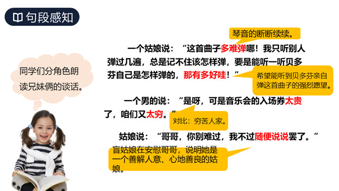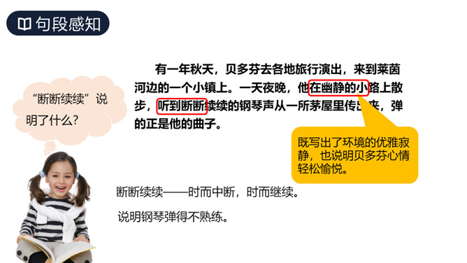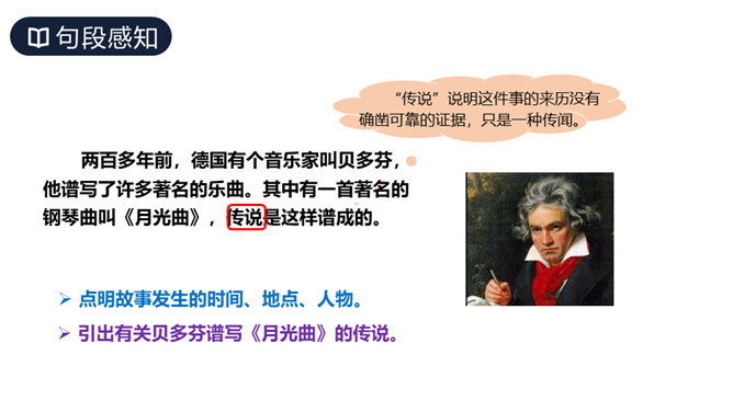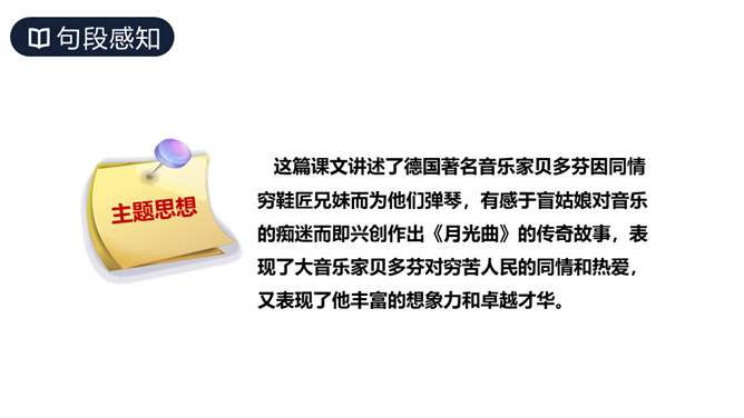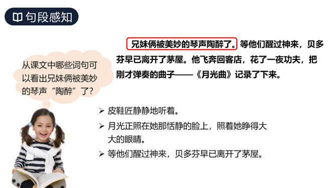 这篇课文讲述了德国著名音乐家贝多芬因同情穷鞋匠兄妹而为他们弹琴,有感于盲姑娘对音乐的痴迷而即兴创作出《月光曲》的传奇故事,表现了大音乐家贝多芬对穷苦人民的同情和热爱,又表现了他丰富的想象力和卓越才华。从课文中哪些词句可以看出兄妹俩被美妙的琴声“陶醉”了?同学们分角色朗读兄妹俩的谈话。“断断续续”说明了什么?既写出了环境的优雅寂静,也说明贝多芬心情轻松愉悦。所属专题:月光曲ppt。