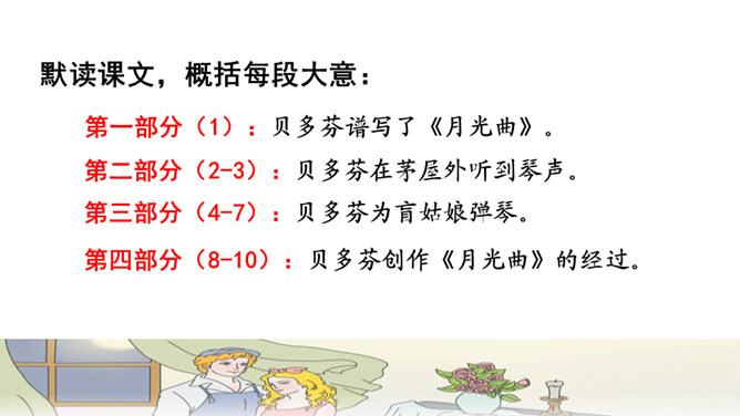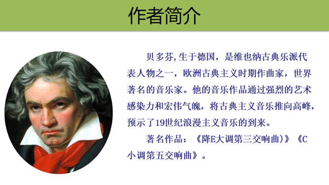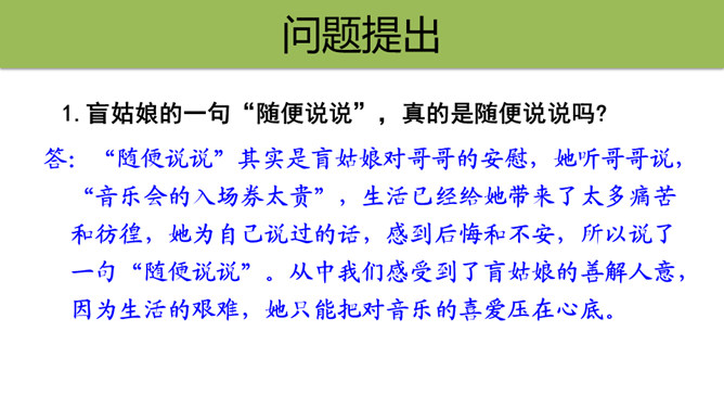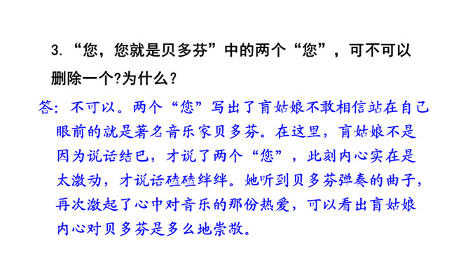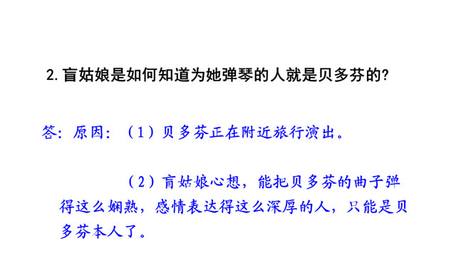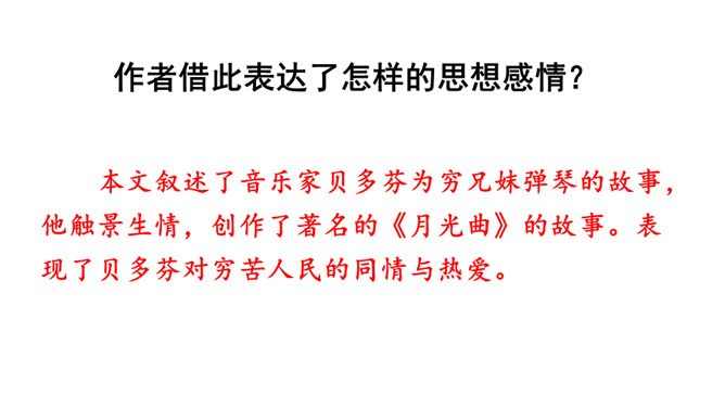 盲姑娘的一句“随便说说”,真的是随便说说吗?答:“随便说说”其实是盲姑娘对哥哥的安慰,她听哥哥说,“音乐会的入场券太贵”,生活已经给她带来了太多痛苦和彷徨,她为自己说过的话,感到后悔和不安,所以说了一句“随便说说”。从中我们感受到了盲姑娘的善解人意,因为生活的艰难,她只能把对音乐的喜爱压在心底。盲姑娘是如何知道为她弹琴的人就是贝多芬的?答:原因:(1)贝多芬正在附近旅行演出。(2)盲姑娘心想,能把贝多芬的曲子弹得这么娴熟,感情表达得这么深厚的人,只能是贝多芬本人了。所属专题:月光曲ppt。