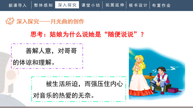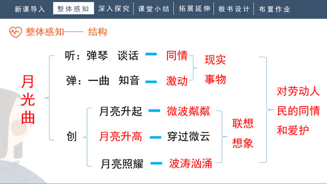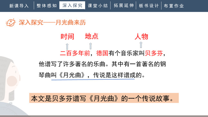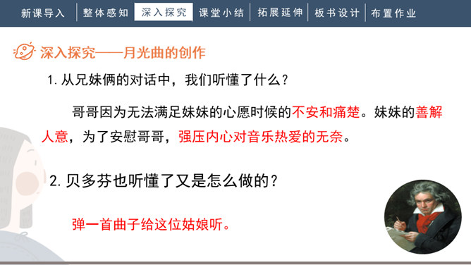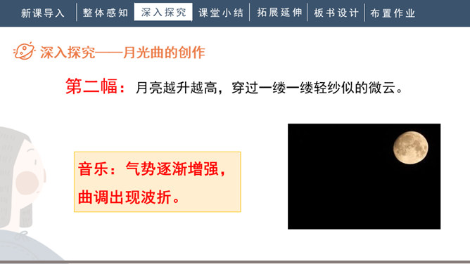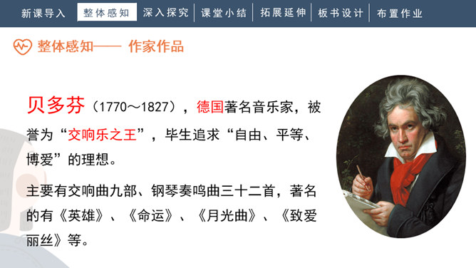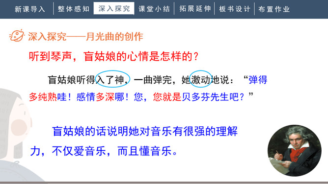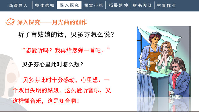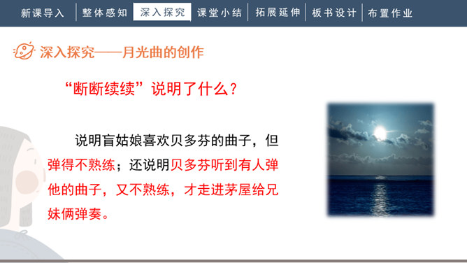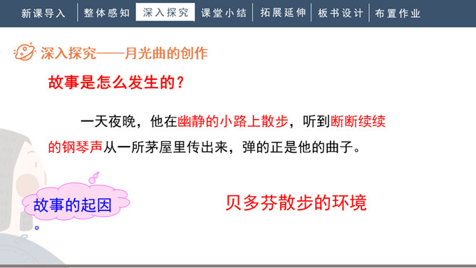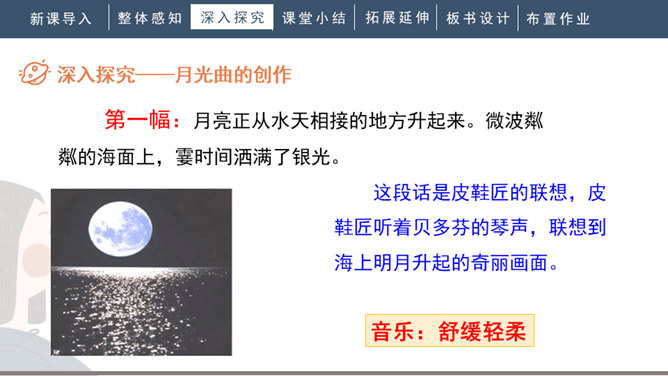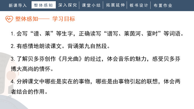 1.会写“谱、莱”等生字,正确读写“谱写、莱茵河、霎时”等词语。2.有感情地朗读课文。背诵第九自然段。3.了解贝多芬创作《月光曲》的经过,体会音乐的魅力,感受贝多芬博大高尚的情怀。4.分辨课文中哪些是实在的事物,哪些是由事物引起的联想,体会两者结合的作用。说明盲姑娘喜欢贝多芬的曲子,但弹得不熟练;还说明贝多芬听到有人弹他的曲子,又不熟练,才走进茅屋给兄妹俩弹奏。所属专题:月光曲ppt。