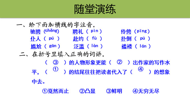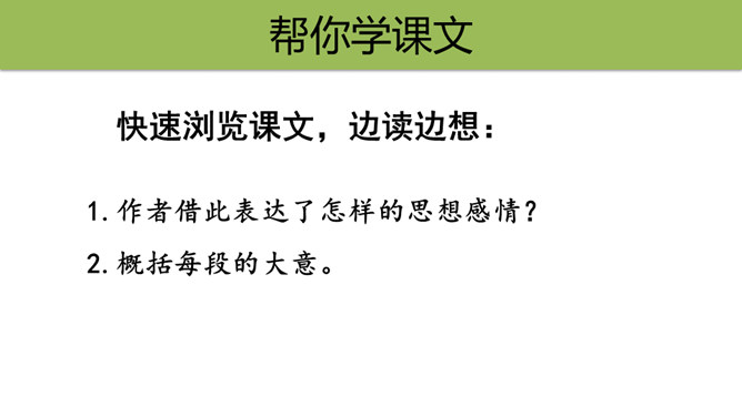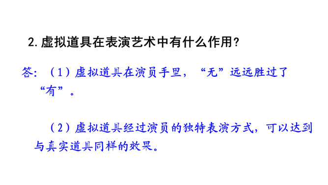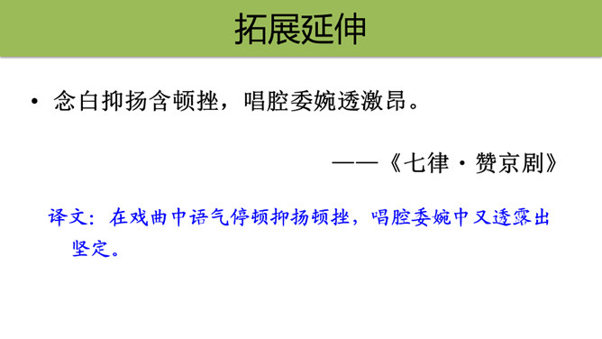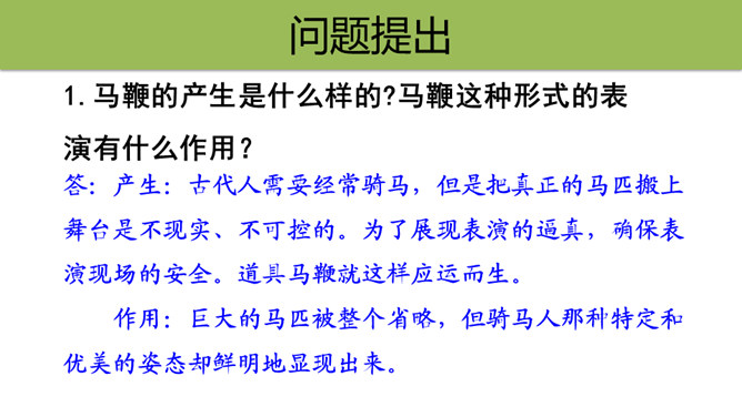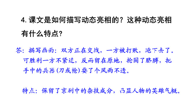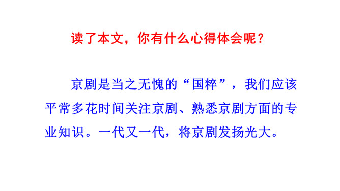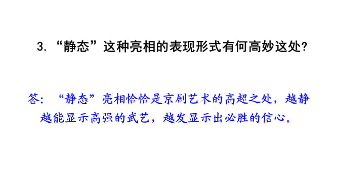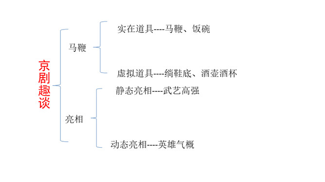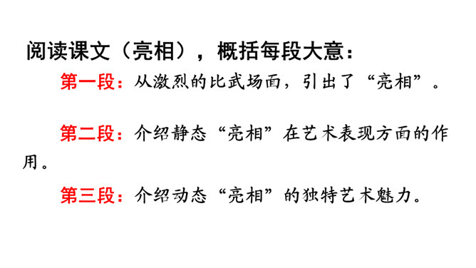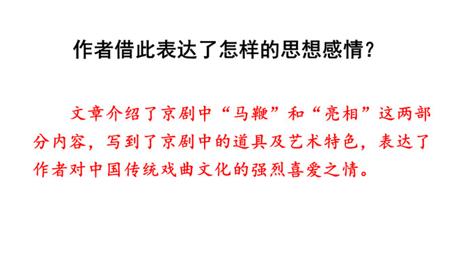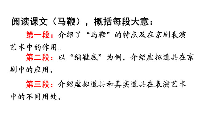 阅读课文(马鞭),概括每段大意:第一段:介绍了“马鞭”的特点及在京剧表演艺术中的作用。第二段:以“绱鞋底”为例,介绍虚拟道具在京剧中的应用。第三段:介绍虚拟道具和真实道具在表演艺术中的不同用处。阅读课文(亮相),概括每段大意:第一段:从激烈的比武场面,引出了“亮相”。第二段:介绍静态“亮相”在艺术表现方面的作用。第三段:介绍动态“亮相”的独特艺术魅力。所属专题:京剧趣谈ppt。