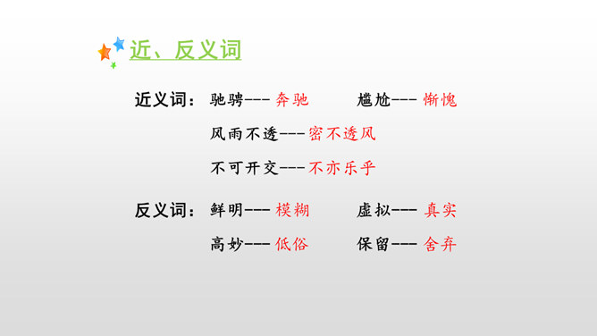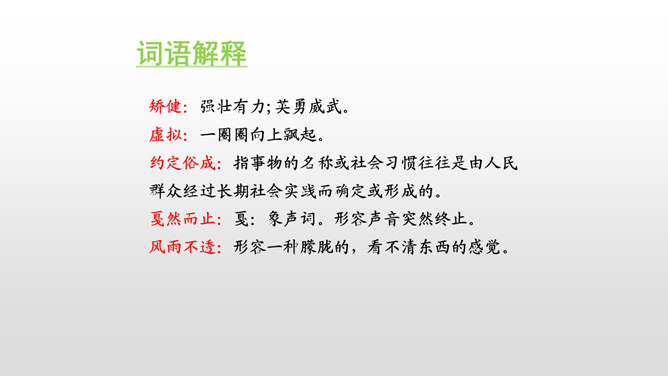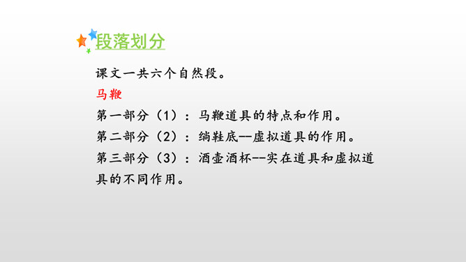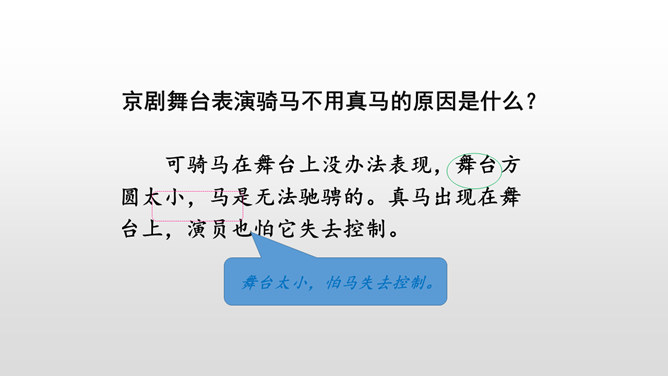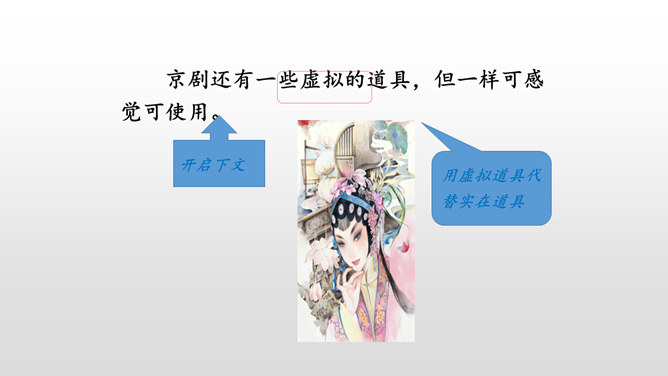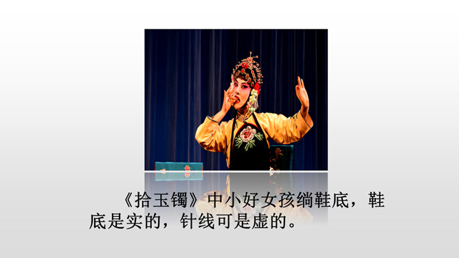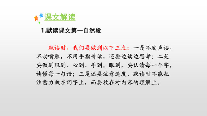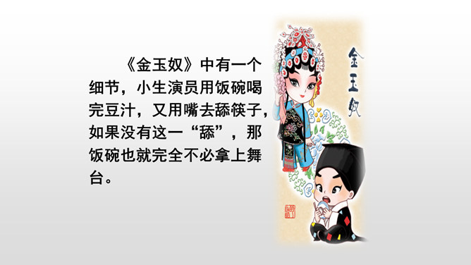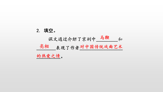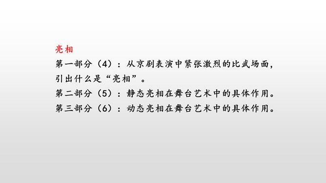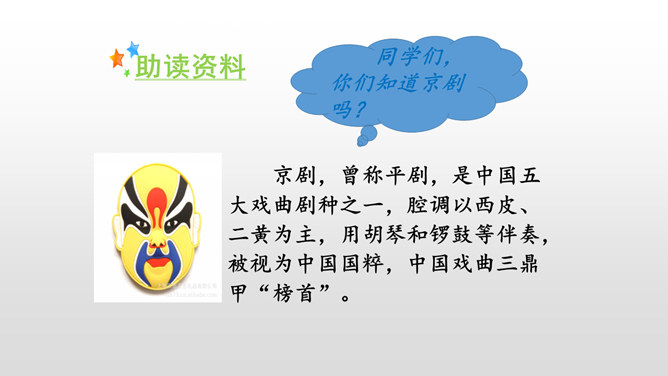 默读时,我们要做到以下三点:一是不发声读,不动嘴唇,不用手指着读,还要边读边思考;二是要做到眼到、心到、手到。眼到,要认清每一个字,读懂每一句话;三是还要注意速度,默读时不能把注意力放在词字上,而要放在对内容的理解上。静态亮相恰恰是京剧艺术的高妙之处,静越发能显示武艺的高强,越发能显示必胜的信心。想一想,课文是怎么描写京剧舞台表演中的动态亮相的?“京剧中的杂技”表现了京剧艺术的包容性和融合性。所属专题:京剧趣谈ppt。