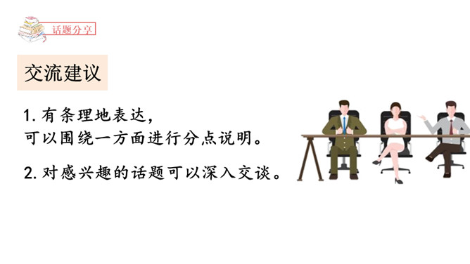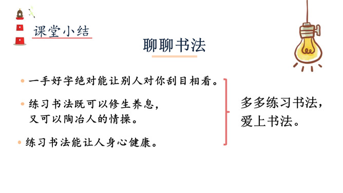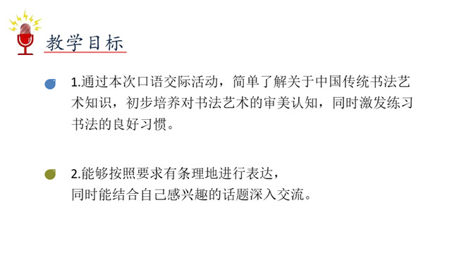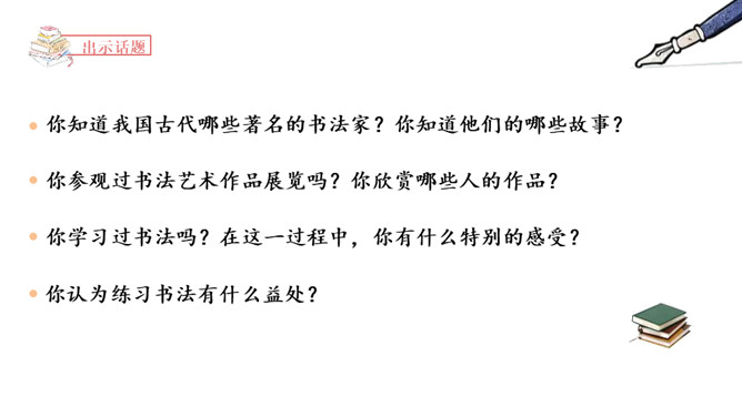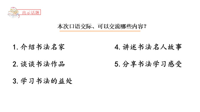 1.通过本次口语交际活动,简单了解关于中国传统书法艺术知识,初步培养对书法艺术的审美认知,同时激发练习书法的良好习惯。2.能够按照要求有条理地进行表达,同时能结合自己感兴趣的话题深入交流。你知道我国古代哪些著名的书法家?你知道他们的哪些故事?你参观过书法艺术作品展览吗?你欣赏哪些人的作品?你学习过书法吗?在这一过程中,你有什么特别的感受?你认为练习书法有什么益处?所属专题:聊聊书法ppt。