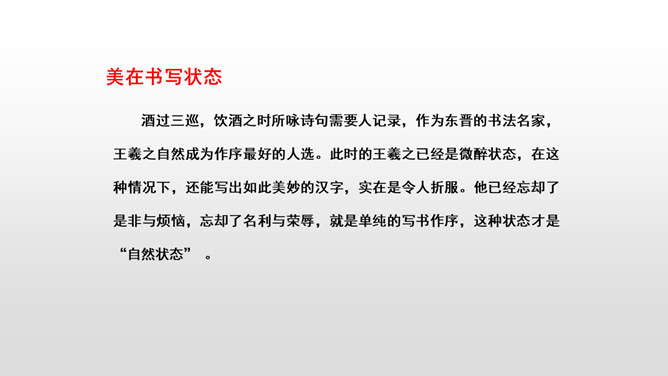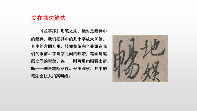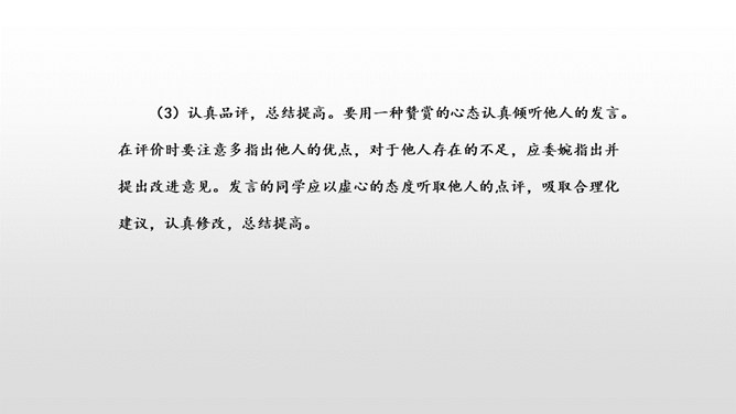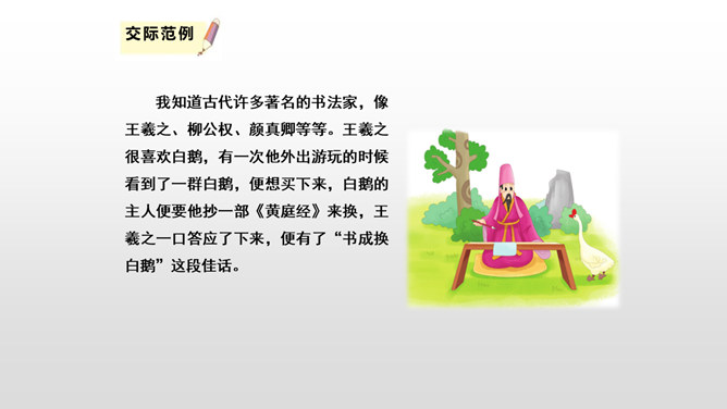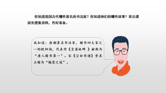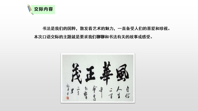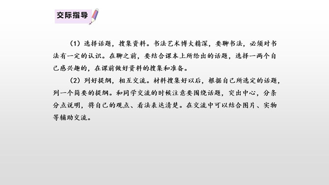 (1)选择话题,搜集资料。书法艺术博大精深,要聊书法,必须对书法有一定的认识。在聊之前,要结合课本上所给出的话题,选择一两个自己感兴趣的,在课前做好资料的搜集和准备。(2)列好提纲,相互交流。材料搜集好以后,根据自己所选定的话题,列一个简要的提纲。和同学交流的时候注意要围绕话题,突出中心,分条分点说明,将自己的观点、看法表达清楚。在交流中可以结合图片、实物等辅助交流。(3)认真品评,总结提高。要用一种赞赏的心态认真倾听他人的发言。所属专题:聊聊书法ppt。