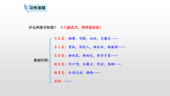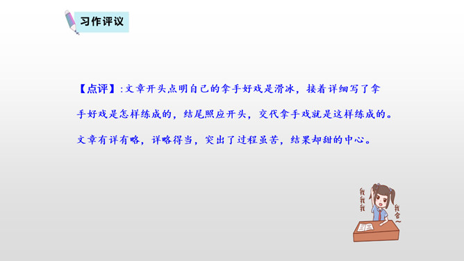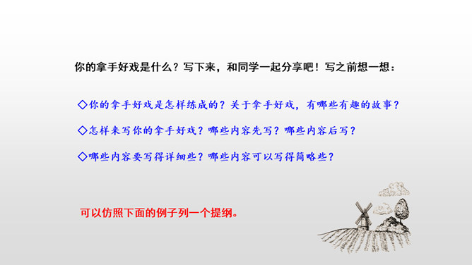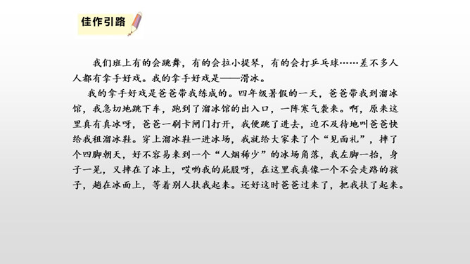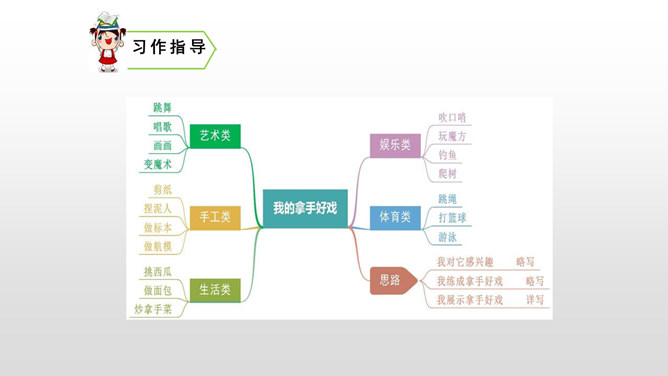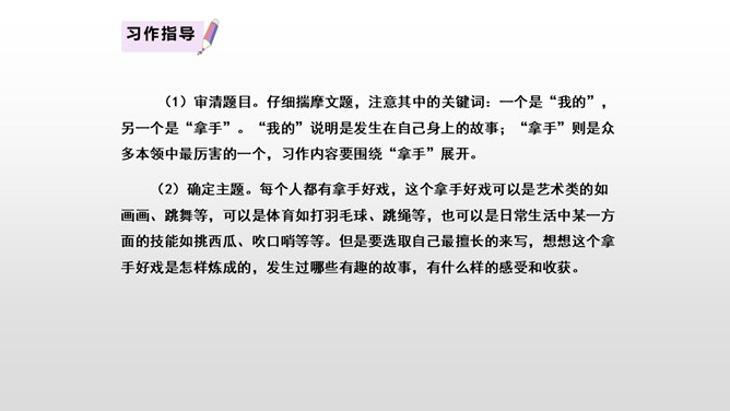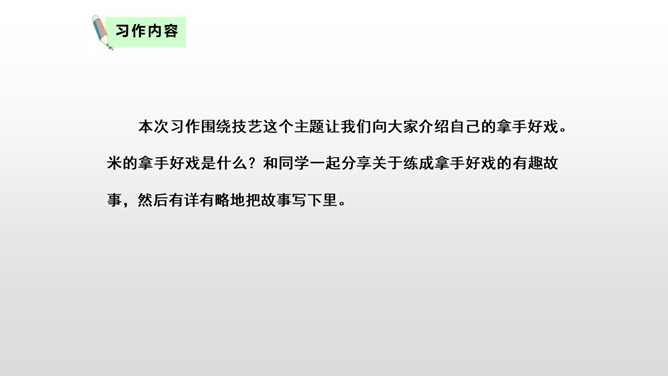 本次习作围绕技艺这个主题让我们向大家介绍自己的拿手好戏。米的拿手好戏是什么?和同学一起分享关于练成拿手好戏的有趣故事,然后有详有略地把故事写下里。你的拿手好戏是什么?写下来,和同学一起分享吧!写之前想一想:你的拿手好戏是怎样练成的?关于拿手好戏,有哪些有趣的故事?怎样来写你的拿手好戏?哪些内容先写?哪些内容后写?哪些内容要写得详细些?哪些内容可以写得简略些?所属专题:我的拿手好戏ppt。