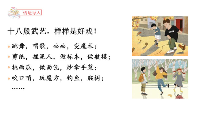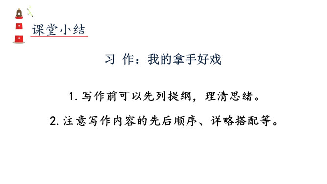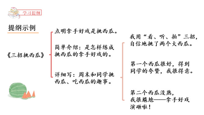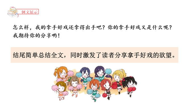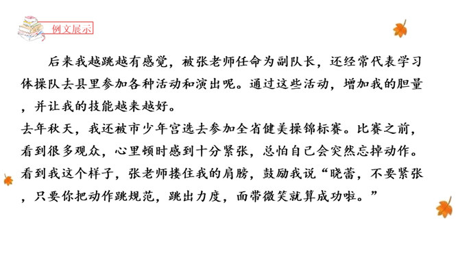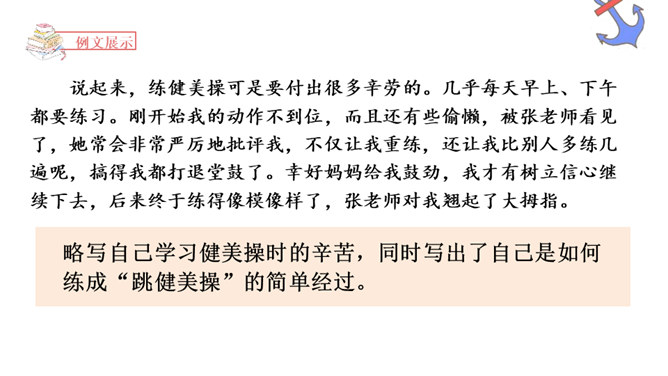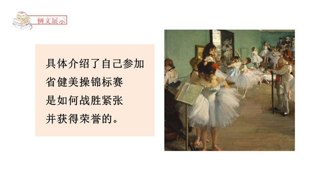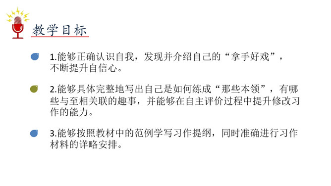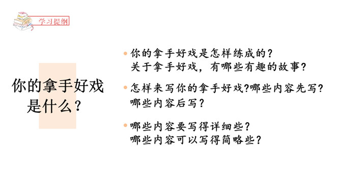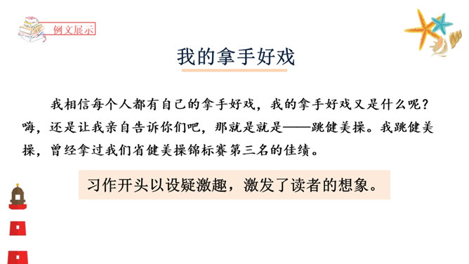 能够正确认识自我,发现并介绍自己的“拿手好戏”,不断提升自信心。能够具体完整地写出自己是如何练成“那些本领”,有哪些与至相关联的趣事,并能够在自主评价过程中提升修改习作的能力。能够按照教材中的范例学写习作提纲,同时准确进行习作材料的详略安排。习作开头以设疑激趣,激发了读者的想象。略写自己学习健美操时的辛苦,同时写出如何练成“跳健美操”的简单经过。具体介绍了自己参加省健美操锦标赛是如何战胜紧张并获得荣誉的。所属专题:我的拿手好戏ppt。