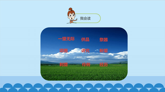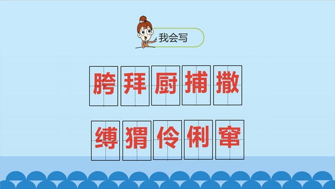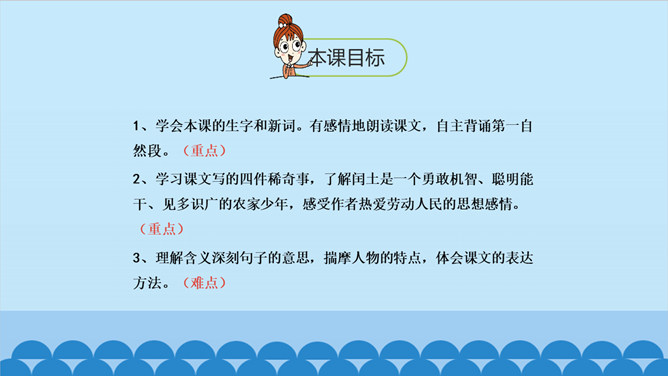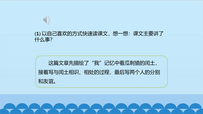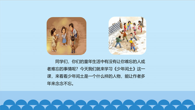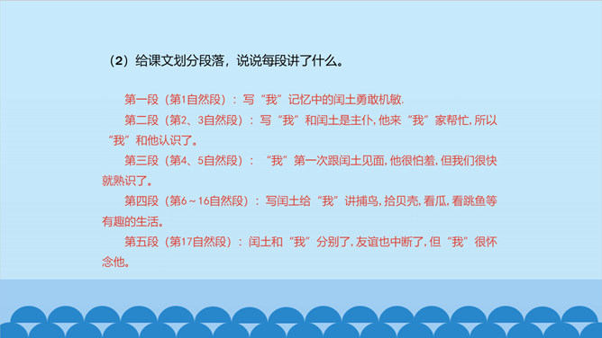 给课文划分段落,说说每段讲了什么。第一段(第1自然段):写“我”记忆中的闰土勇敢机敏。第二段(第2、3自然段):写“我”和闰土是主仆,他来“我”家帮忙,所以“我”和他认识了。第三段(第4、5自然段):“我”第一次跟闰土见面,他很怕羞,但我们很快就熟识了。第四段(第6~16自然段):写闰土给“我”讲捕鸟,拾贝壳,看瓜,看跳鱼等有趣的生活。第五段(第17自然段):闰土和“我”分别了,友谊也中断了,但“我”很怀念他。所属专题:少年闰土ppt。