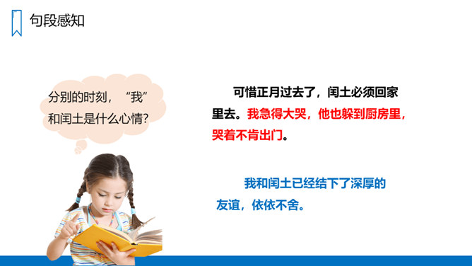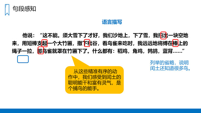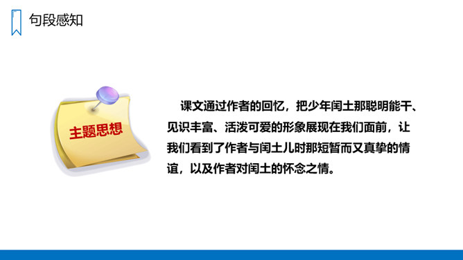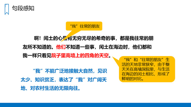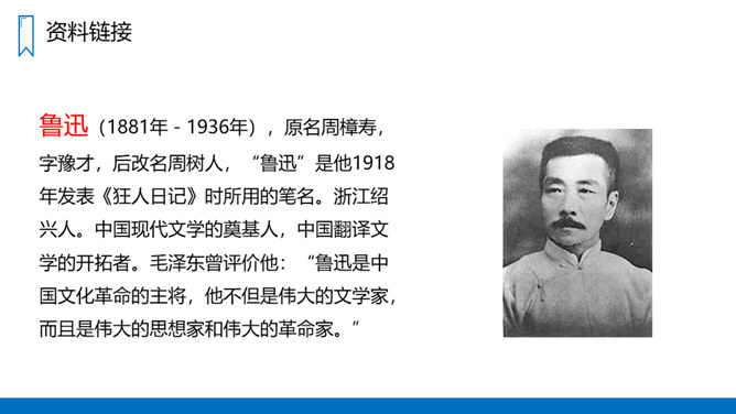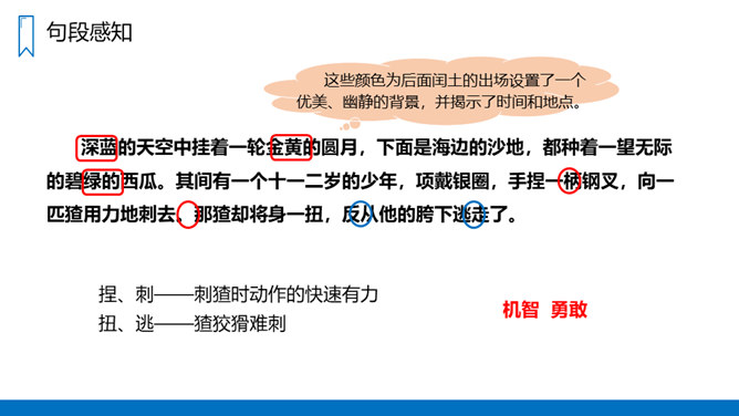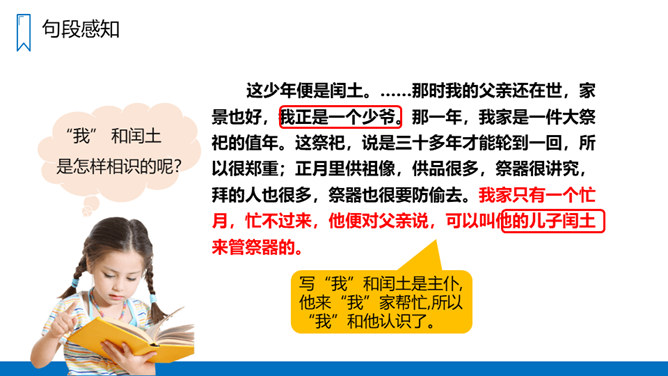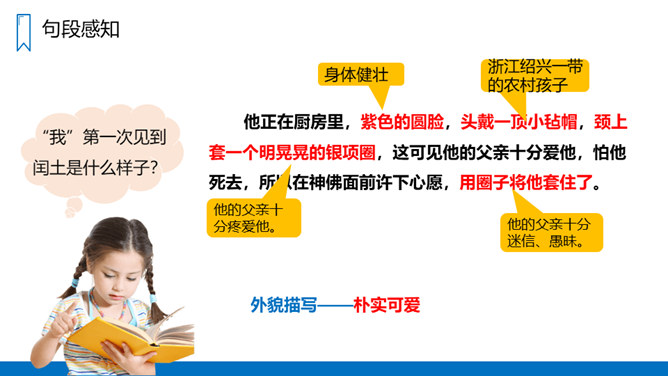 你了解鲁迅吗?他是我国伟大的文学家、思想家和革命家。今天我们来认识他的一位儿时的伙伴。这些颜色为后面闰土的出场设置了一个优美、幽静的背景,并揭示了时间和地点。从这些精准有序的动作中,我们感受到闰土的聪明能干和富有灵气,是个捕鸟的能手。 “我”和“往常的朋友”生活的天地非常狭窄,由于整天关在高墙深院里,与生活在海边的闰土相比,形成了鲜明的对比。“我”不能广泛地接触大自然,见识太少、知识贫乏,表达了“我”对广阔天地、对农村生活的无限向往。所属专题:少年闰土ppt。