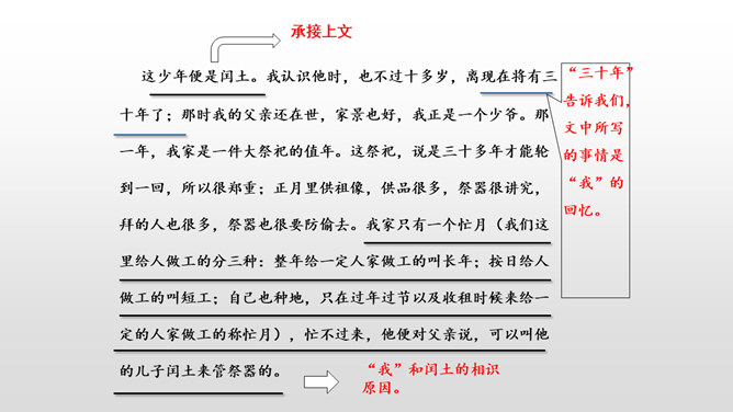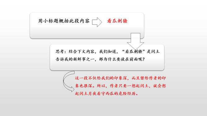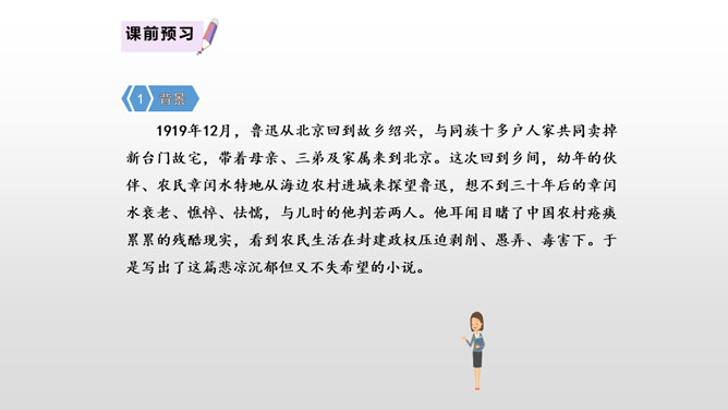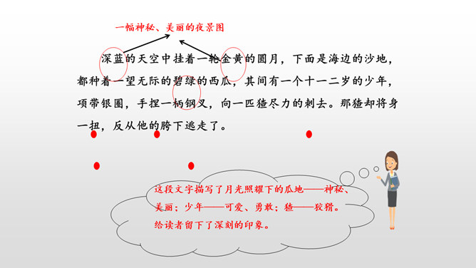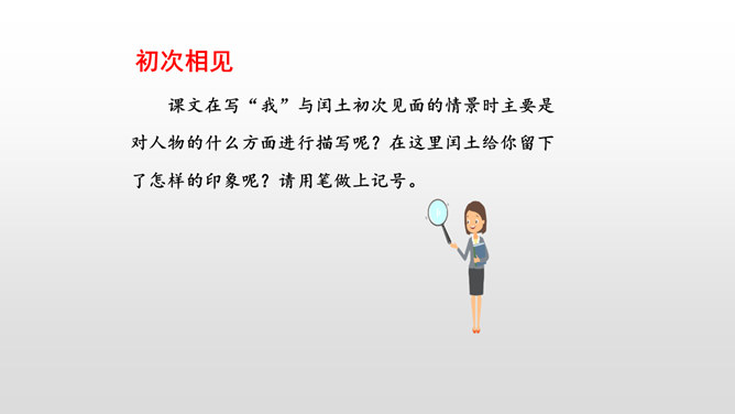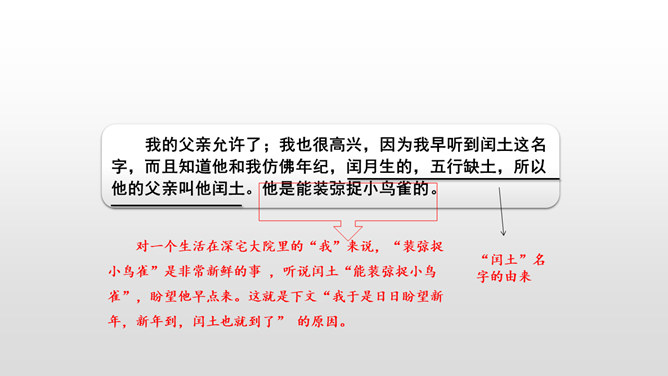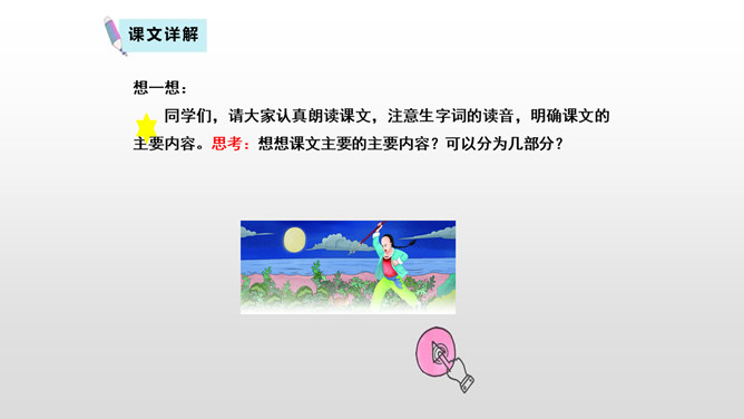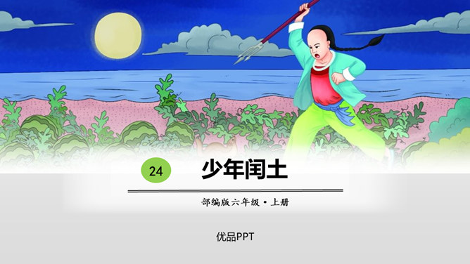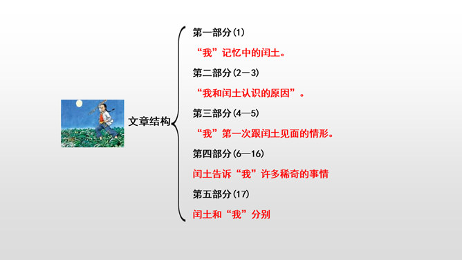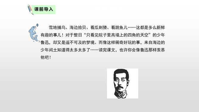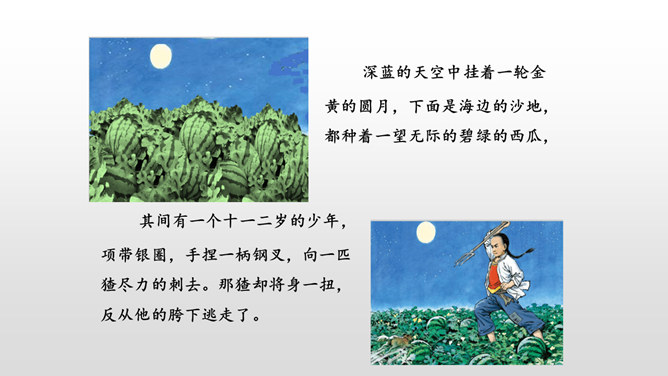 雪地捕鸟、海边拾贝、看瓜刺猹、看跳鱼儿……这都是多么新鲜有趣的事儿!对于整日“只看见院子里高墙上的四角的天空”的少年鲁迅,却又是遥不可及的梦境。而像这样稀奇好玩的事,来自海边的少年闰土知道得太多太多了……读完课文,也许你会像鲁迅那样羡慕他吧!同学们,请大家认真朗读课文,注意生字词的读音,明确课文的主要内容。思考:想想课文主要的主要内容?可以分为几部分?所属专题:少年闰土ppt。