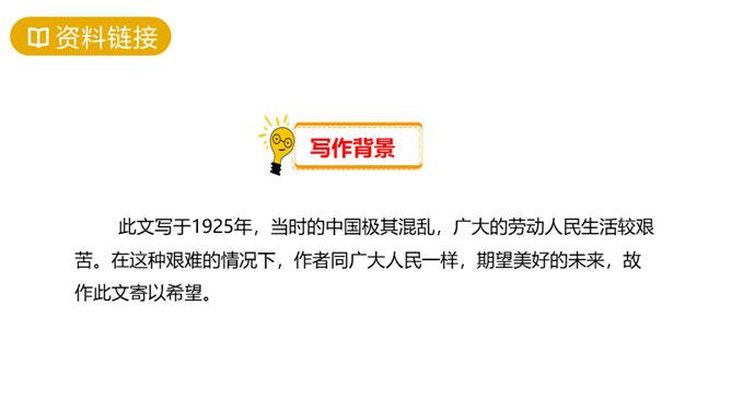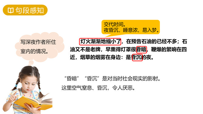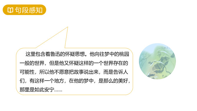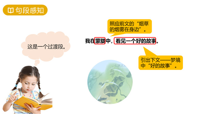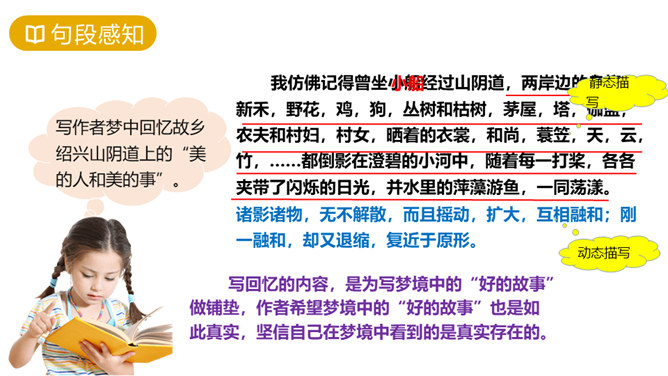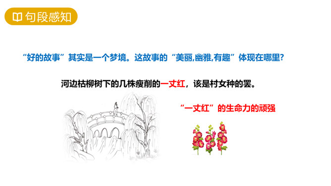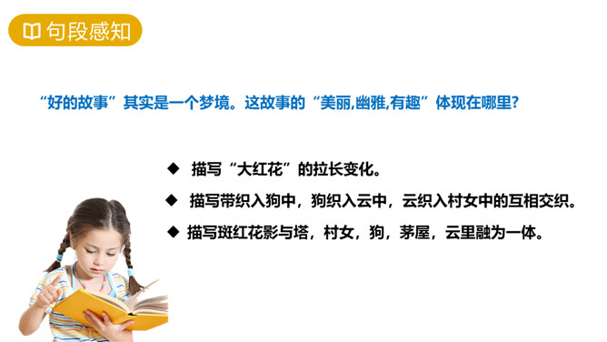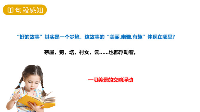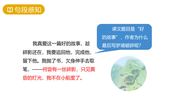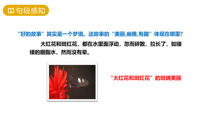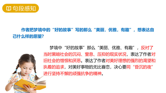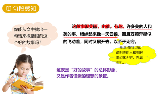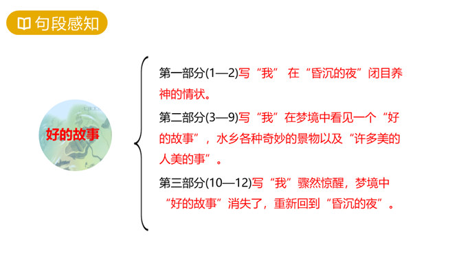 第一部分(1—2)写“我” 在“昏沉的夜”闭目养神的情状。第二部分(3—9)写“我”在梦境中看见一个“好的故事”,水乡各种奇妙的景物以及“许多美的人美的事”。第三部分(10—12)写“我”骤然惊醒,梦境中“好的故事”消失了,重新回到“昏沉的夜”。你能从文中找出一句话来概括眼前这个好的故事吗?用生动的比喻,说明美的人和美的事幻化无穷,充满生机。这既是“好的故事”的总体形象,又是作者憧憬的理想的象征。所属专题:好的故事ppt。