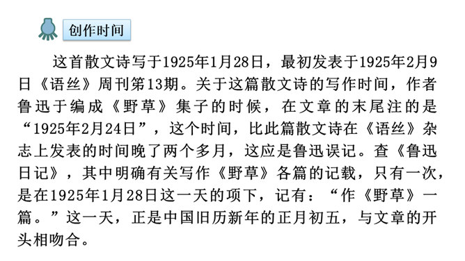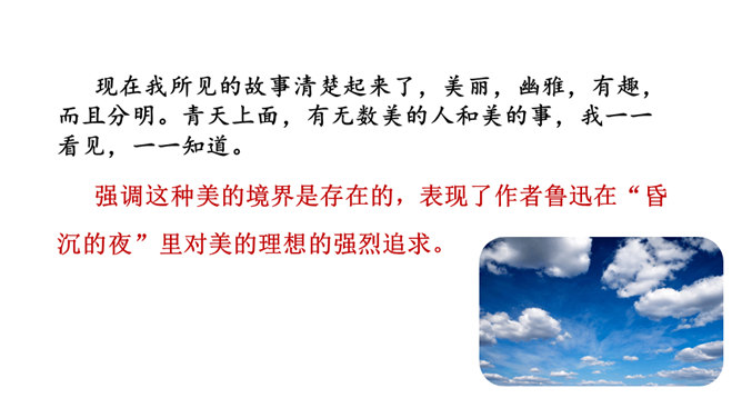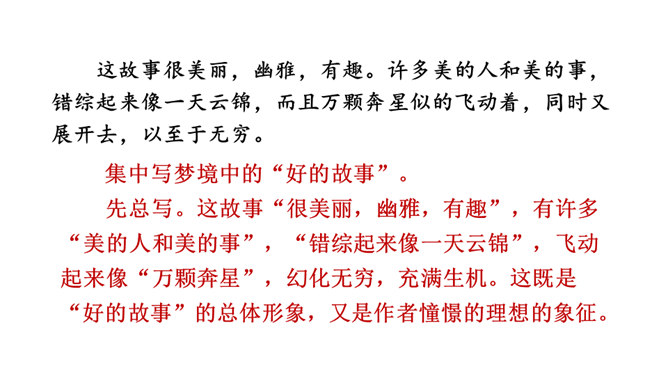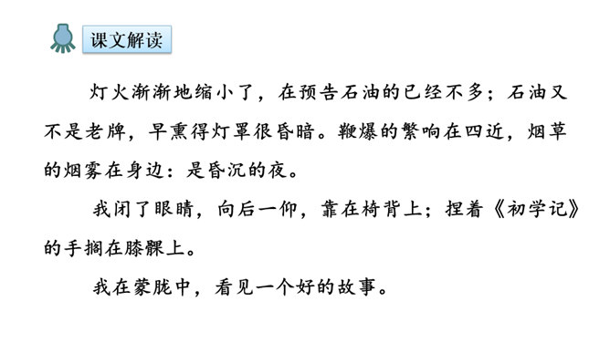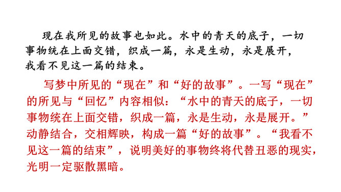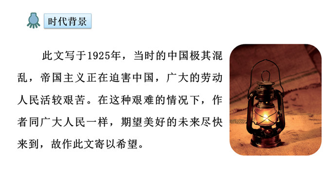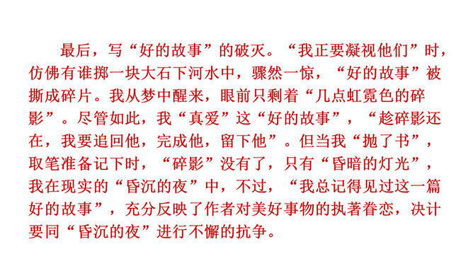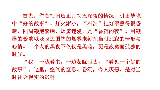 大家都听过许多故事,那么到底什么才是好的故事呢?今天我们继续走进鲁迅先生,看他笔下好的故事究竟是什么故事。首先,作者写旧历正月初五深夜的情况,引出梦境中“好的故事”。灯火渐小,“石油”把灯罩熏得很昏暗,四周鞭炮繁响,烟雾迷漫,是“昏沉的夜”。用鞭爆的繁响以及身边围绕的烟雾来衬托当时孤寂的情形与心情。一个人的黑夜不仅仅是黑暗,更是寂寞而孤独的时光。“我”一边看书,一边蒙眬睡去,“看见一个好的故事”。这里,空气的窒息、昏沉,令人厌恶,是对当时社会现实的影射。所属专题:好的故事ppt。
