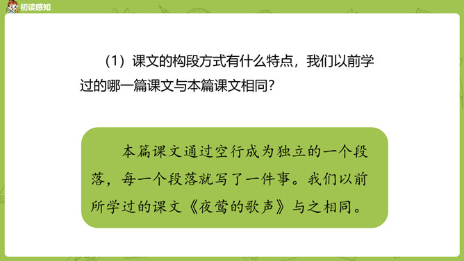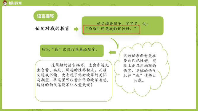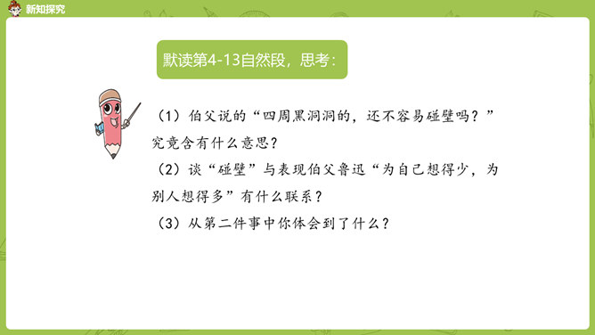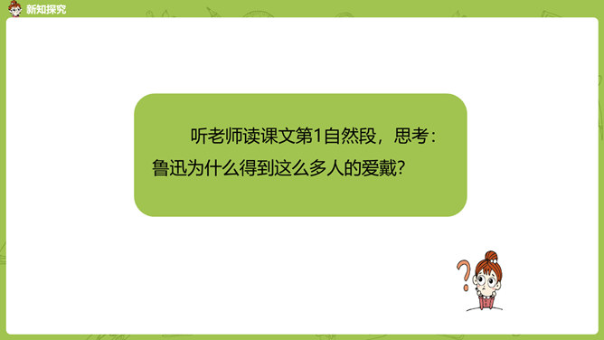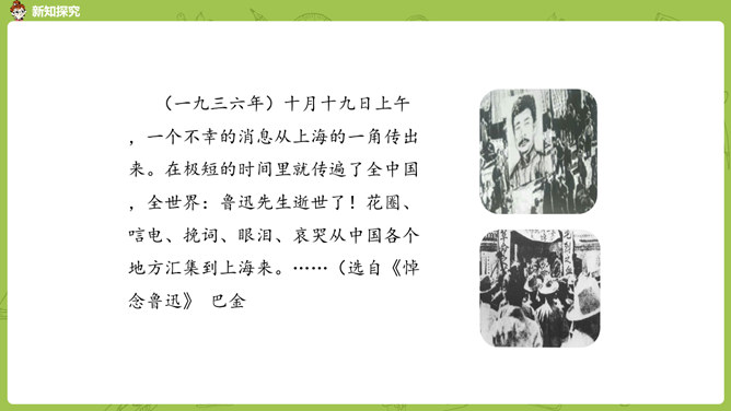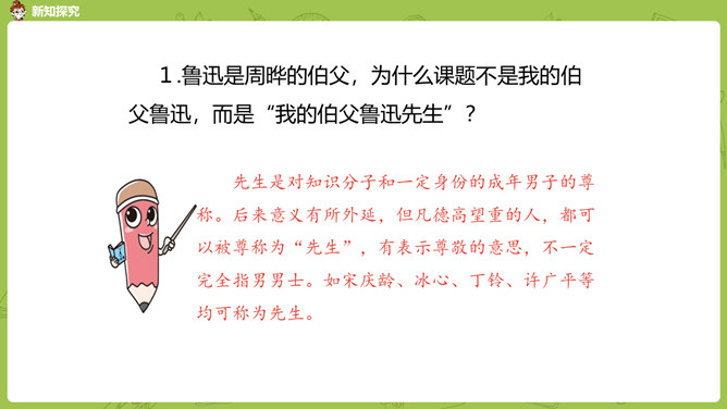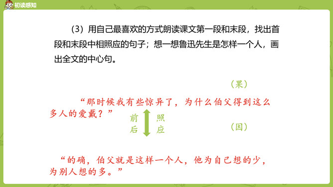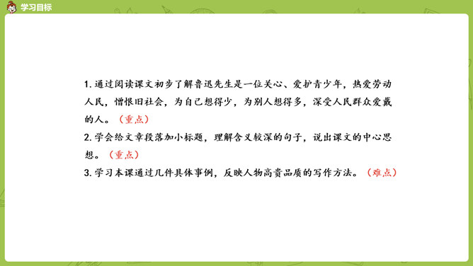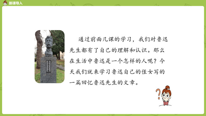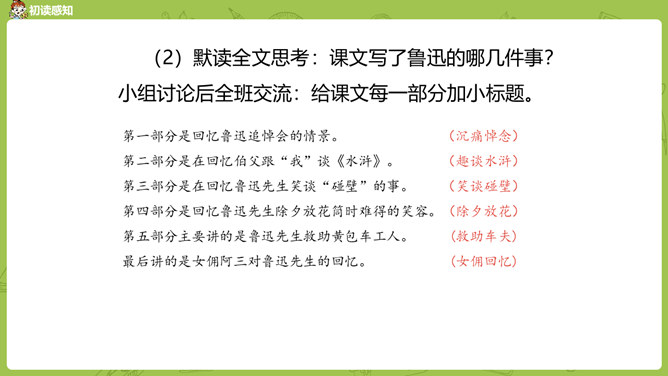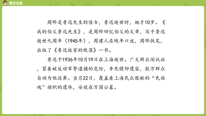 通过前面几课的学习,我们对鲁迅先生都有了自己的理解和认识。那么在生活中鲁迅是一个怎样的人呢?今天我们就来学习鲁迅自己的侄女写的一篇回忆鲁迅先生的文章。1.通过阅读课文初步了解鲁迅先生是一位关心、爱护青少年,热爱劳动人民,憎恨旧社会,为自己想得少,为别人想得多,深受人民群众爱戴的人。2.学会给文章段落加小标题,理解含义较深的句子,说出课文的中心思想。3.学习本课通过几件具体事例,反映人物高贵品质的写作方法。课文的构段方式有什么特点,我们以前学过的哪一篇课文与本篇课文相同?所属专题:我的伯父鲁迅先生ppt。