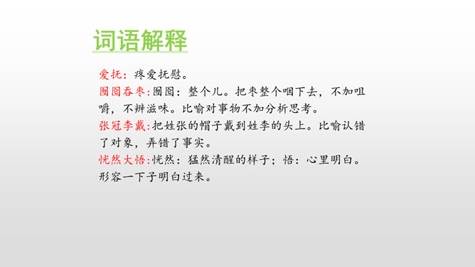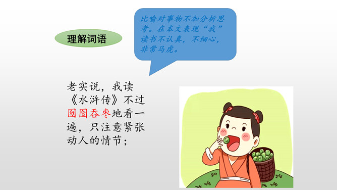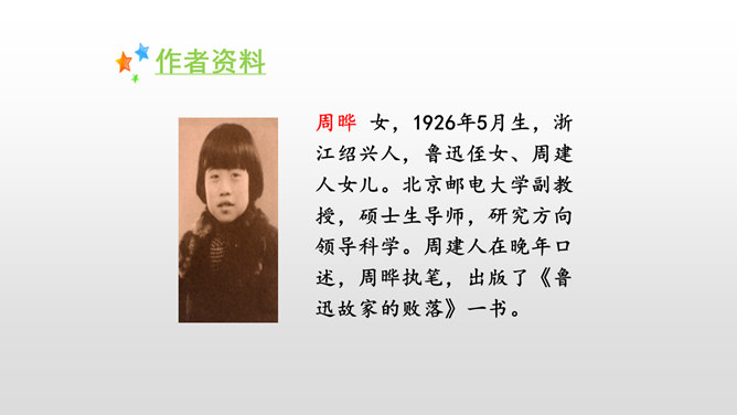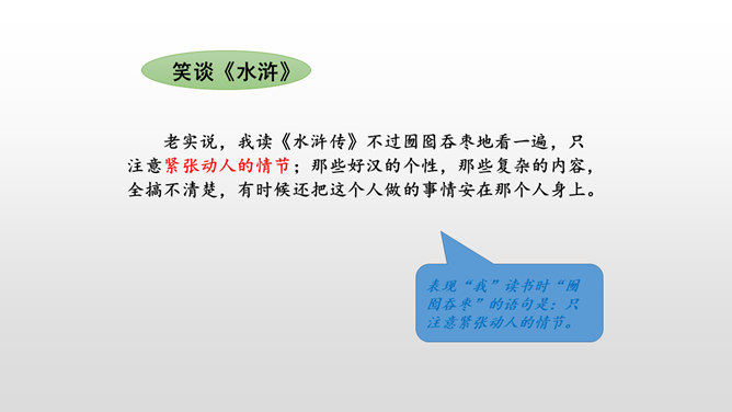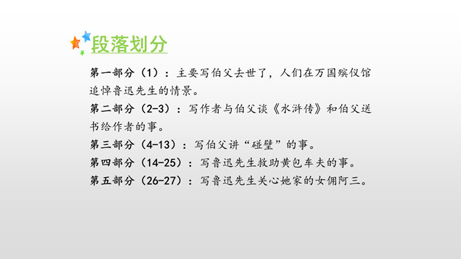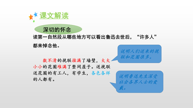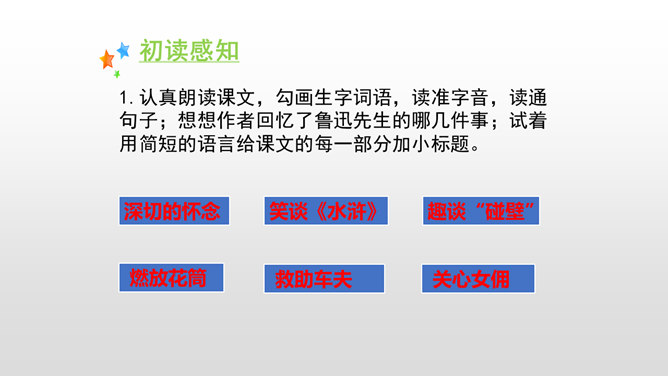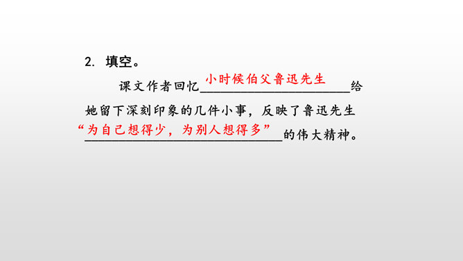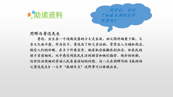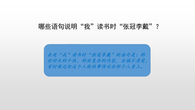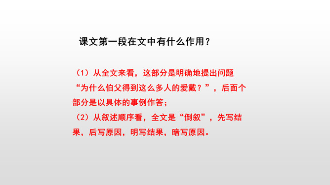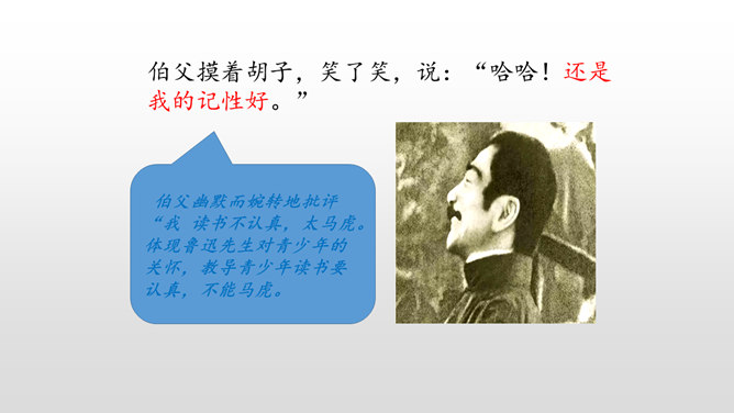 课文第一段在文中有什么作用?(1)从全文来看,这部分是明确地提出问题“为什么伯父得到这么多人的爱戴?”,后面个部分是以具体的事例作答;(2)从叙述顺序看,全文是“倒叙”,先写结果,后写原因,明写结果,暗写原因。哪些语句说明“我”读书时“张冠李戴”?表现“我”读书时“张冠李戴”的语句是:那些好汉的个性,那些复杂的内容,全搞不清楚,有时候还把这个人做的事情安在那个人身上。所属专题:我的伯父鲁迅先生ppt。