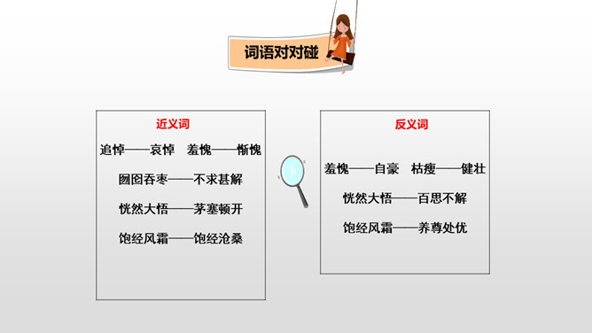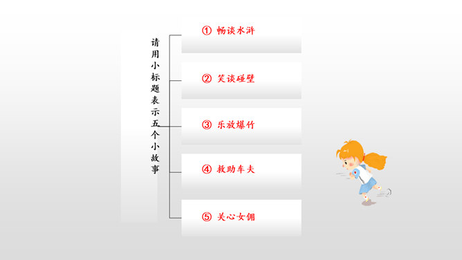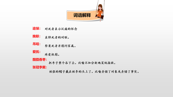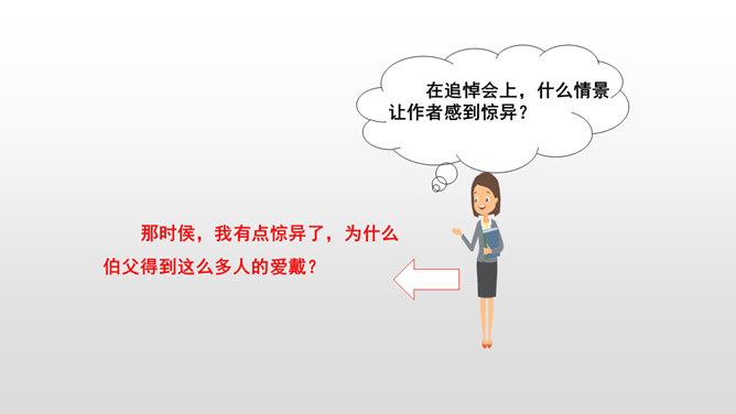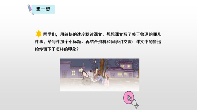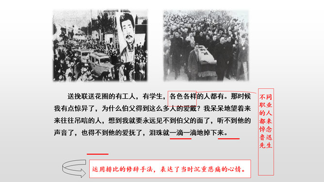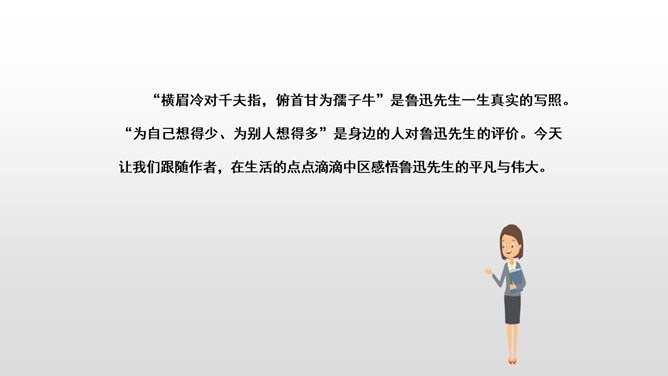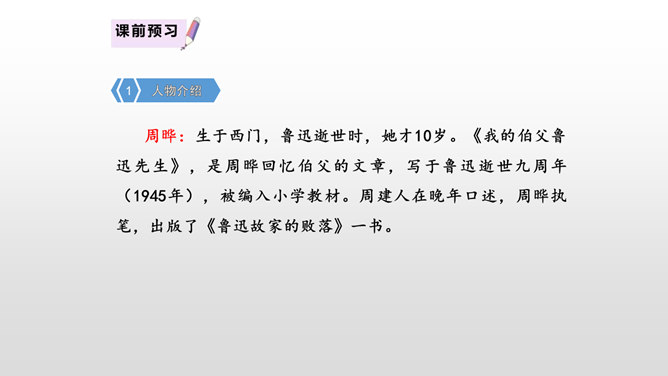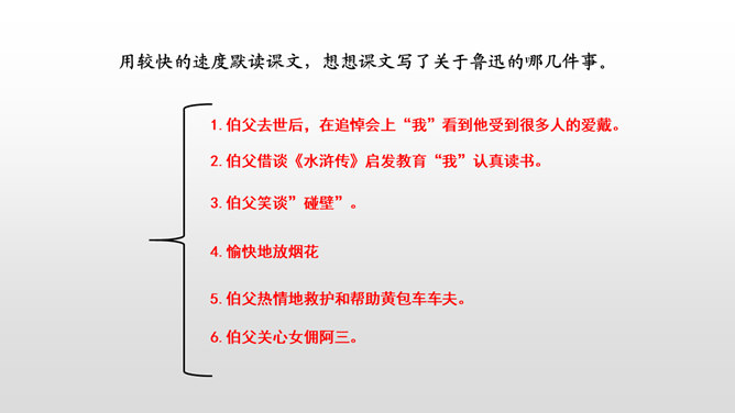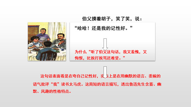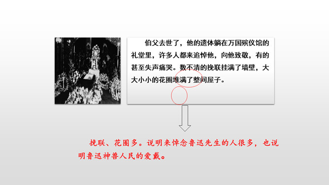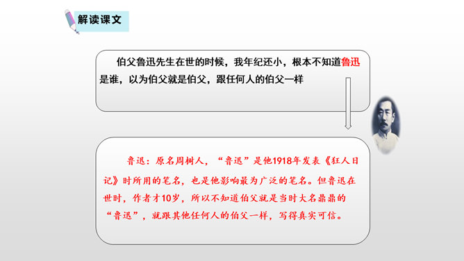 文章以空行为标准,把文章分为六层。课文中间的空行,是一种段落的标志,说明这种段落之间思想内容是紧密联系的,但又有一定的独立性,这样便于读者理解。在一些较长的文章中常常出现这种形式。挽联、花圈多。说明来悼念鲁迅先生的人很多,也说明鲁迅神兽人民的爱戴。这句话表面看是在夸自己记性好,实际上是在用幽默的语言、委婉的语气批评“我”读书太马虎。这简短的语言描写,透出鲁迅先生含蓄、幽默、风趣的性格特点。所属专题:我的伯父鲁迅先生ppt。