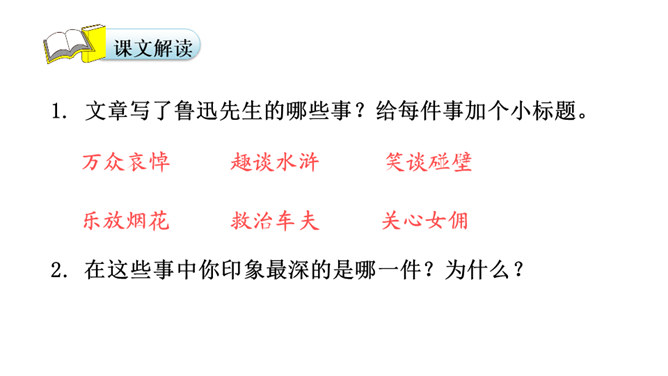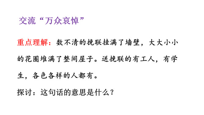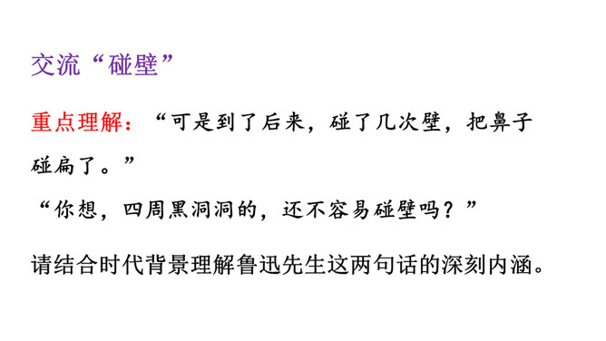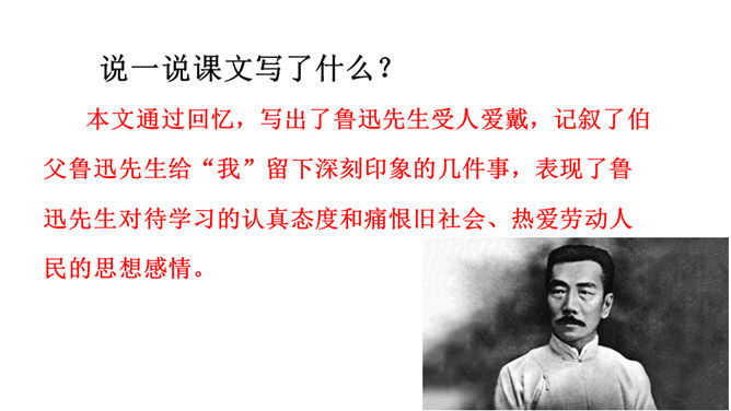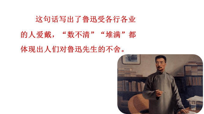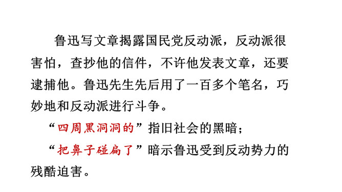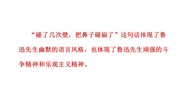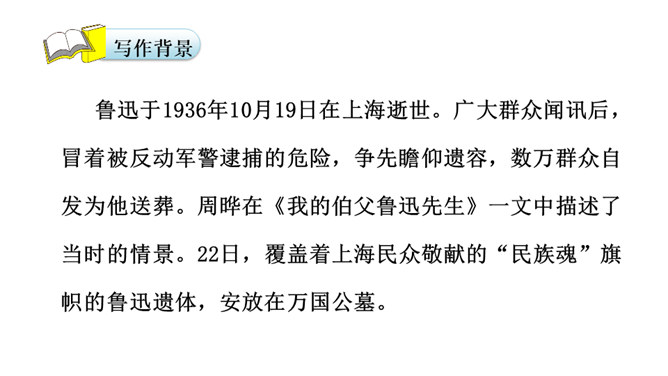 鲁迅于1936年10月19日在上海逝世。广大群众闻讯后,冒着被反动军警逮捕的危险,争先瞻仰遗容,数万群众自发为他送葬。周晔在《我的伯父鲁迅先生》一文中描述了当时的情景。22日,覆盖着上海民众敬献的“民族魂”旗帜的鲁迅遗体,安放在万国公墓。 “碰了几次壁,把鼻子碰扁了”这句话体现了鲁迅先生幽默的语言风格,也体现了鲁迅先生顽强的斗争精神和乐观主义精神。段描写突出了鲁迅先生的慈祥乐观,因为鲁迅先生对于亲人发自内心的爱,所以才会有这样的表情。所属专题:我的伯父鲁迅先生ppt。