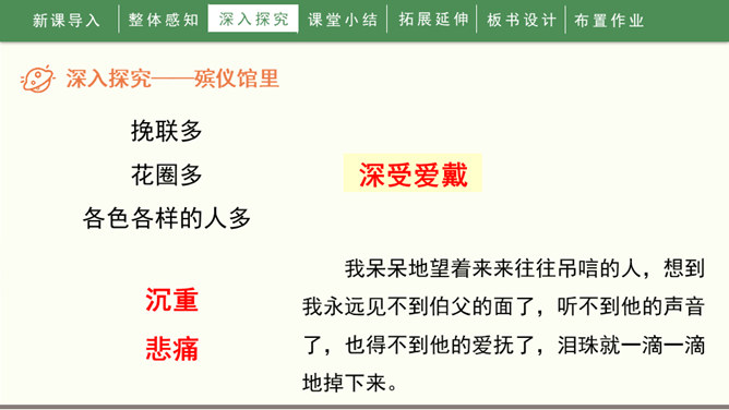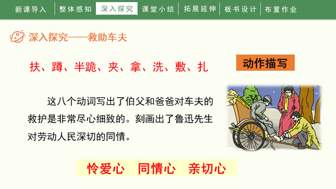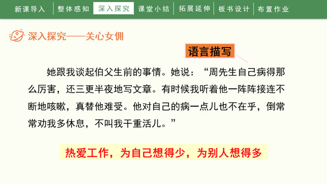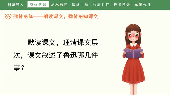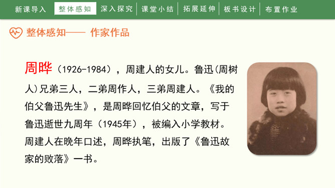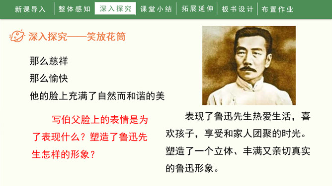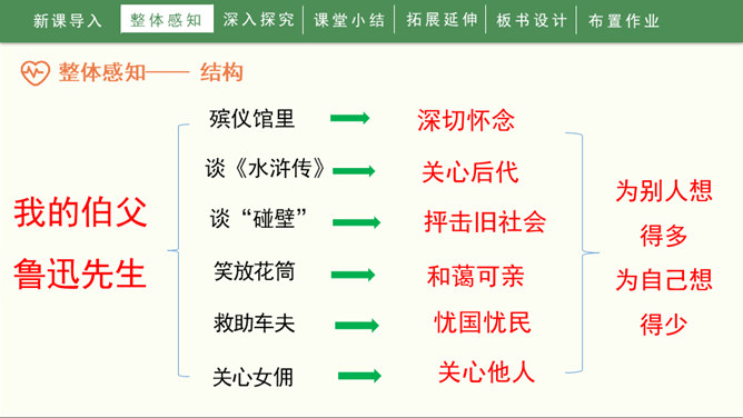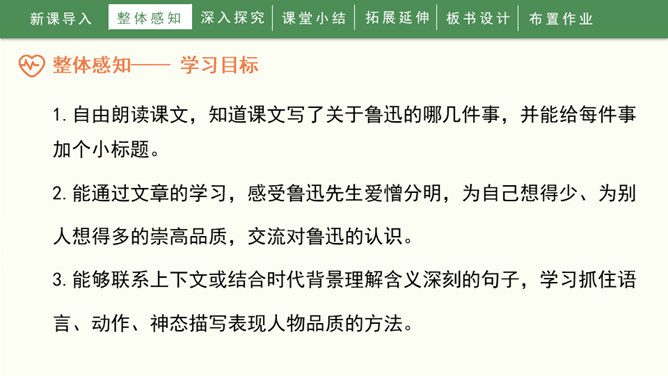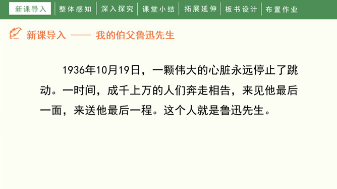 1936年10月19日,一颗伟大的心脏永远停止了跳动。一时间,成千上万的人们奔走相告,来见他最后一面,来送他最后一程。这个人就是鲁迅先生。1.自由朗读课文,知道课文写了关于鲁迅的哪几件事,并能给每件事加个小标题。2.能通过文章的学习,感受鲁迅先生爱憎分明,为自己想得少、为别人想得多的崇高品质,交流对鲁迅的认识。3.能够联系上下文或结合时代背景理解含义深刻的句子,学习抓住语言、动作、神态描写表现人物品质的方法。所属专题:我的伯父鲁迅先生ppt。