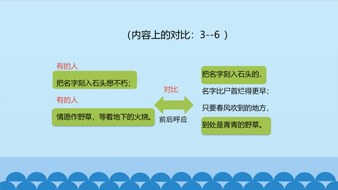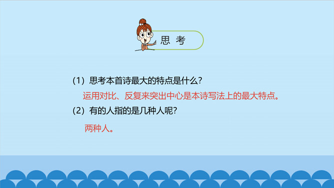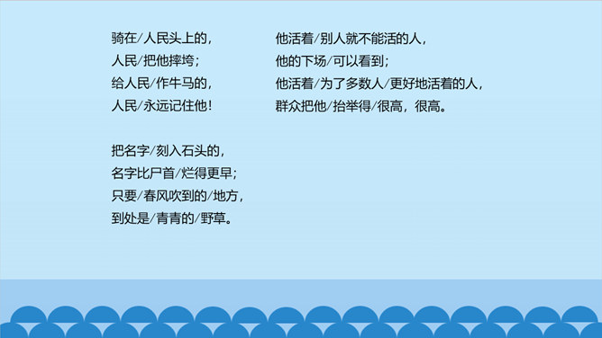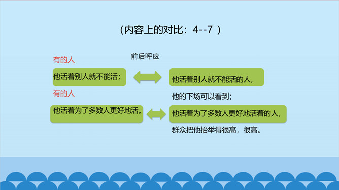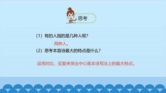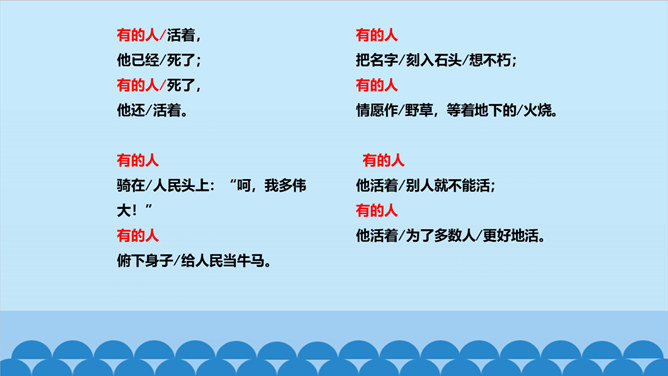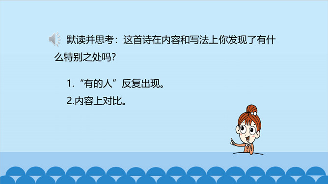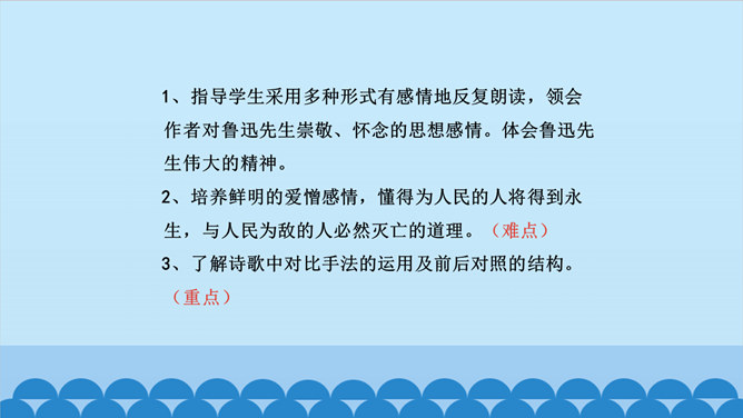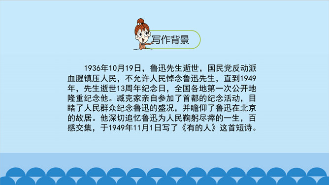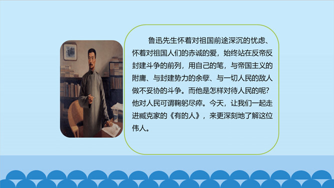 鲁迅先生怀着对祖国前途深沉的忧虑、怀着对祖国人们的赤诚的爱,始终站在反帝反封建斗争的前列,用自己的笔,与帝国主义的附庸、与封建势力的余孽、与一切人民的敌人做不妥协的斗争。而他是怎样对待人民的呢?他对人民可谓鞠躬尽瘁。今天,让我们一起走进臧克家的《有的人》,来更深刻地了解这位伟人。指导学生采用多种形式有感情地反复朗读,领会作者对鲁迅先生崇敬、怀念的思想感情。体会鲁迅先生伟大的精神。培养鲜明的爱憎感情,懂得为人民的人将得到永生,与人民为敌的人必然灭亡的道理。了解诗歌中对比手法的运用及前后对照的结构。所属专题:有的人—纪念鲁迅有感ppt。