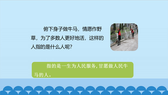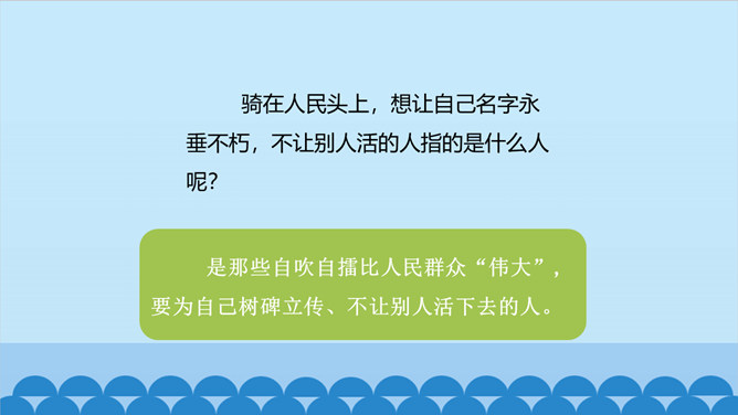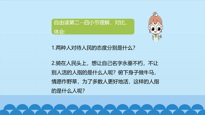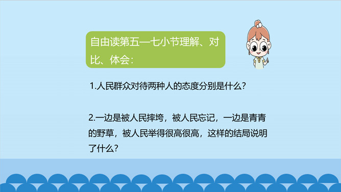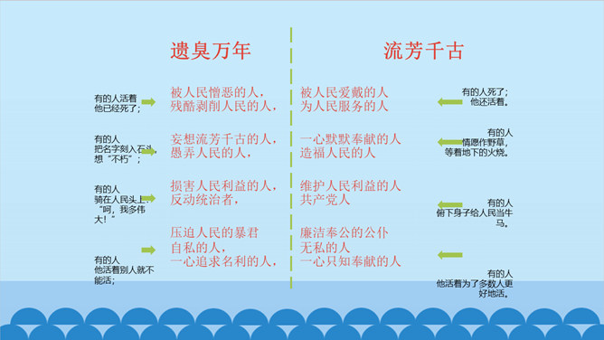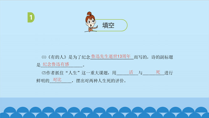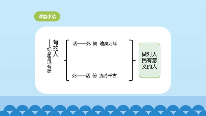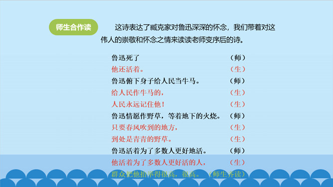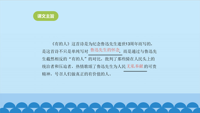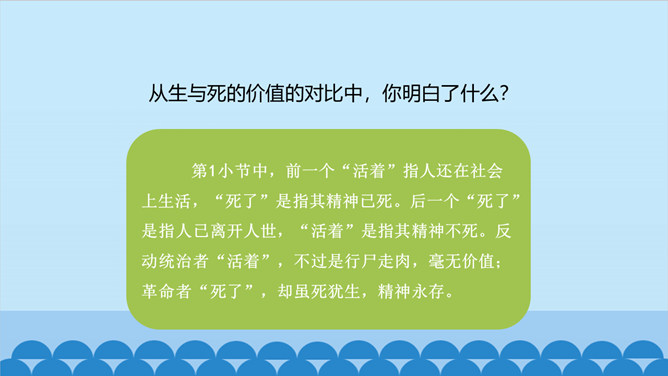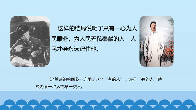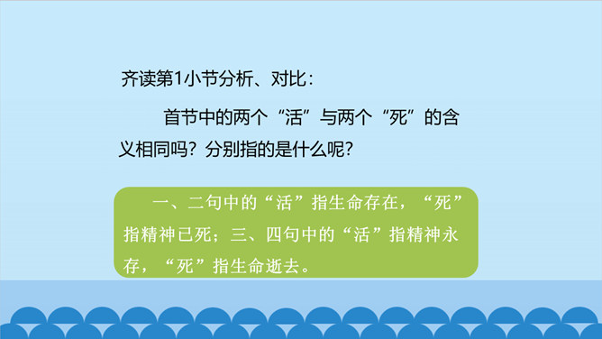 上一节课我们了解了课文的结构特点,今天让我们走进诗歌,感悟诗歌要表达一种怎样的思想感情呢?齐读第1小节分析、对比:首节中的两个“活”与两个“死”的含义相同吗?分别指的是什么呢? 一、二句中的“活”指生命存在,“死”指精神已死;三、四句中的“活”指精神永存,“死”指生命逝去。从生与死的价值的对比中,你明白了什么?第1小节中,前一个“活着”指人还在社会上生活,“死了”是指其精神已死。后一个“死了”是指人已离开人世,“活着”是指其精神不死。反动统治者“活着”,不过是行尸走肉,毫无价值。所属专题:有的人—纪念鲁迅有感ppt。