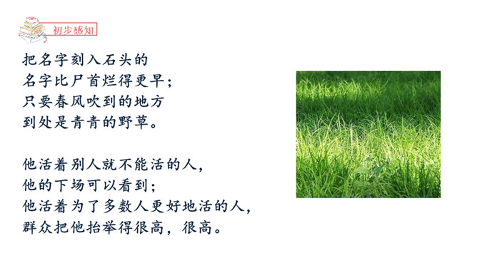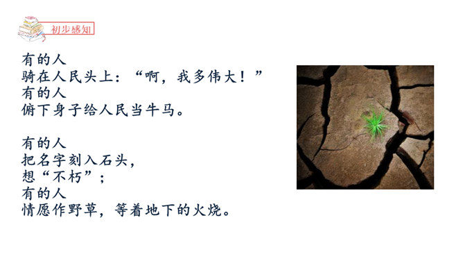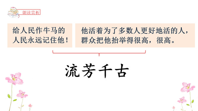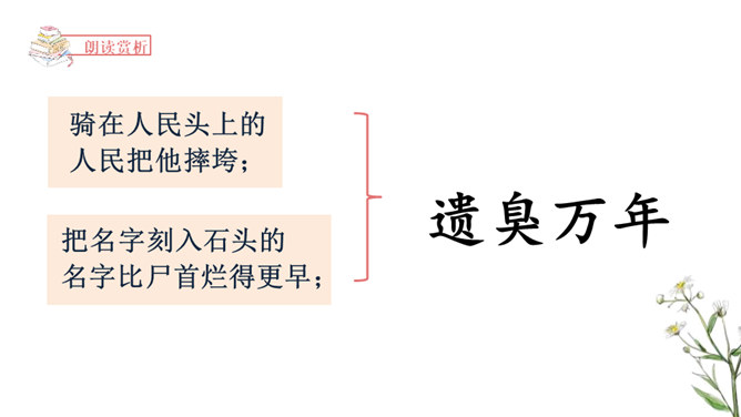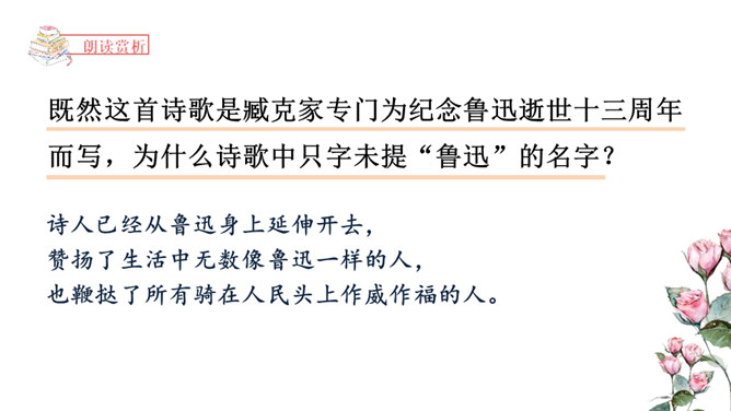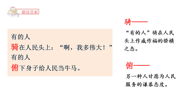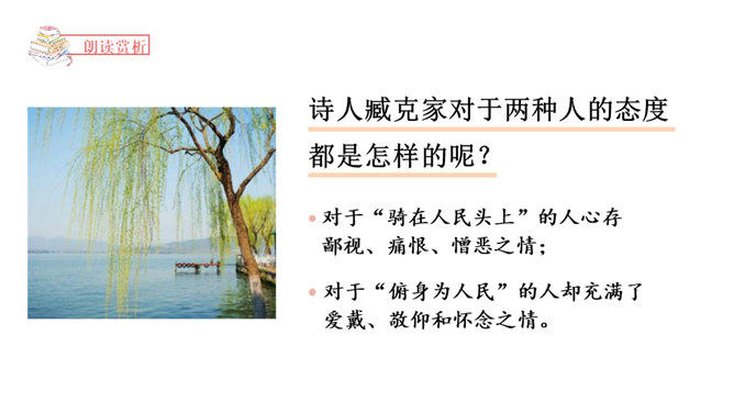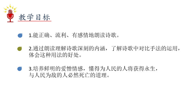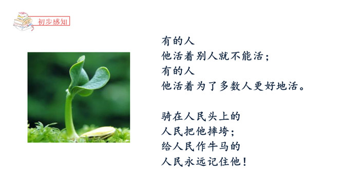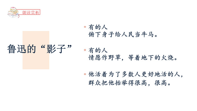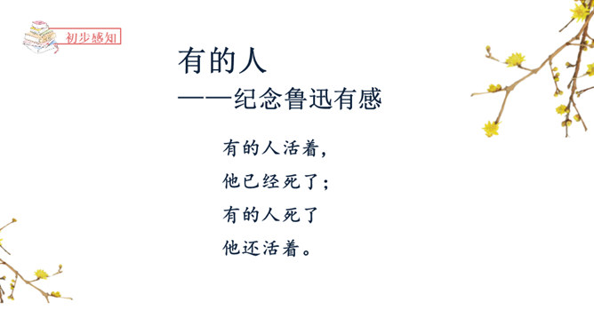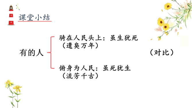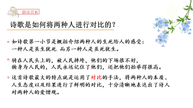 诗歌是如何将两种人进行对比的?如诗歌第一小节是概括介绍两种人的生死给人的感受:一种人是虽生犹死 而另一种人是虽死犹生。骑在人民头上的,被人民摔垮,他们的下场很不好,俯身为人民的,人民永远记住了他们,还把他们抬举得很高。这首诗歌最大的特点就是运用了对比的手法,将两种人的本质、人生态度以及结果进行了鲜明的对比,十分清晰地表达出了诗人对两种人的爱憎观。所属专题:有的人—纪念鲁迅有感ppt。
