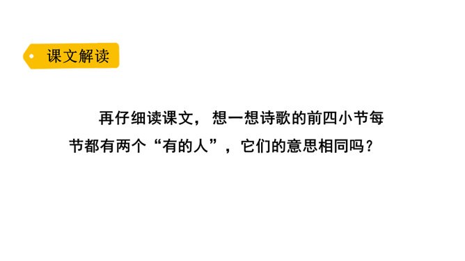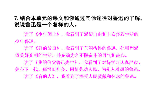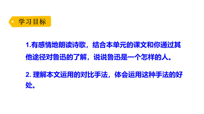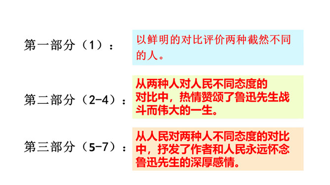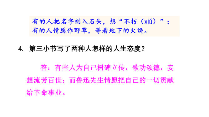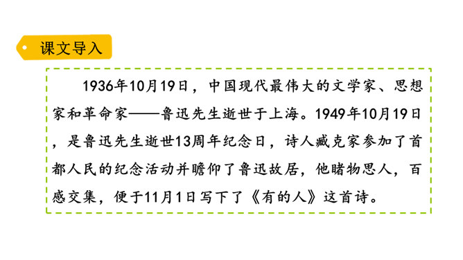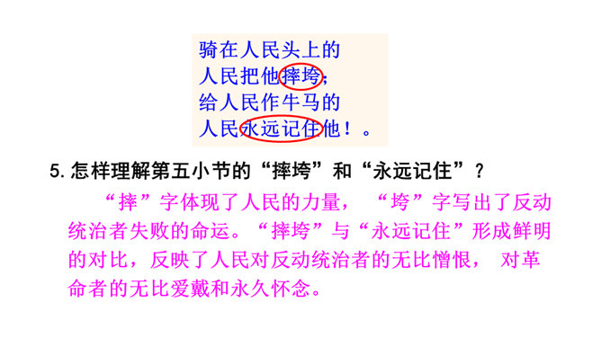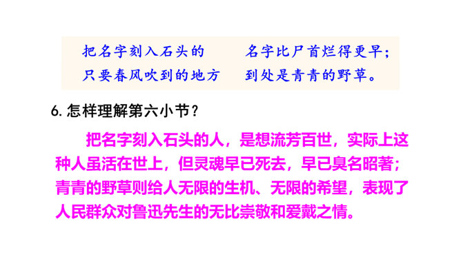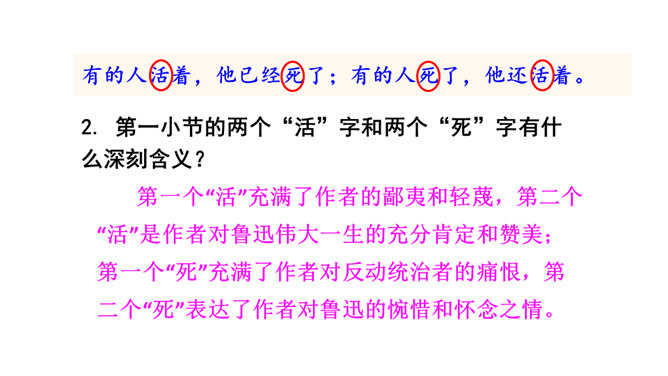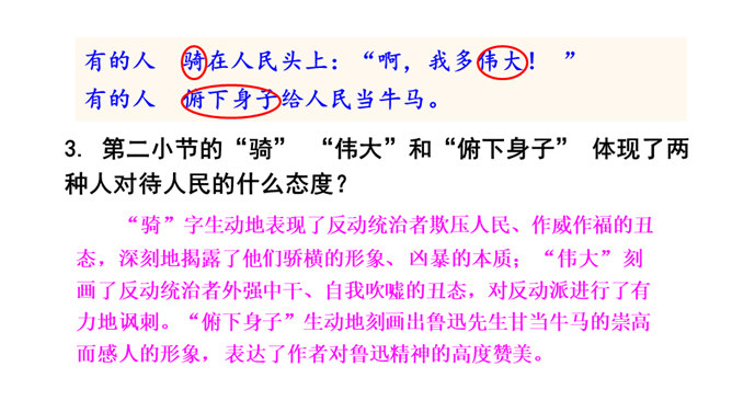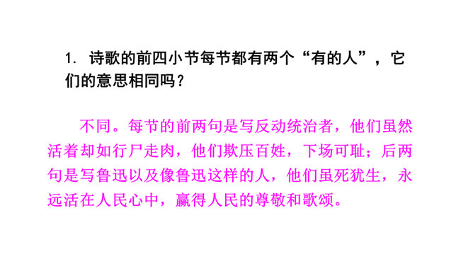 诗歌的前四小节每节都有两个“有的人”,它们的意思相同吗?不同。每节的前两句是写反动统治者,他们虽然活着却如行尸走肉,他们欺压百姓,下场可耻;后两句是写鲁迅以及像鲁迅这样的人,他们虽死犹生,永远活在人民心中,赢得人民的尊敬和歌颂。第二小节的“骑” “伟大”和“俯下身子” 体现了两种人对待人民的什么态度?“骑”字生动地表现了反动统治者欺压人民、作威作福的丑态,深刻地揭露了他们骄横的形象、 凶暴的本质; “伟大” 刻画了反动统治者外强中干、自我吹嘘的丑态,对反动派进行了有力地讽刺。所属专题:有的人—纪念鲁迅有感ppt。